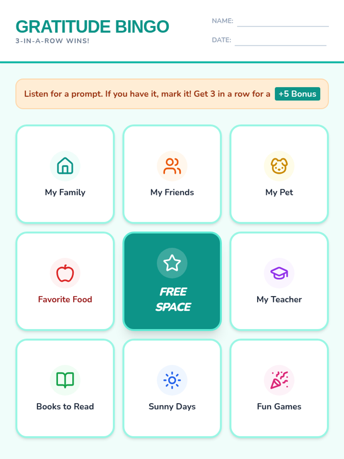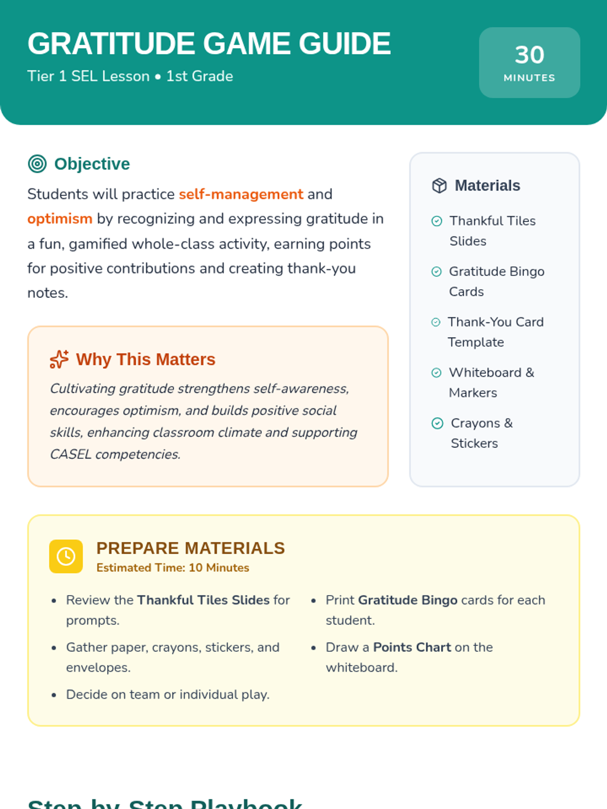 A 30-minute Tier 1 SEL lesson for 1st graders that builds self-management and optimism through a gamified gratitude experience. Students earn points, play bingo, and create heartfelt thank-you notes to foster a positive classroom climate.