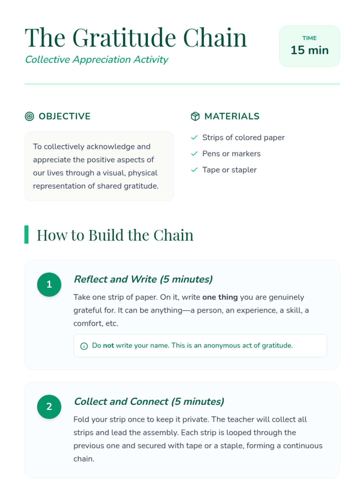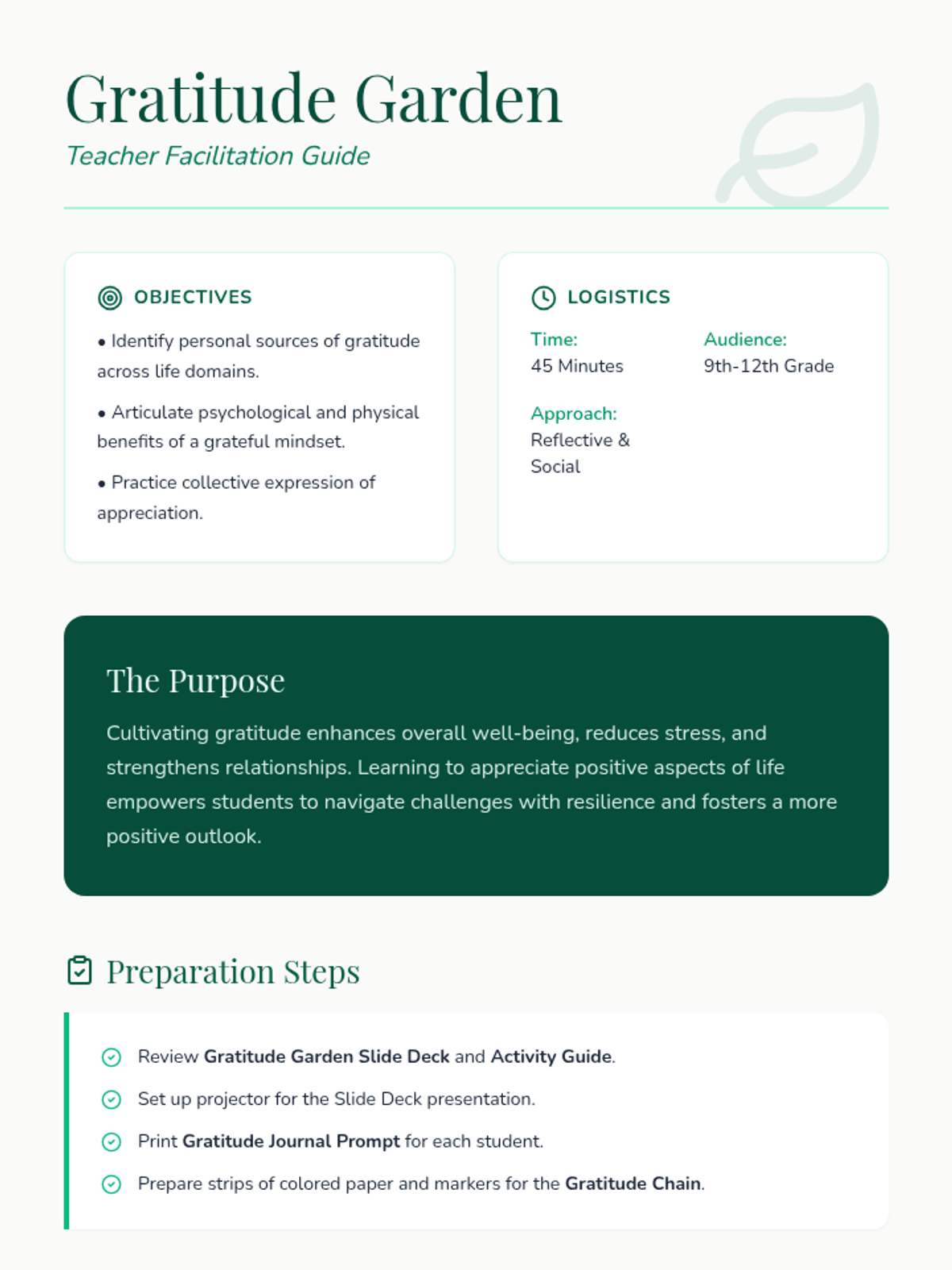 A 45-minute social-emotional learning lesson for high schoolers focused on recognizing personal sources of gratitude, understanding its psychological benefits, and participating in a collaborative appreciation activity.