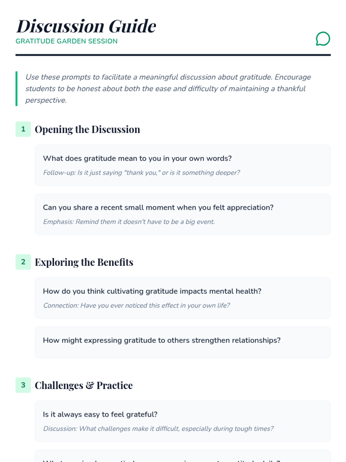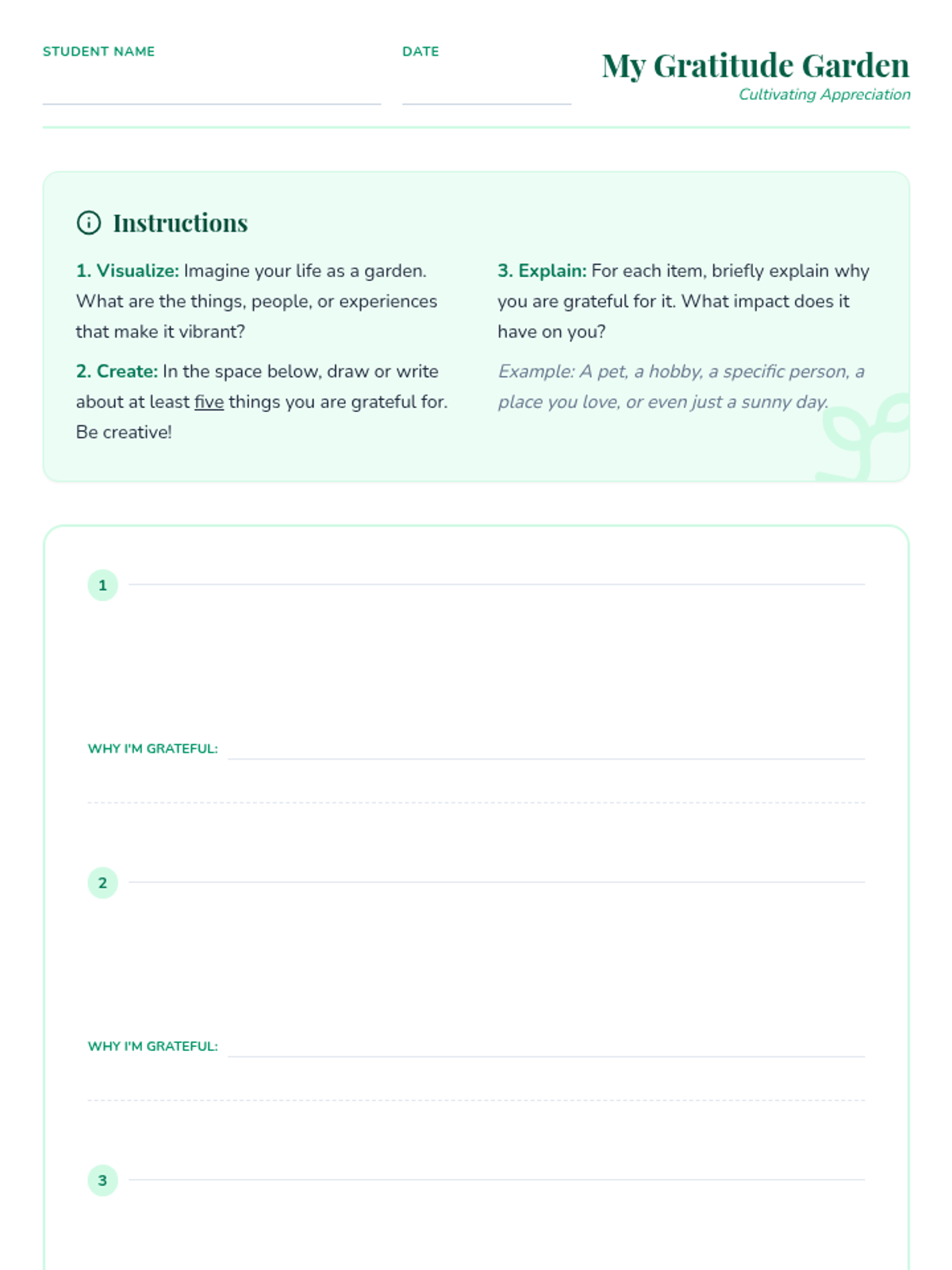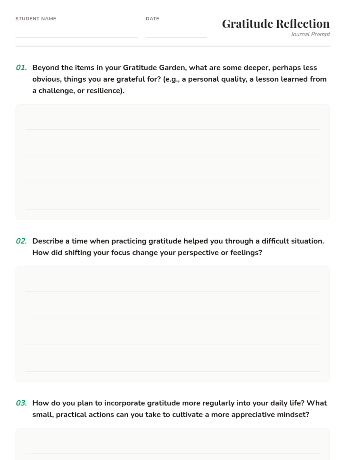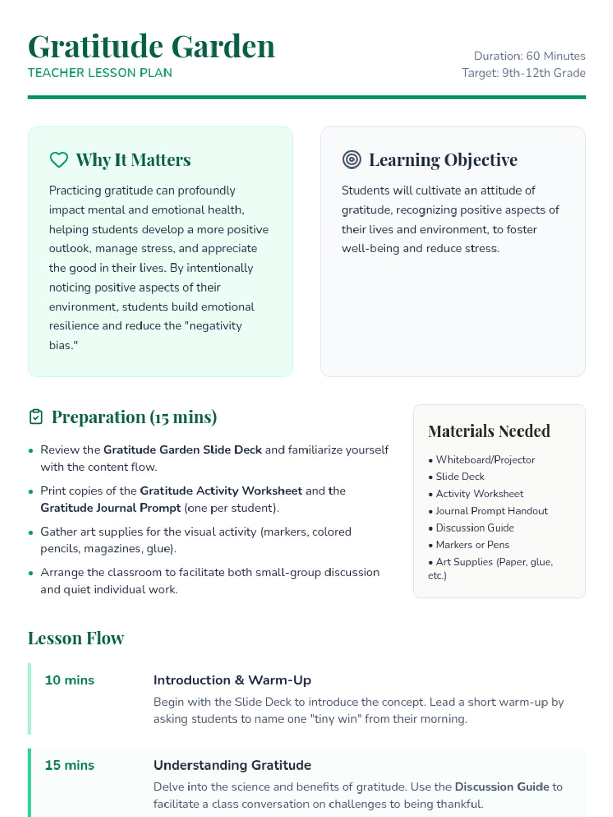 A 60-minute session for high schoolers to cultivate gratitude through guided reflection, interactive sharing, and creative visual expression, aiming to boost well-being and reduce stress.