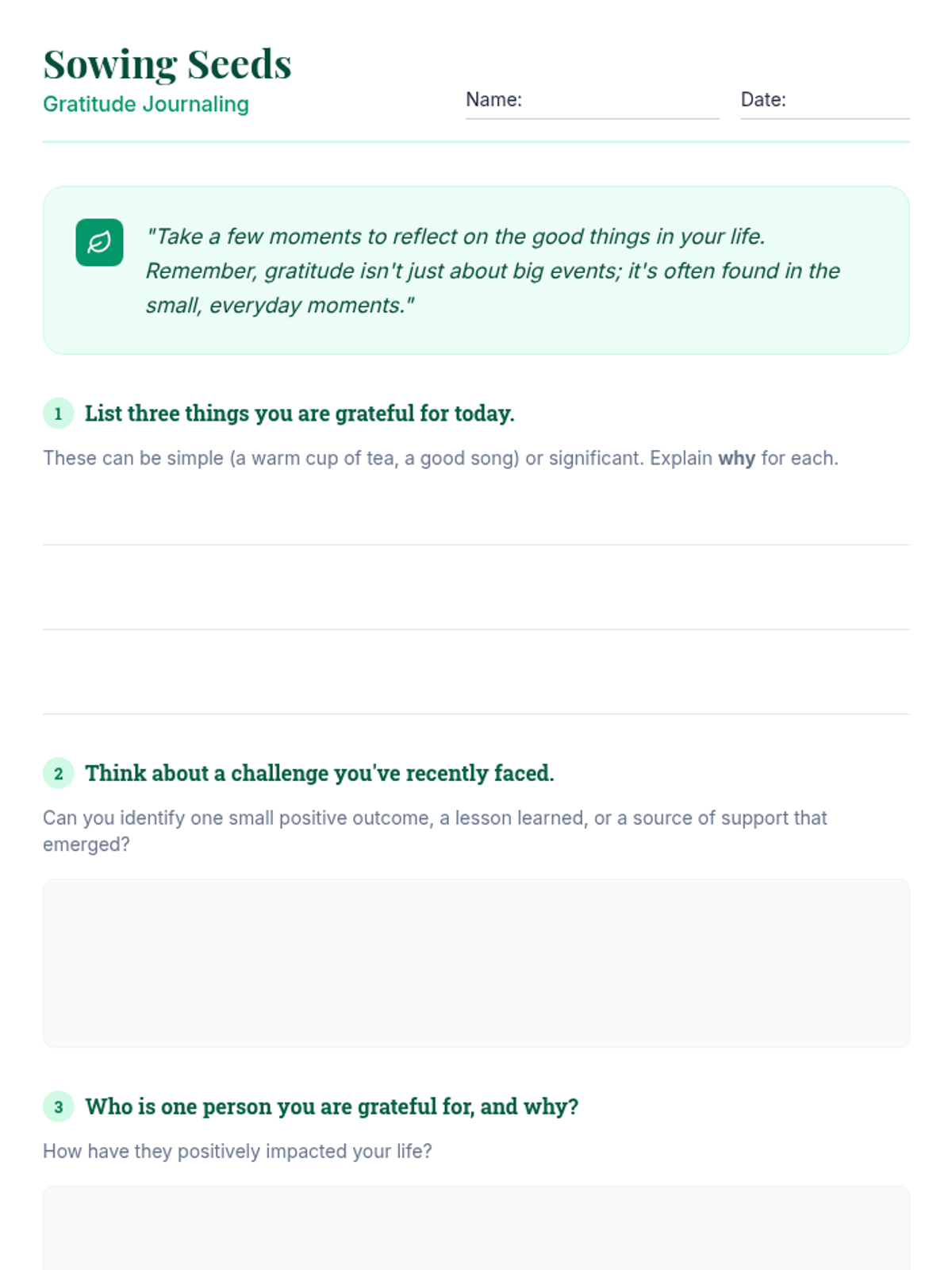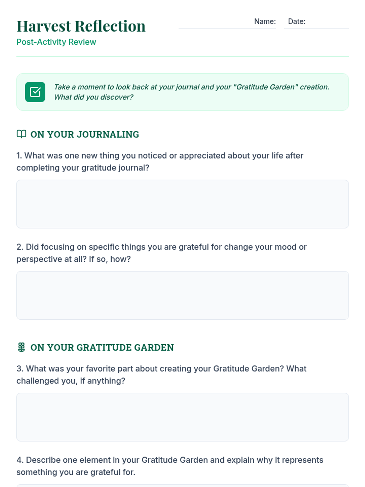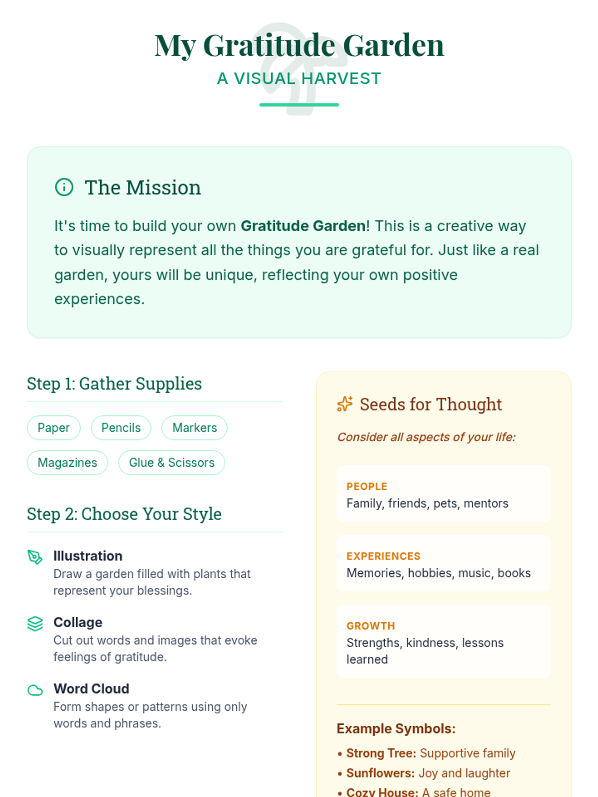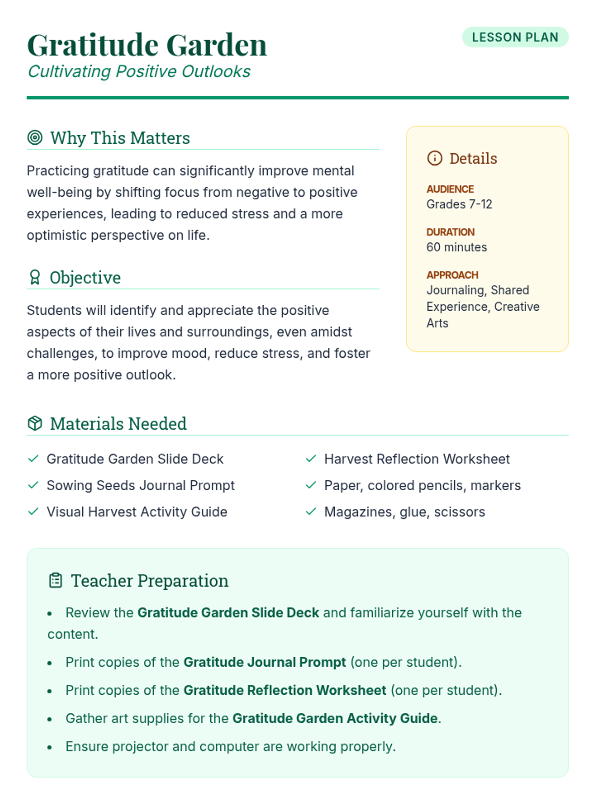 A 60-minute lesson for grades 7-12 that introduces the practice of gratitude through journaling and a creative 'gratitude garden' activity to improve mood and reduce stress.