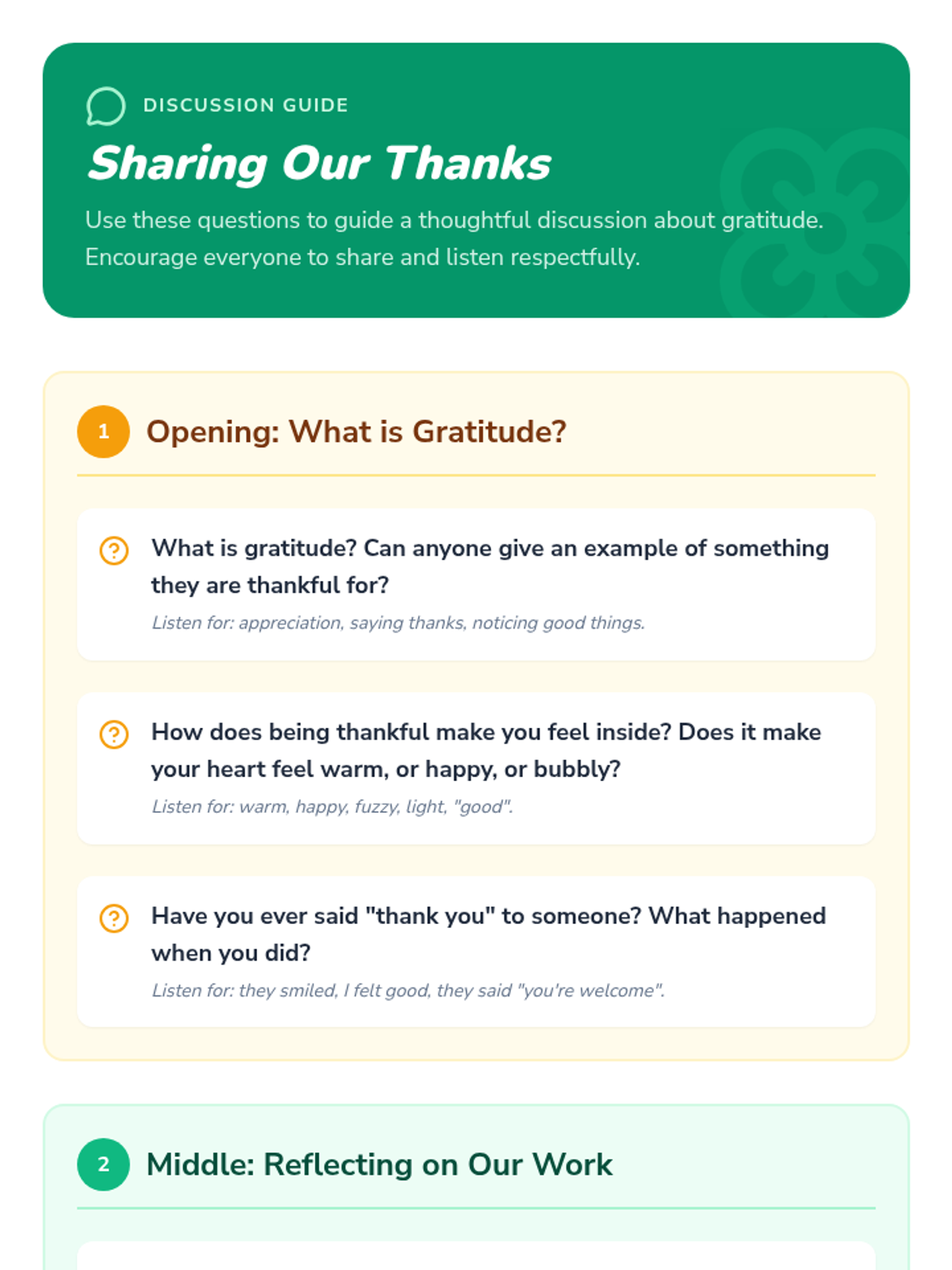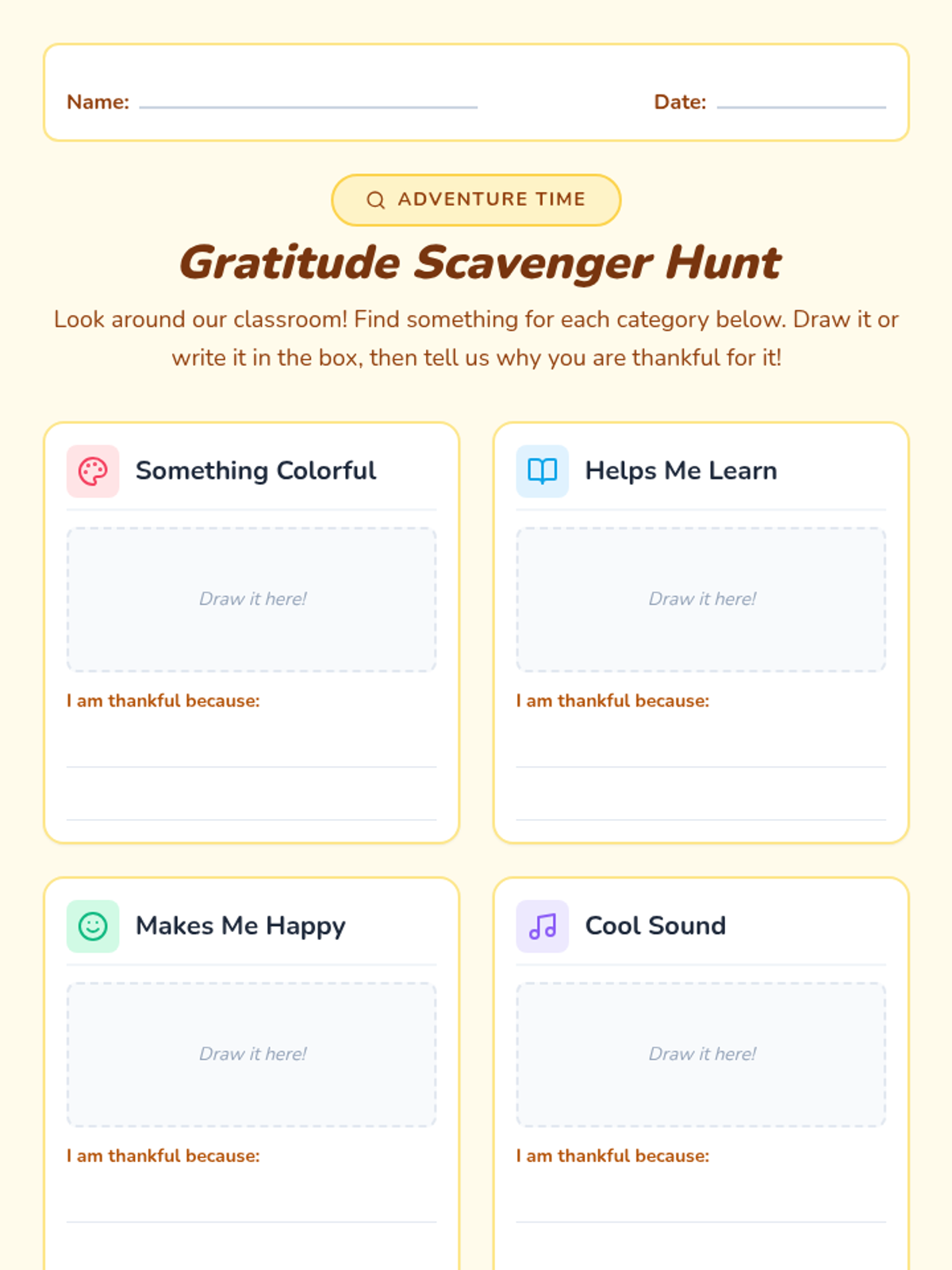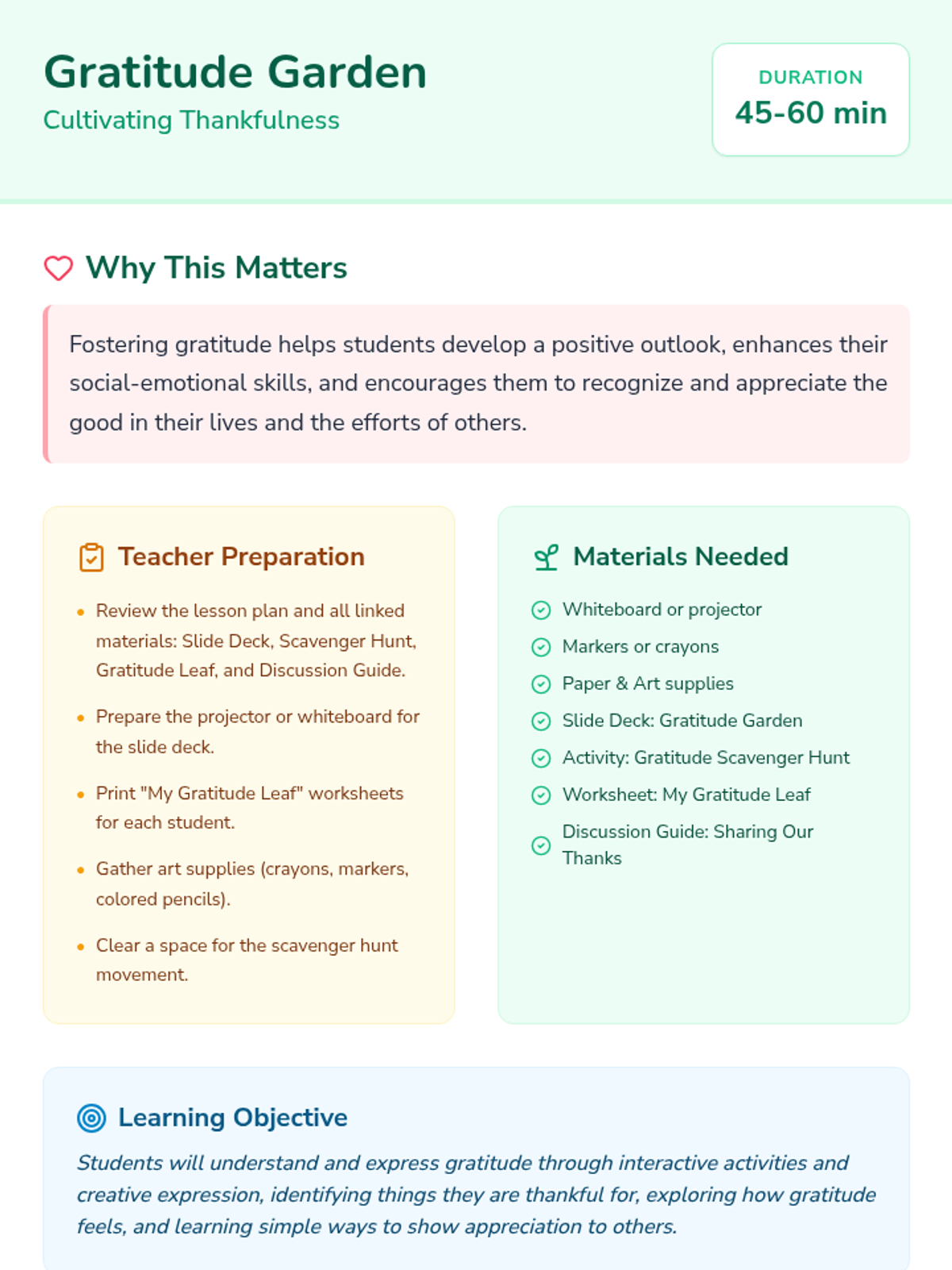A social-emotional learning lesson for K-3 students focusing on identifying and expressing gratitude through interactive activities and creative expression. Students will explore the physical feelings of thankfulness and learn practical ways to show appreciation to others.