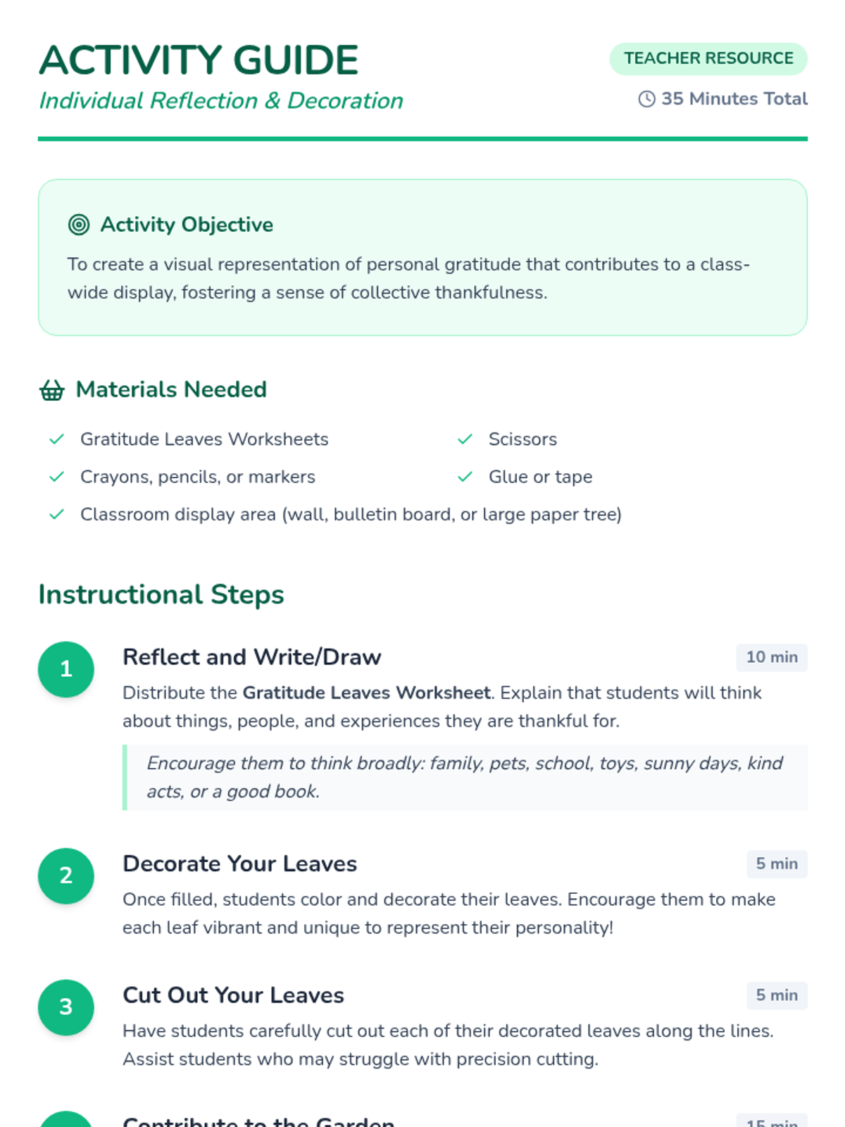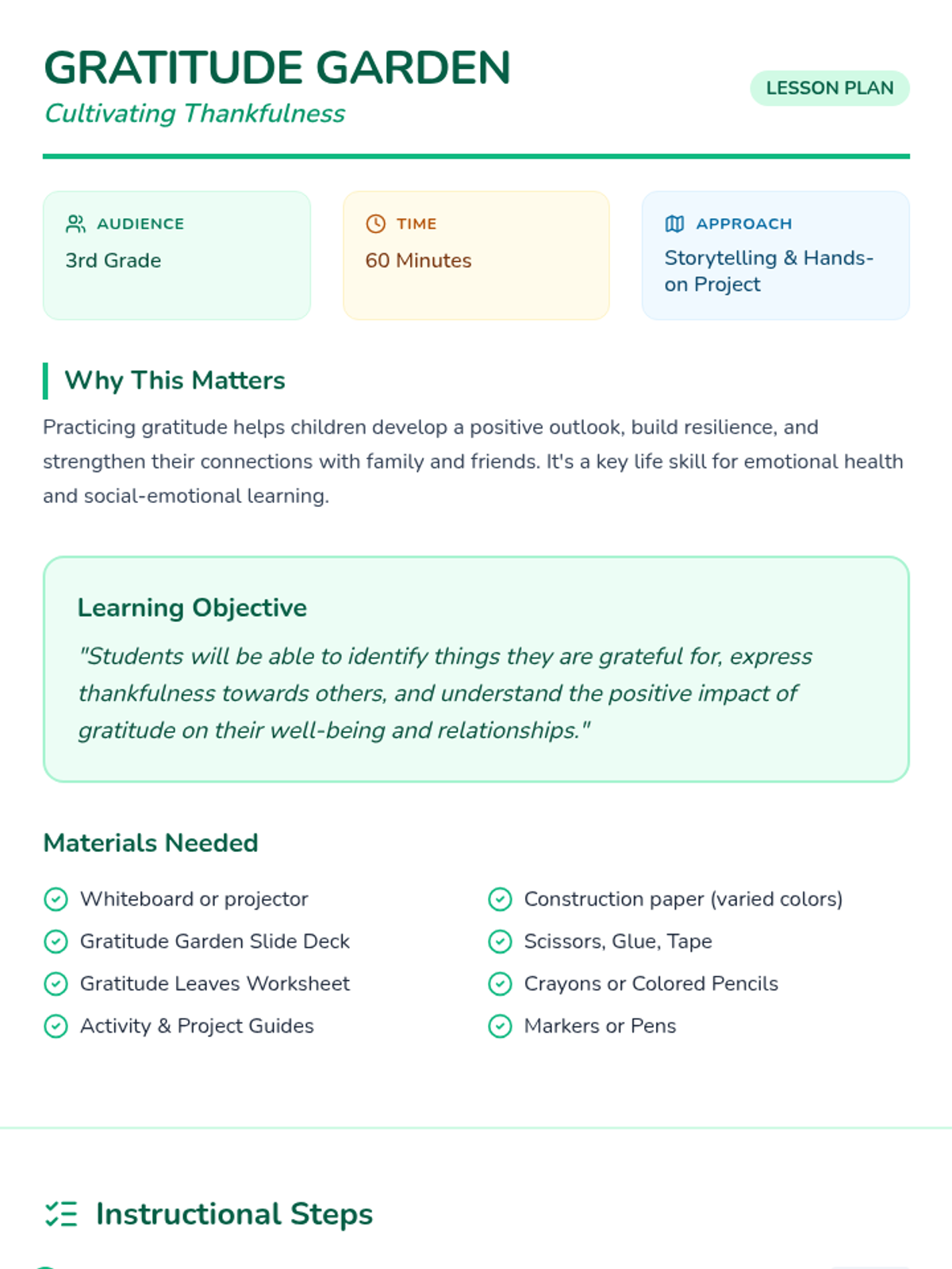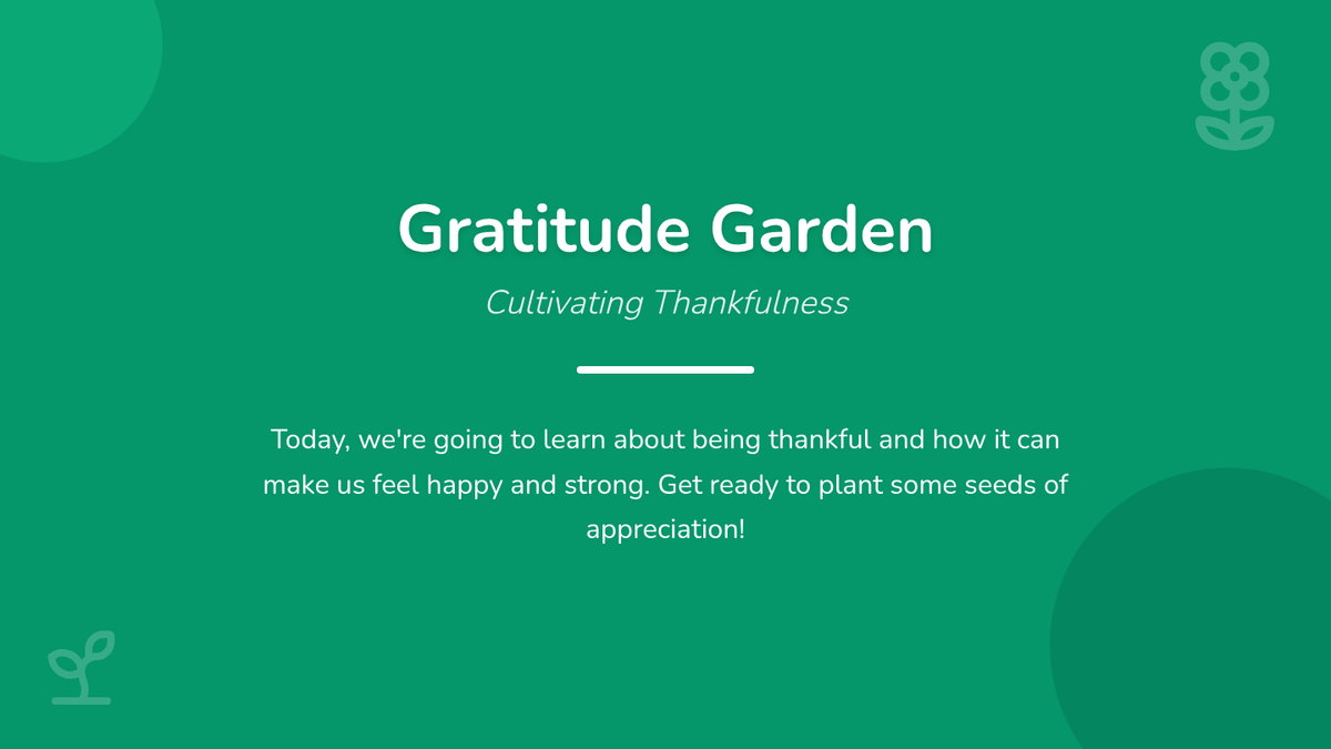 A 60-minute lesson for 3rd graders focused on identifying and expressing gratitude through interactive storytelling and the creation of a collaborative classroom 'Gratitude Garden'.