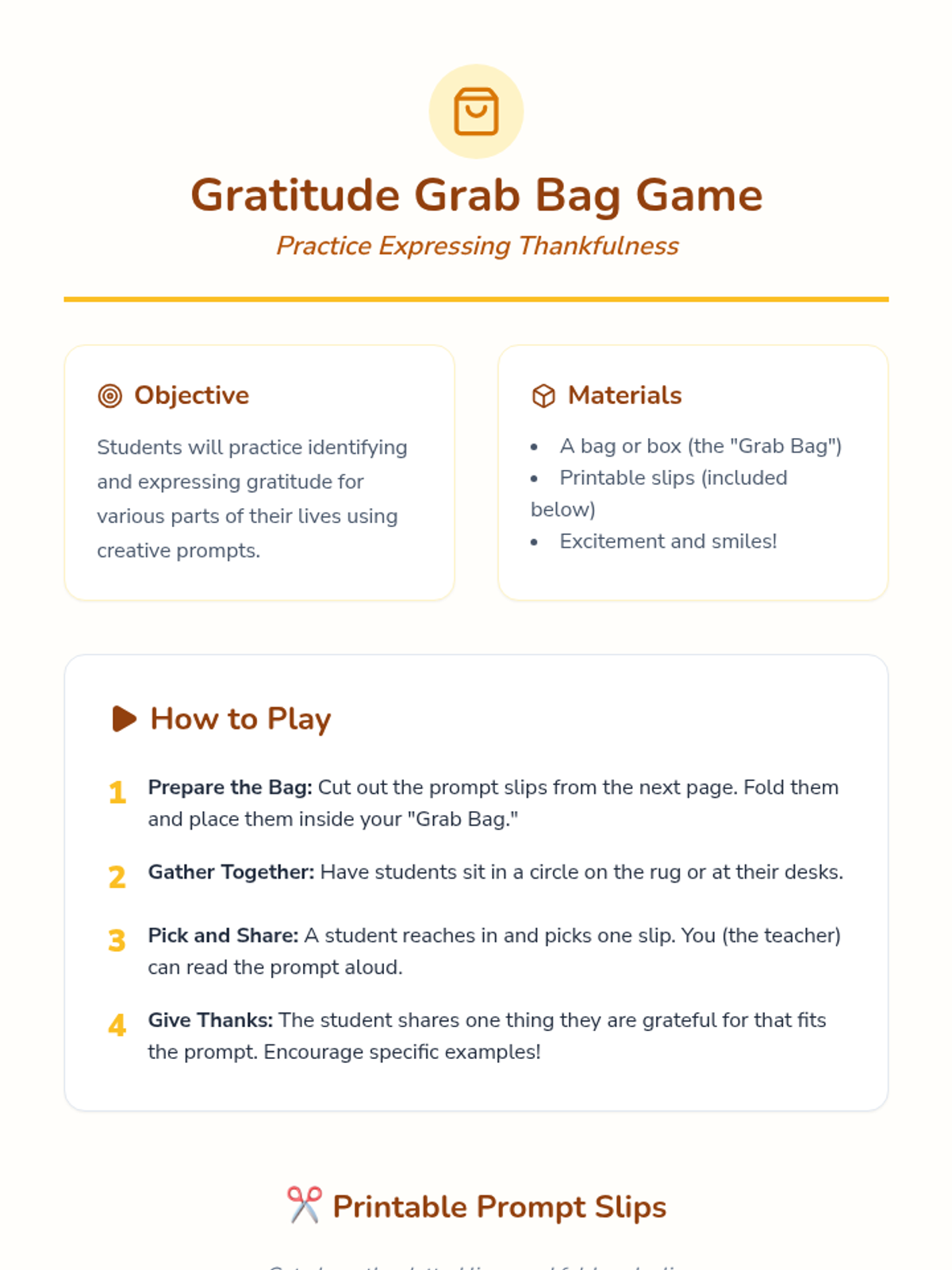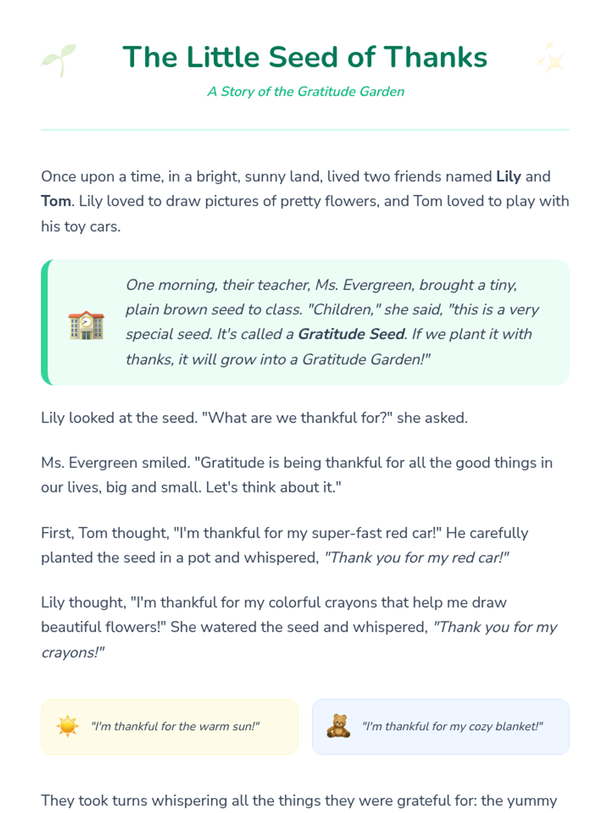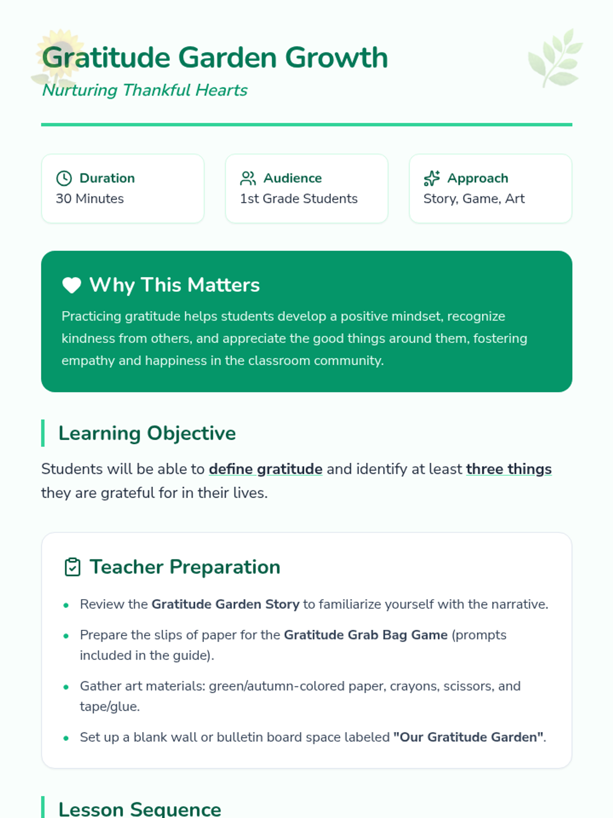 A whimsical 1st-grade lesson introducing gratitude through storytelling, an interactive game, and a collaborative garden-themed art project.