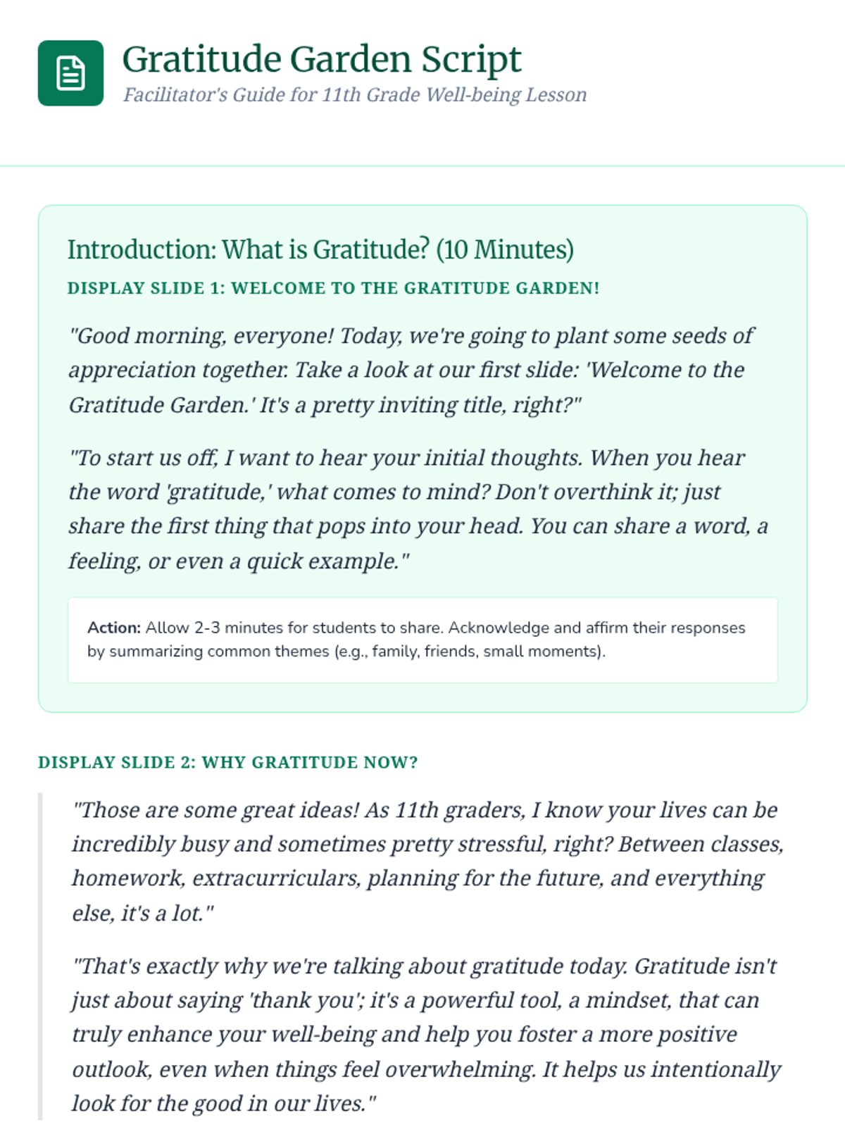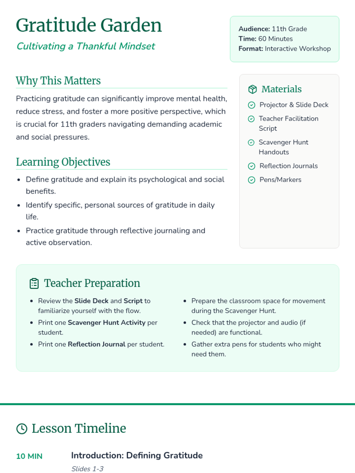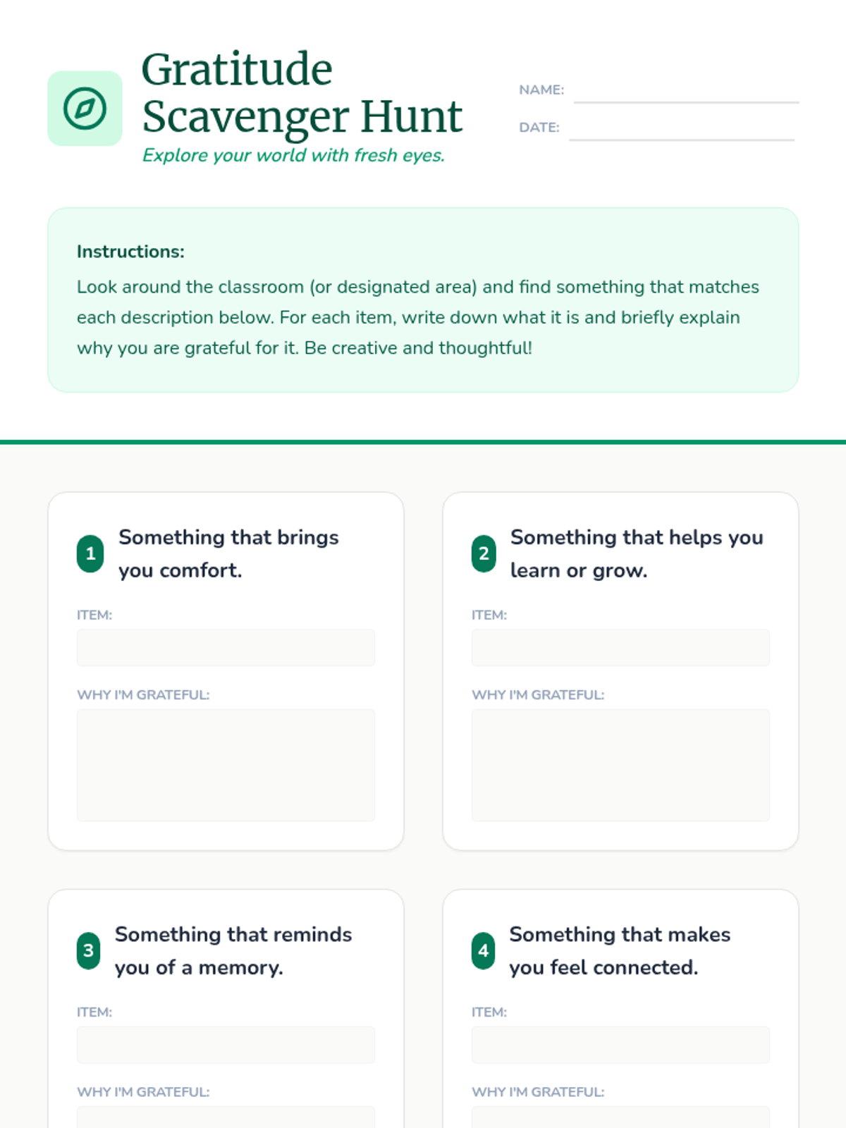 This lesson introduces 11th-grade students to the practice of gratitude as a powerful tool for enhancing well-being and fostering a positive outlook during stressful times. Students will explore the benefits of gratitude through a scavenger hunt and personal journaling.