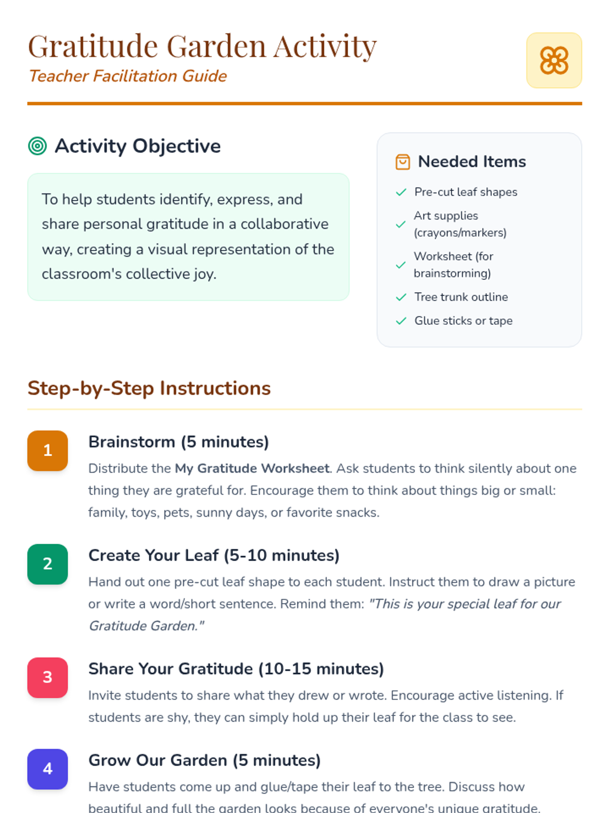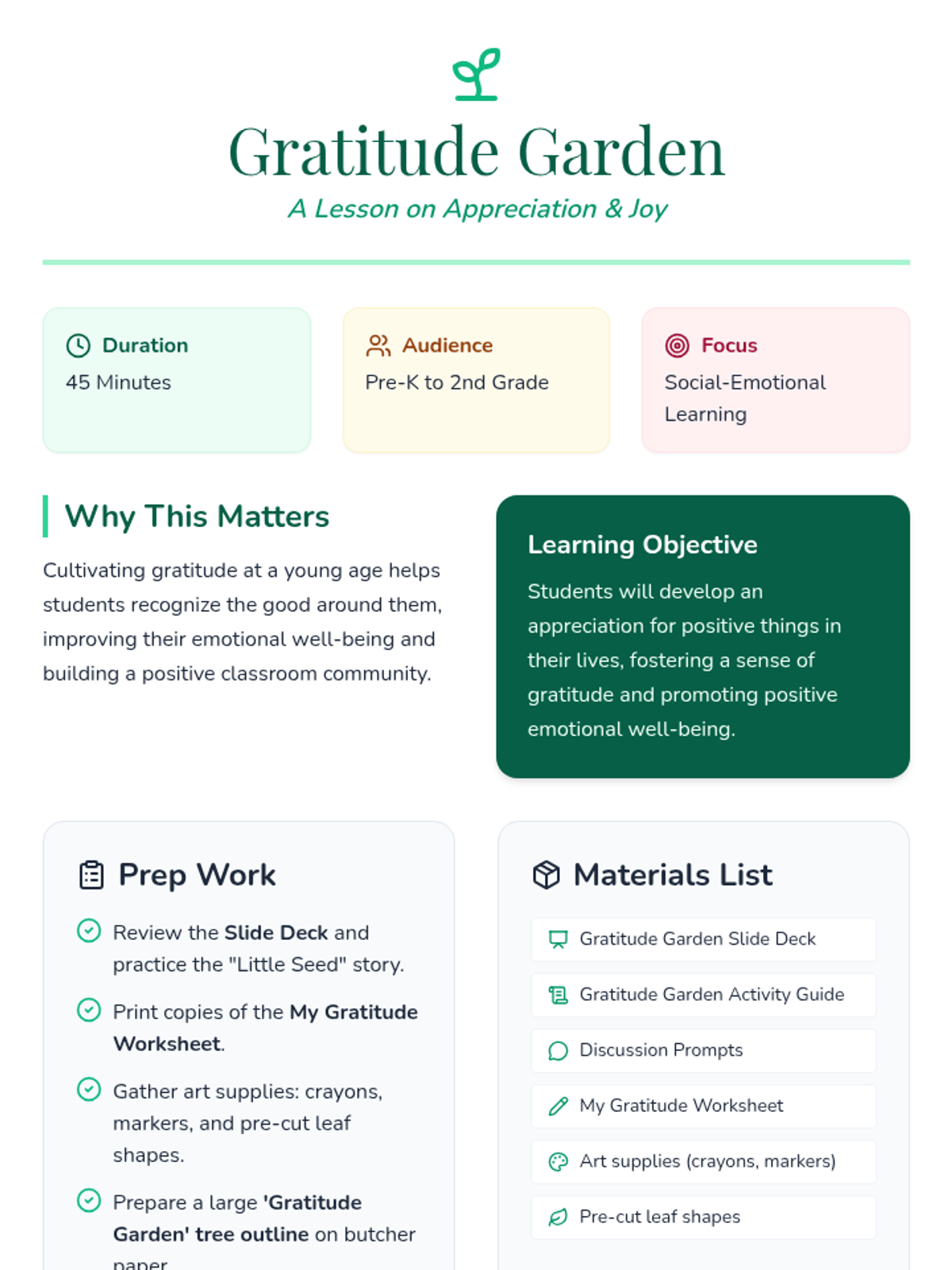 A 45-minute social-emotional learning lesson for Pre-K to 2nd Grade that uses a garden metaphor to help students identify and express things they are grateful for.