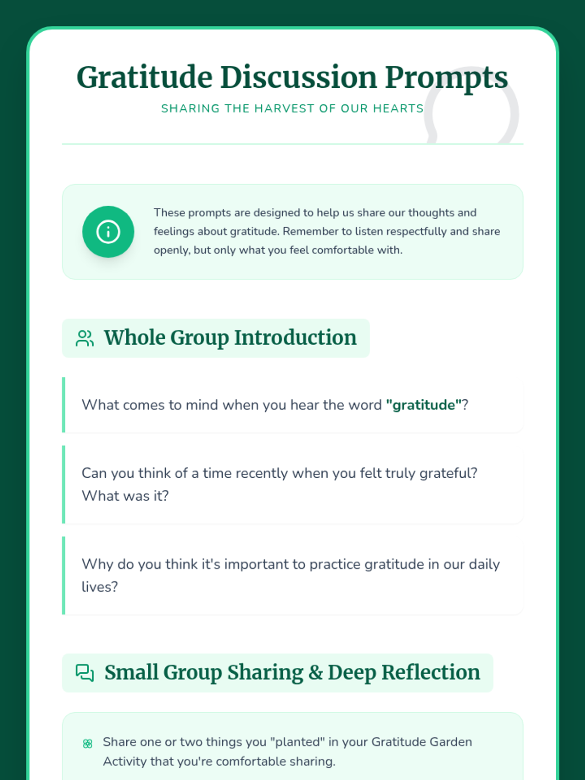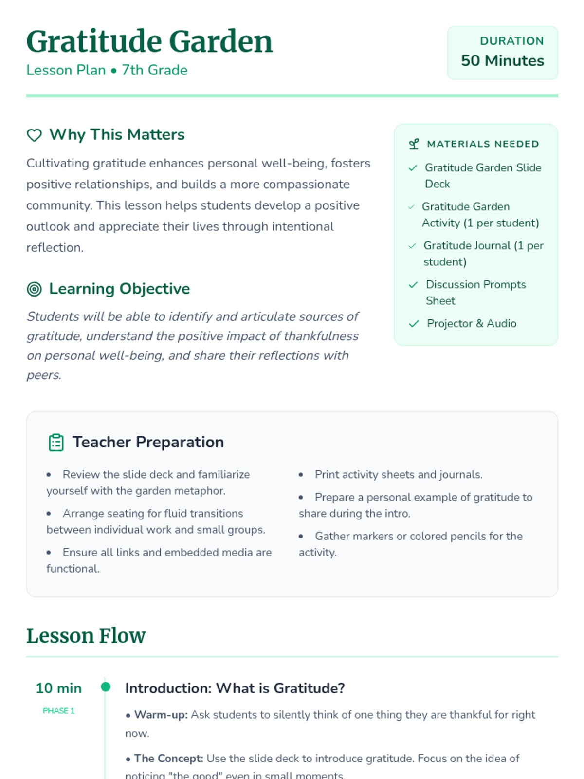 A 50-minute lesson for 7th graders to explore gratitude through guided reflection, creative expression, and group sharing, fostering a positive outlook and community spirit.