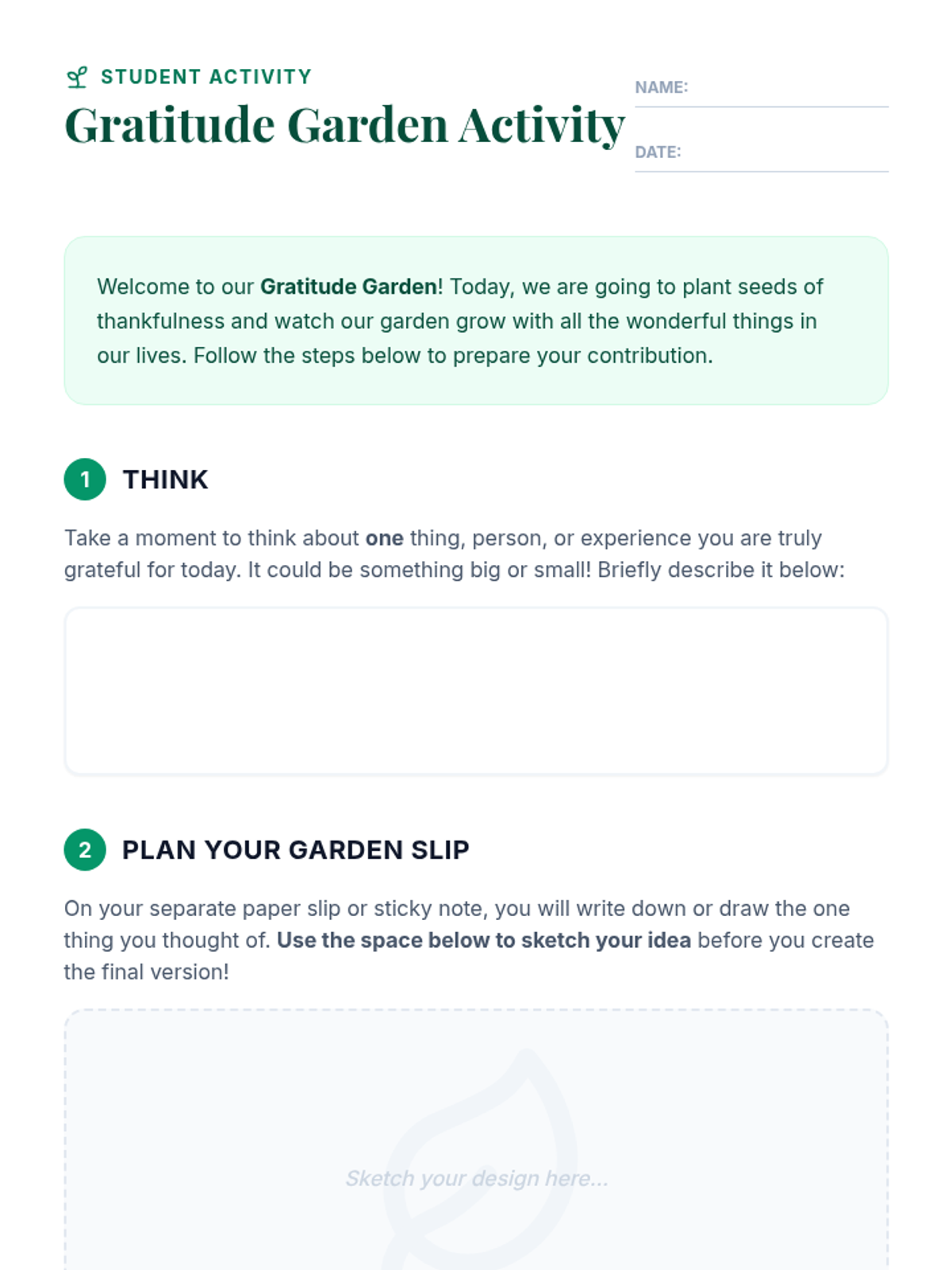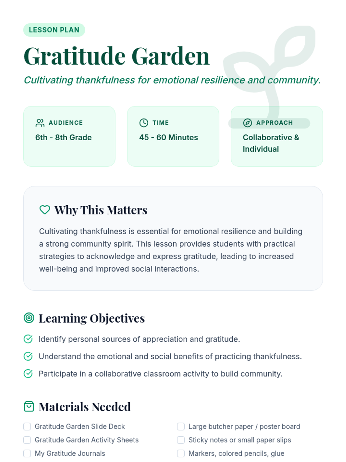 This lesson encourages middle school students to explore and express gratitude through a collaborative 'gratitude garden' activity and individual journaling. It fosters emotional resilience and community spirit by helping students identify sources of appreciation and understanding how thankfulness enhances mood and relationships.