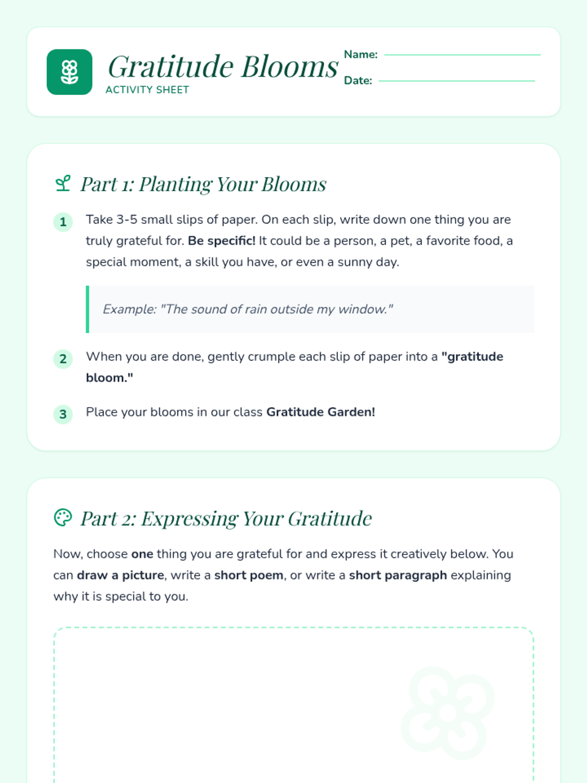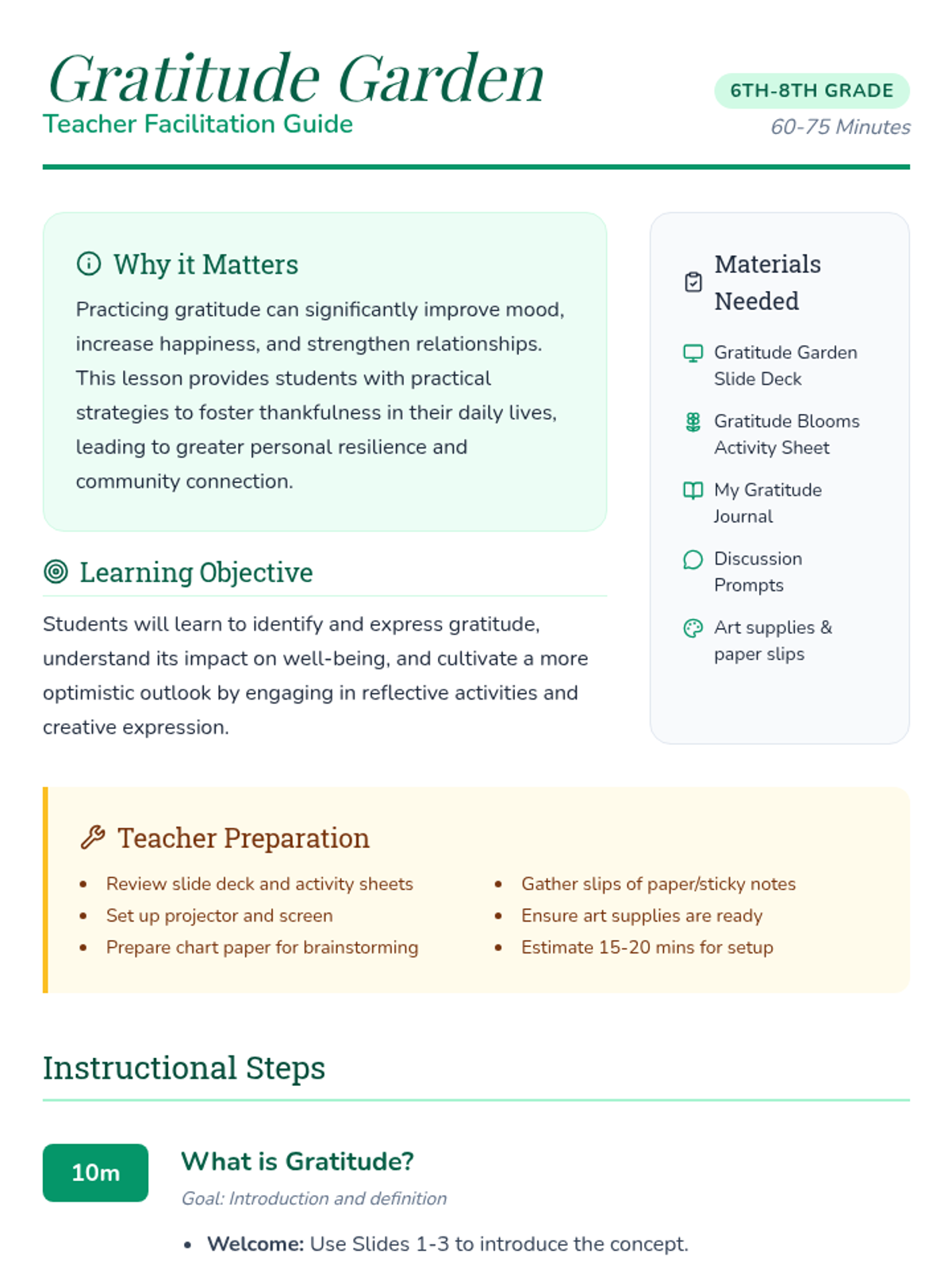 This lesson helps 6th-8th grade students explore the profound impact of gratitude on their mood and happiness. Students identify and appreciate positive aspects of their lives through reflective activities and creative expression.