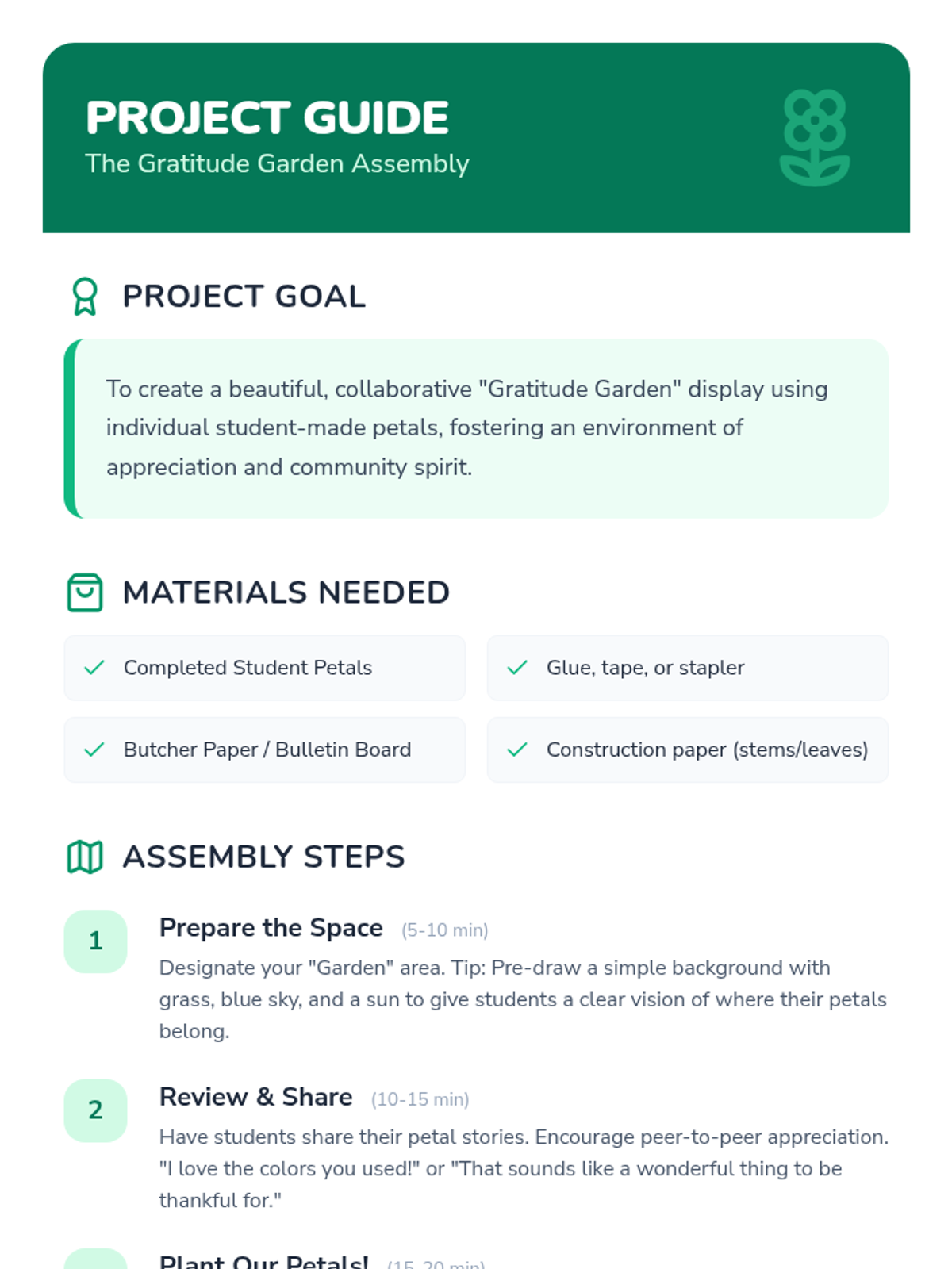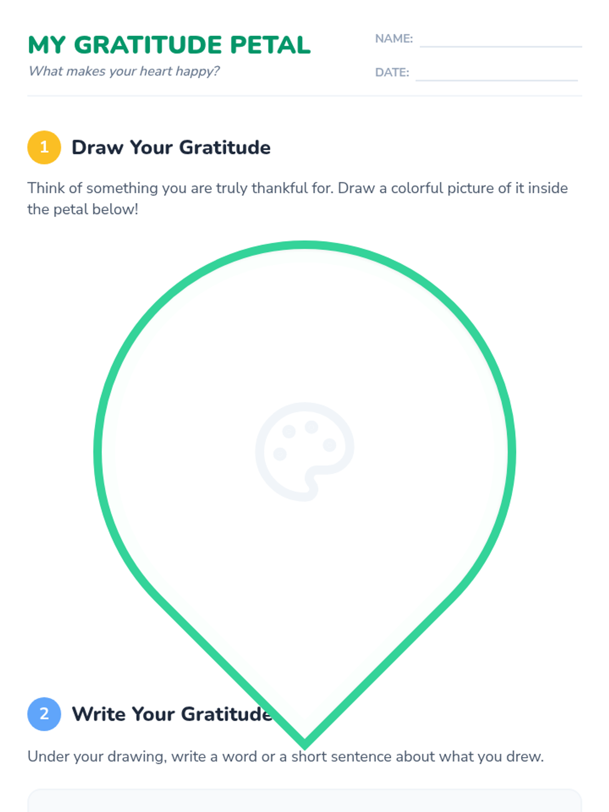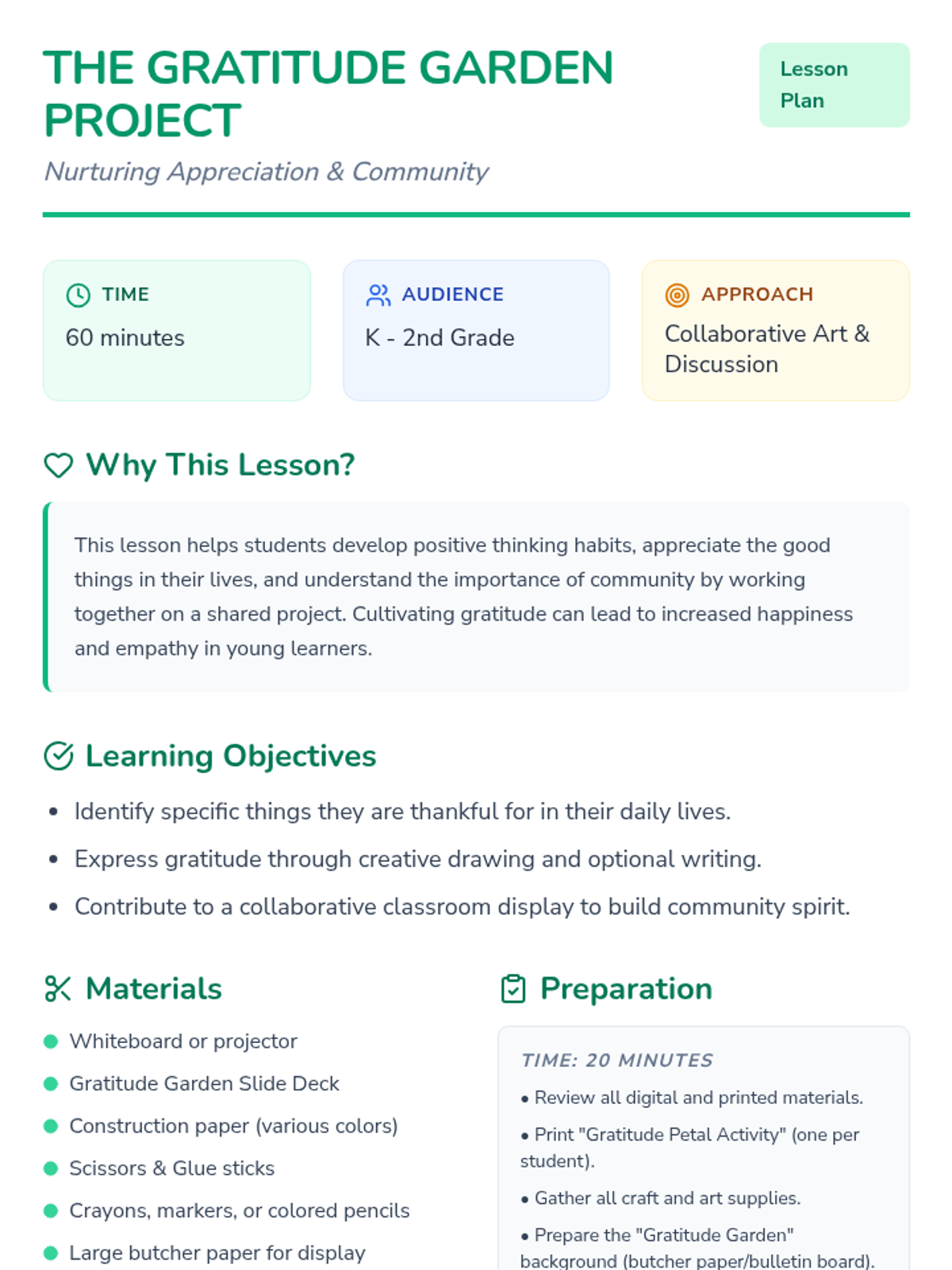 A 60-minute lesson for K-2nd grade where students explore gratitude through discussion, creative expression, and a collaborative art project. Students create individual 'gratitude petals' to form a class-wide garden display.