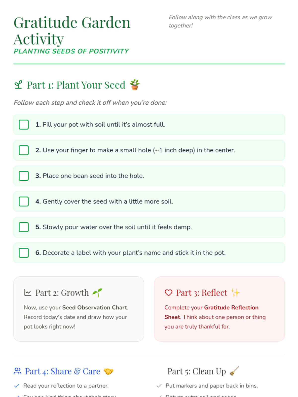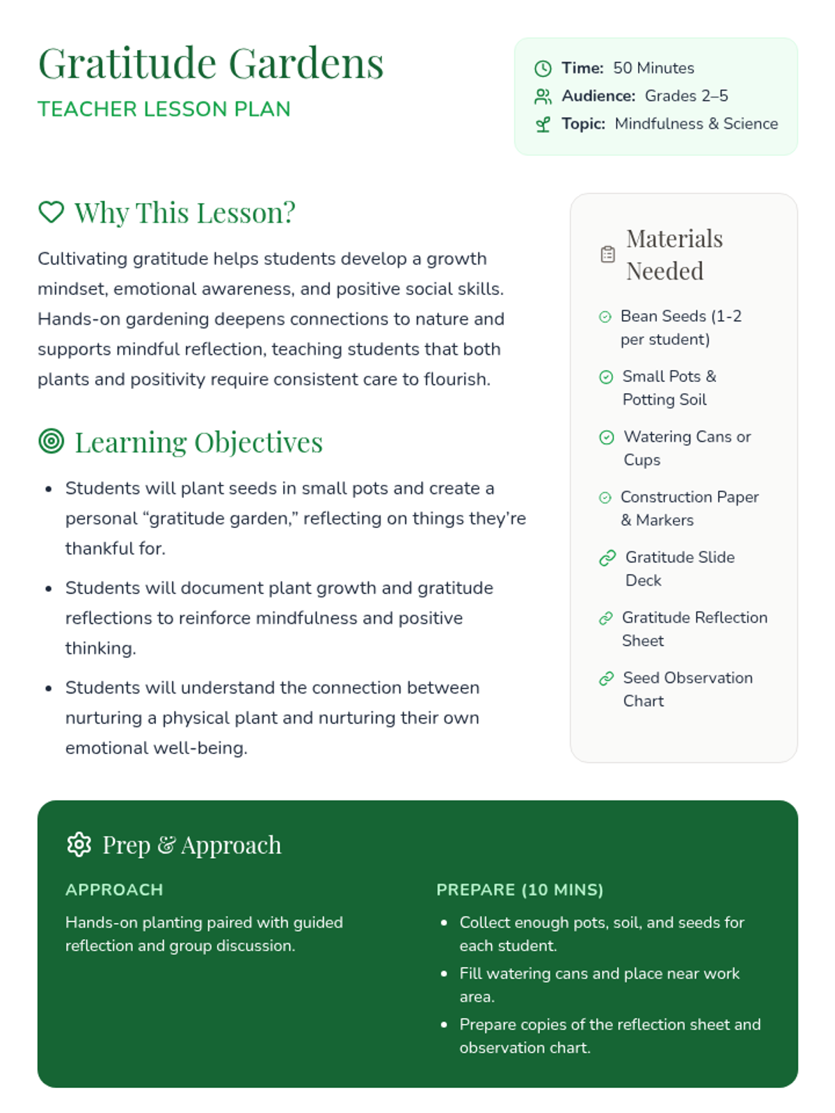 Elementary students will plant seeds of gratitude, creating gardens that not only thrive physically but also represent personal growth and positivity through hands-on gardening and mindfulness reflection.