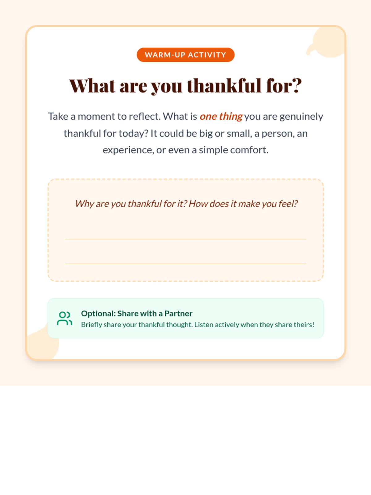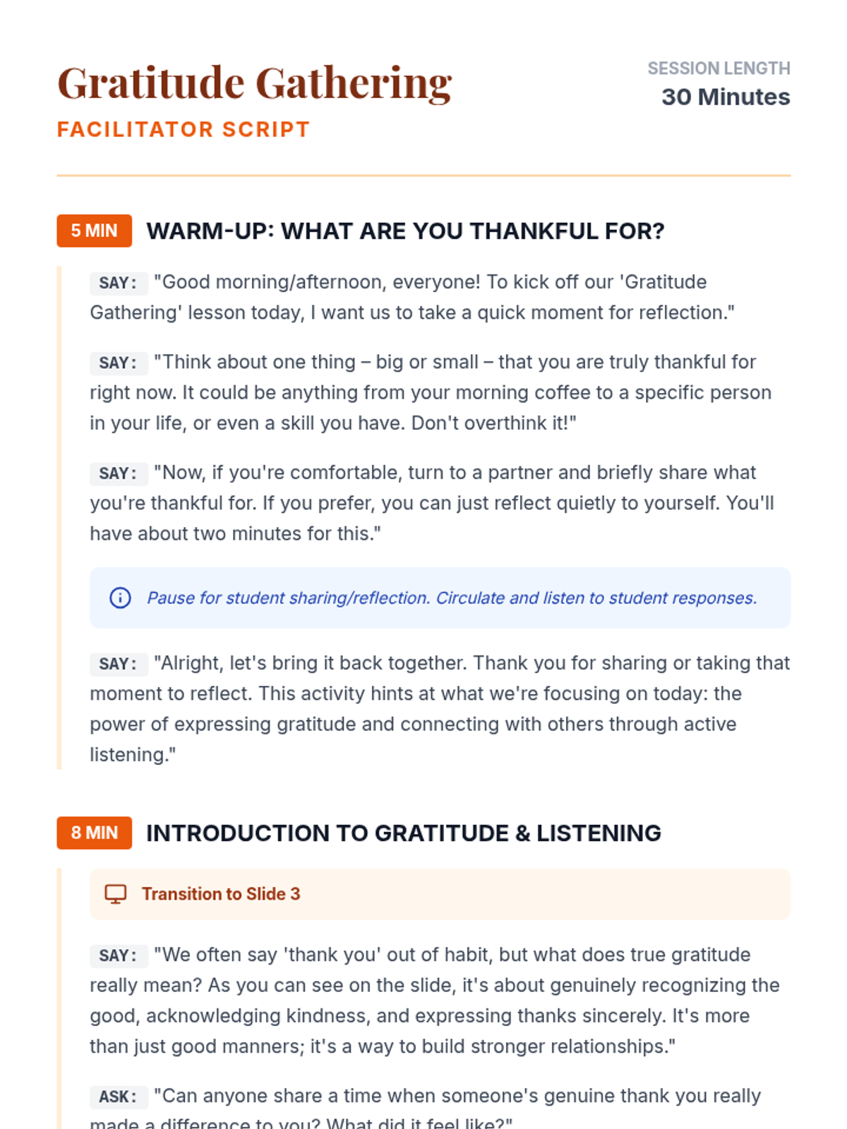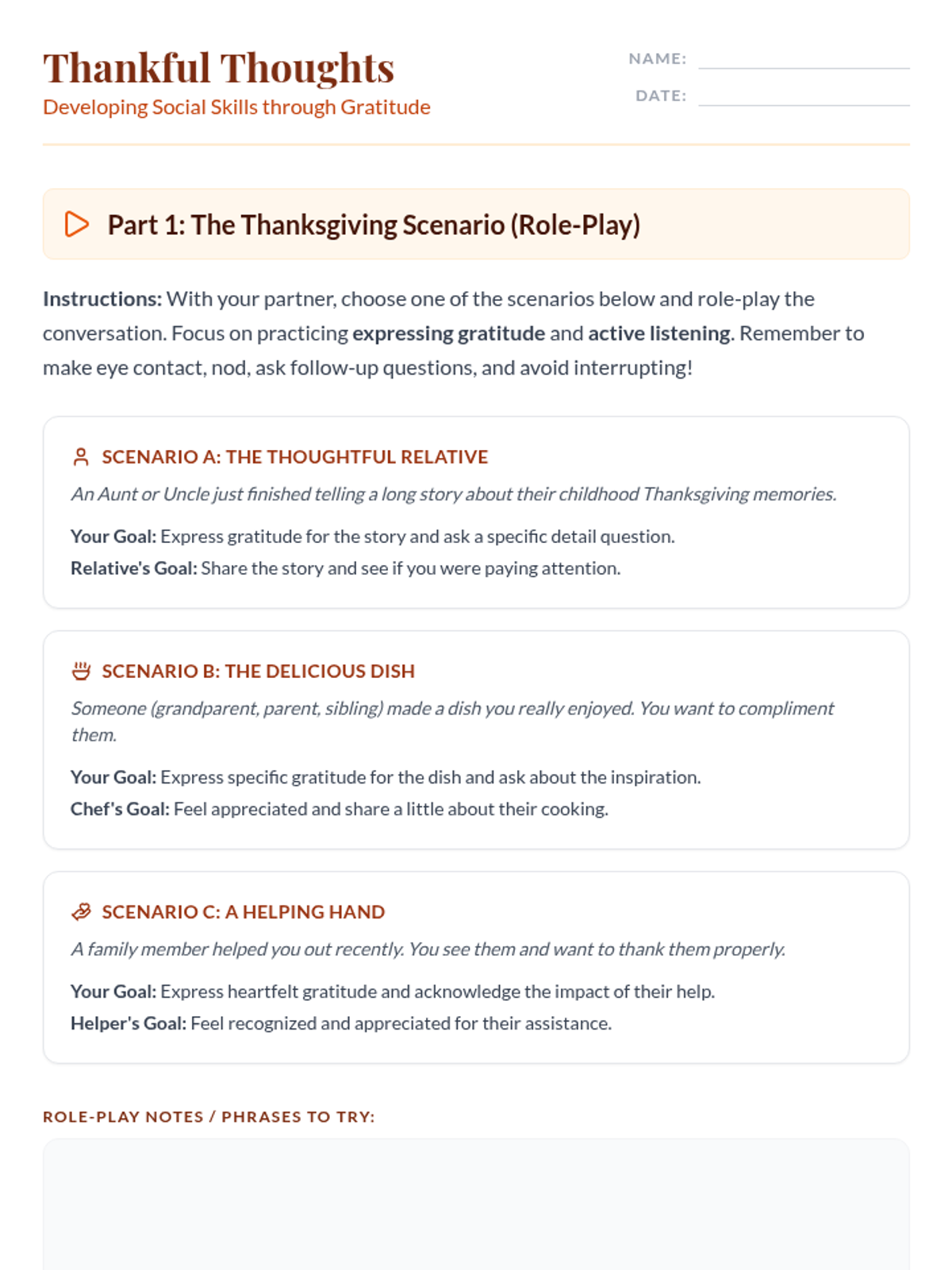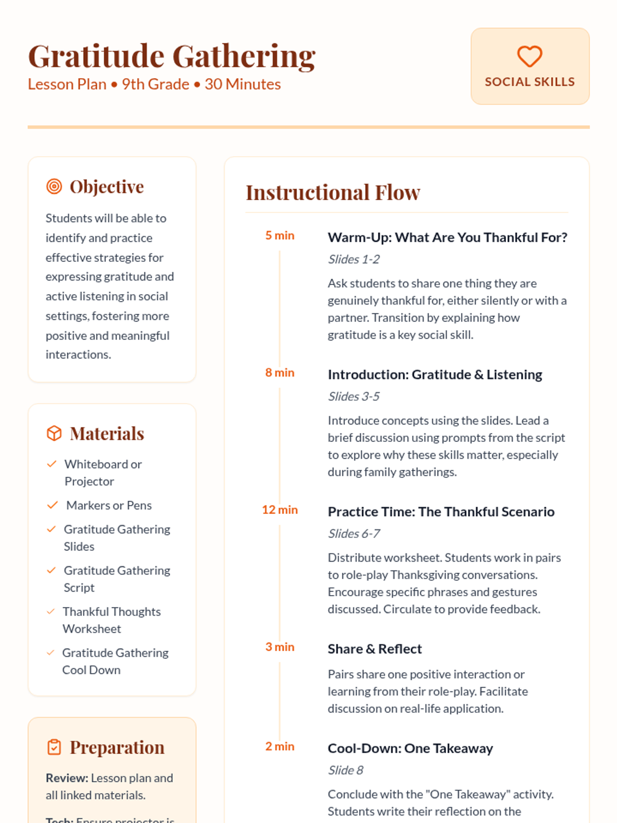 A 30-minute lesson for 9th-grade students focusing on social skills like expressing gratitude and active listening, perfect for holiday gatherings and building stronger connections.