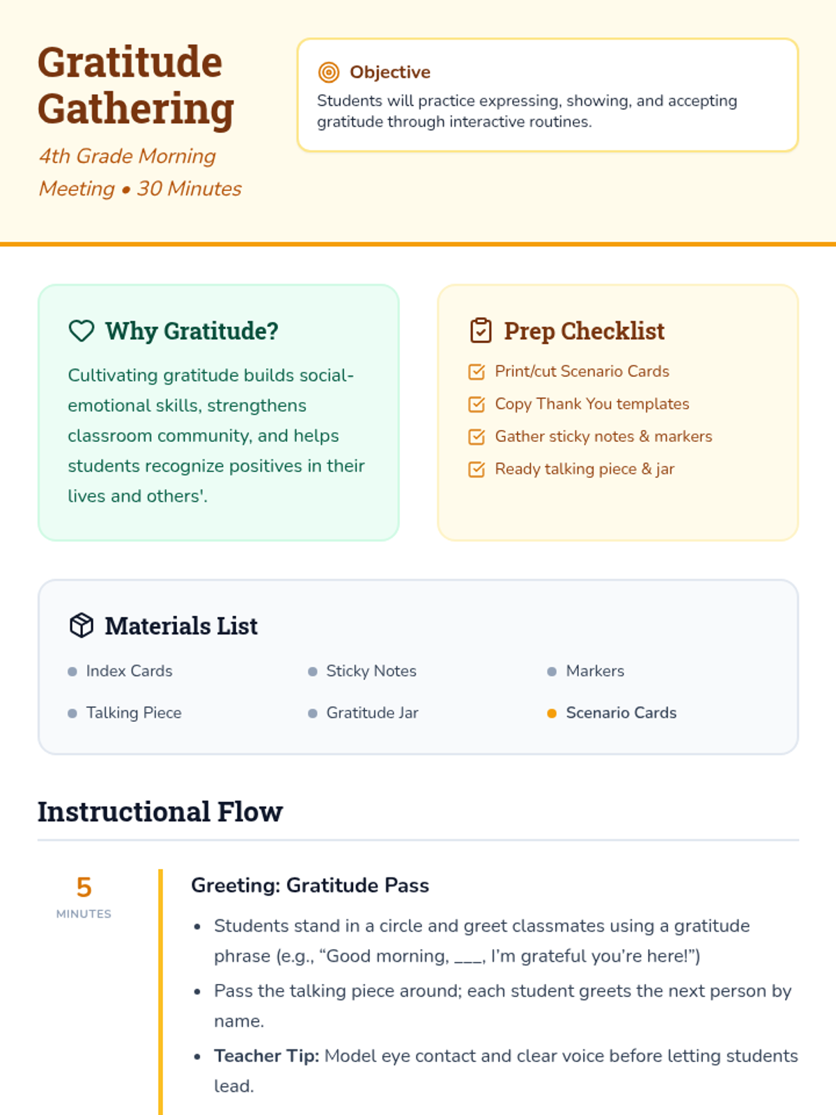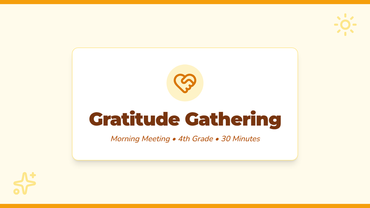 A 30-minute Morning Meeting lesson for 4th graders focused on cultivating a thankful mindset through greetings, sharing, and interactive gratitude activities.