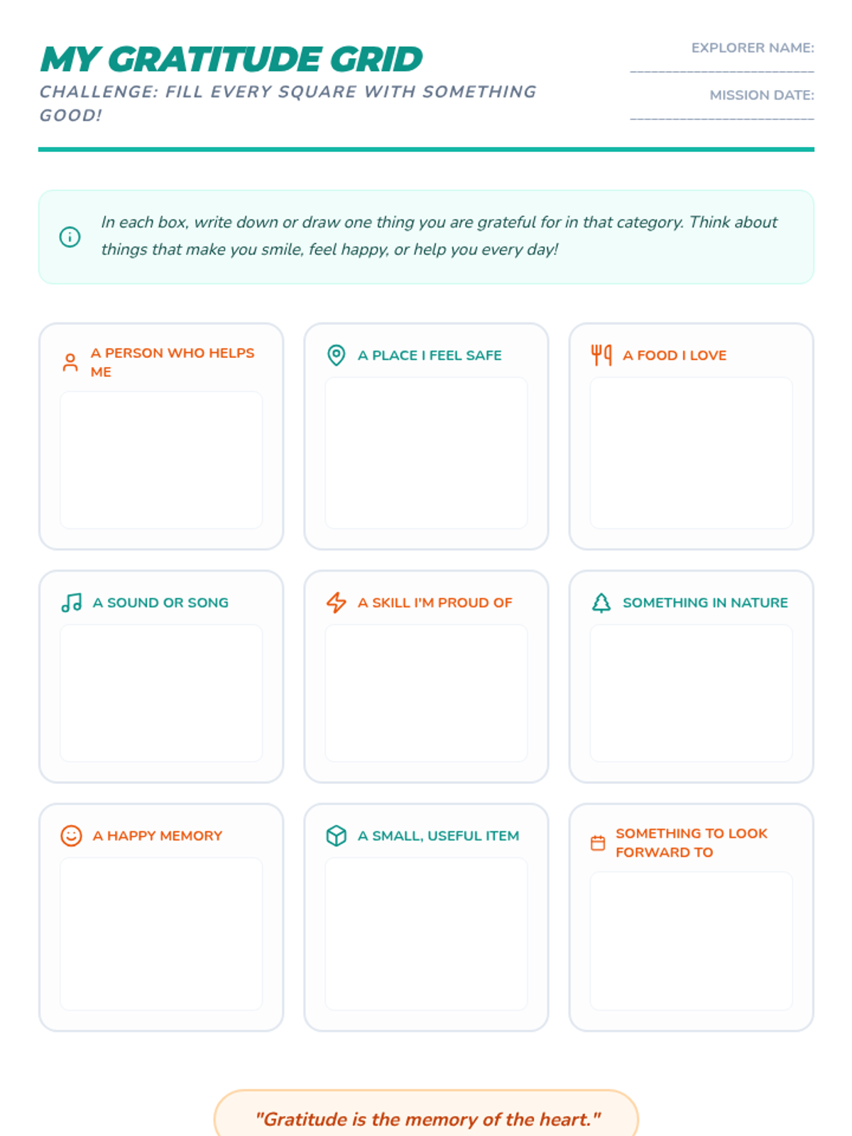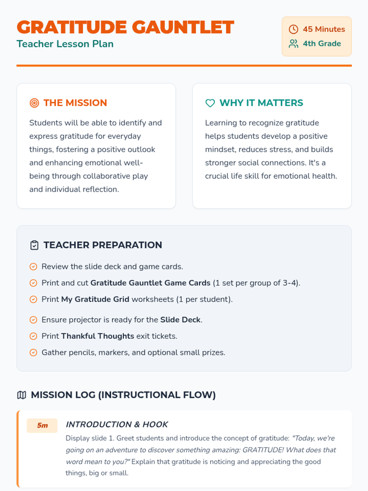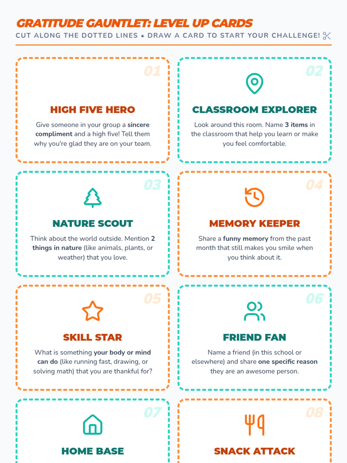 An interactive adventure where 4th graders tackle challenges to identify and express gratitude, shifting their focus toward positive experiences.