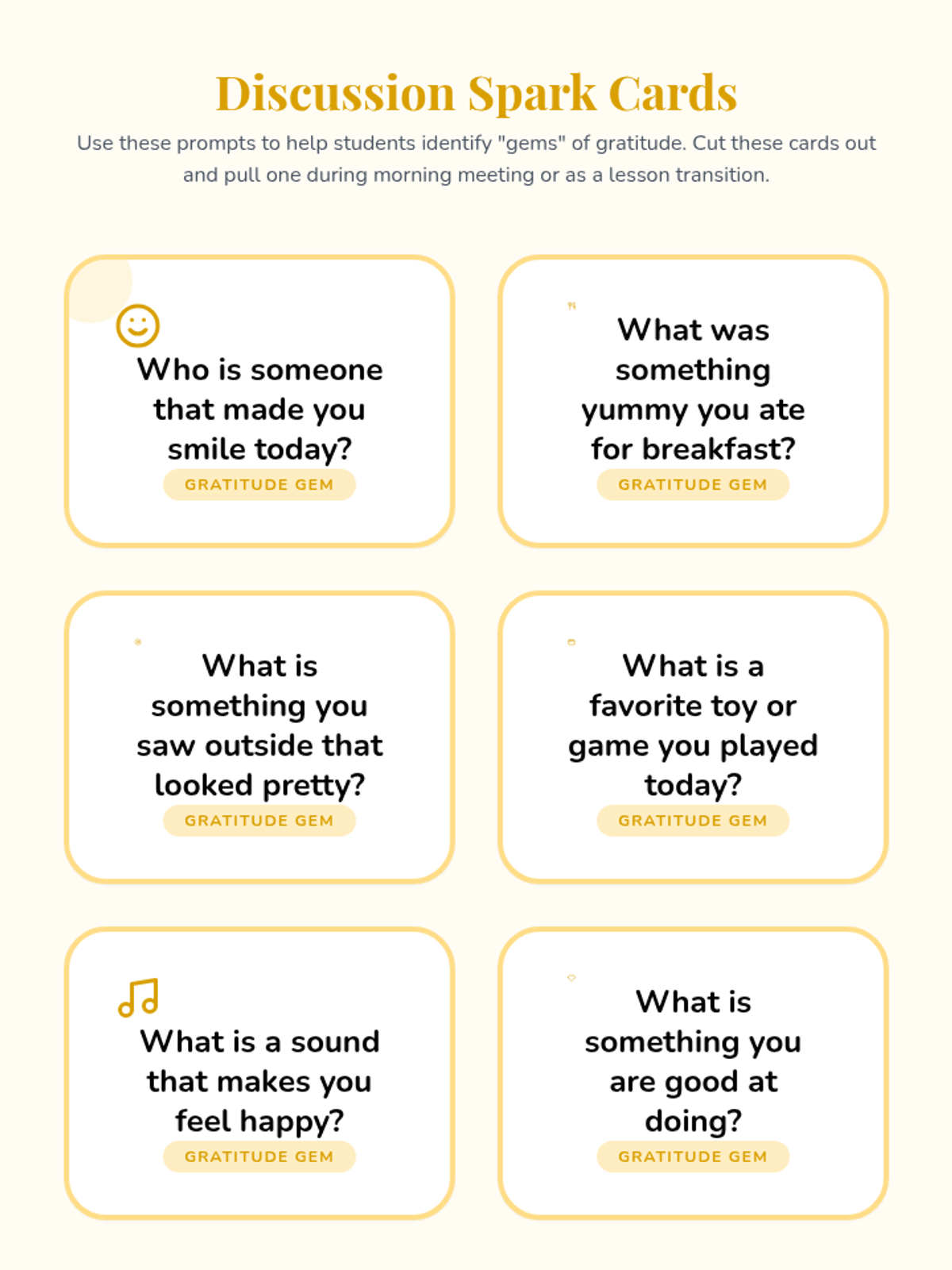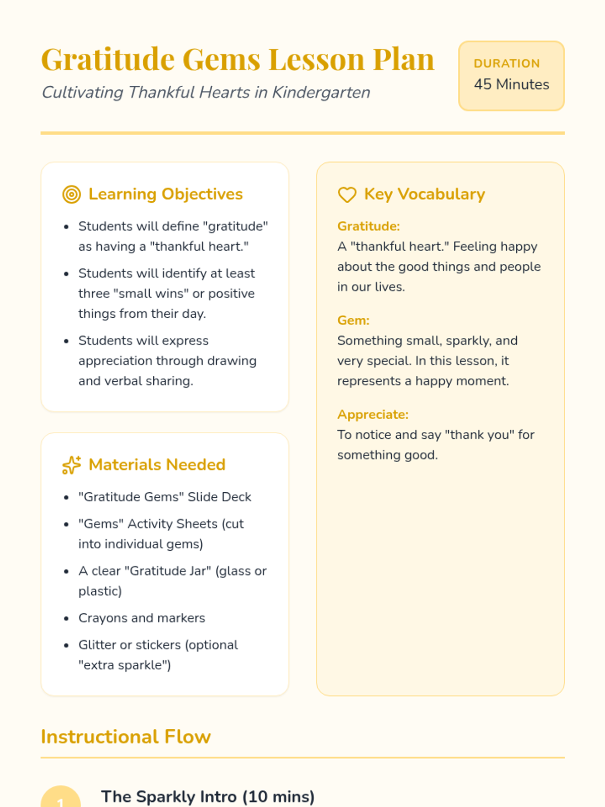 A gentle introduction to gratitude for Kindergarten students, using the metaphor of 'gems' to identify and celebrate small, positive moments in their daily lives.