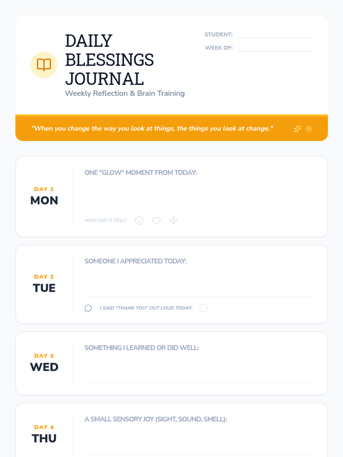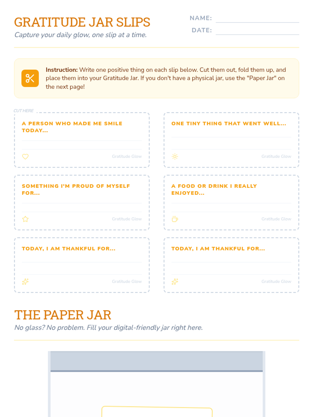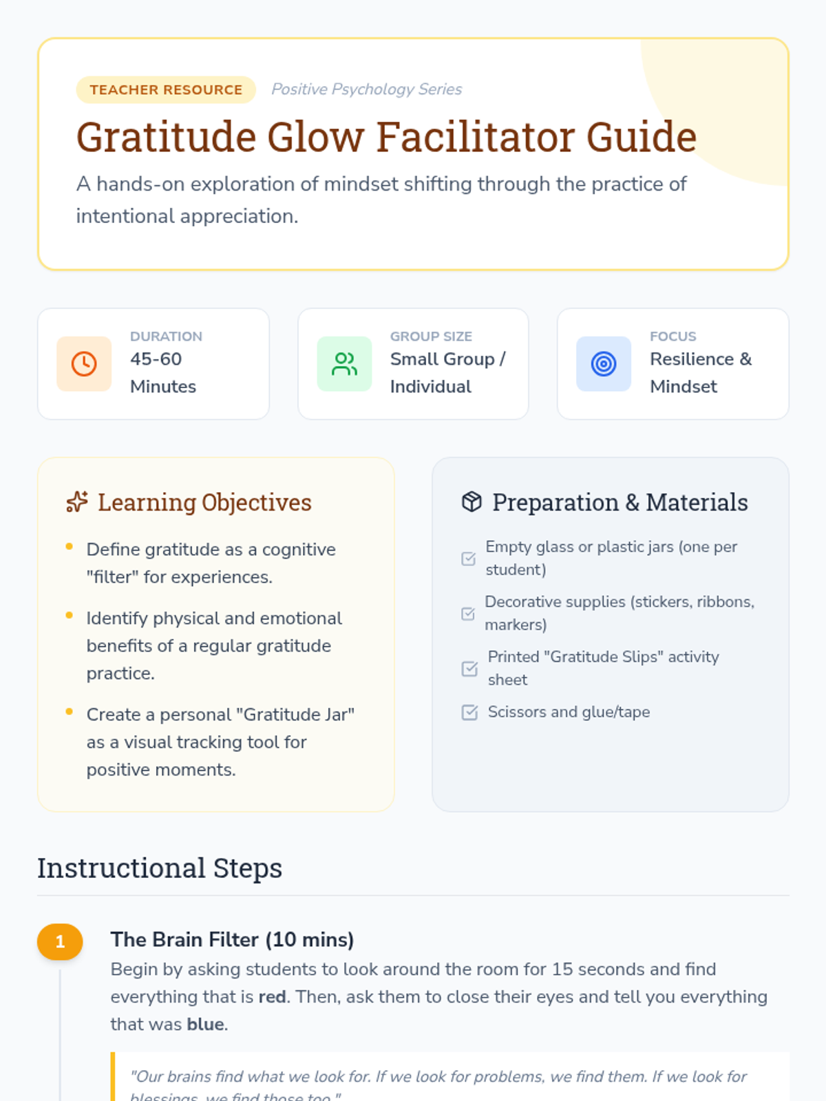 A transformative lesson on positive psychology that teaches students how to shift their mindset through the practice of gratitude. Students will explore the science of well-being and create a personal gratitude jar to track their daily blessings.
