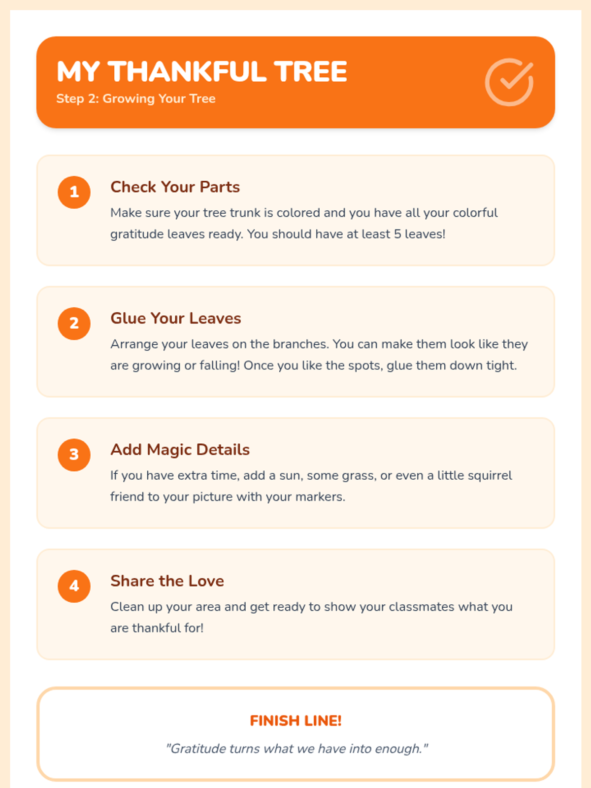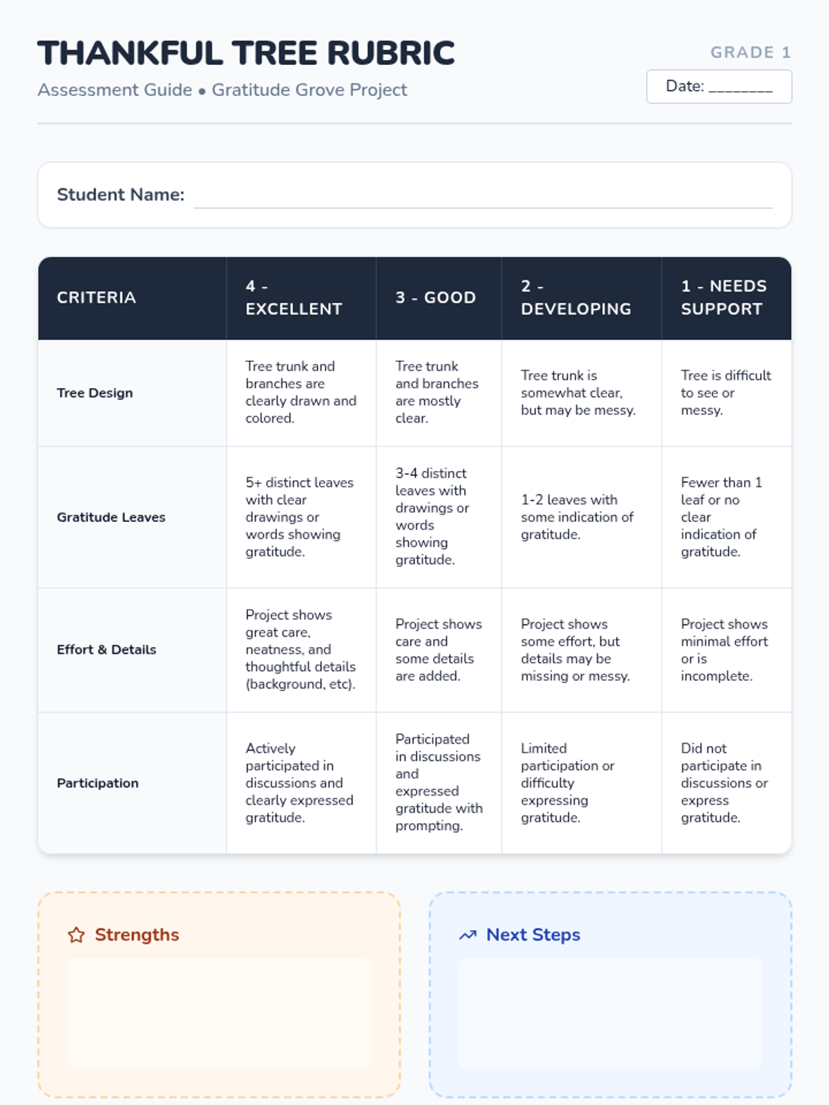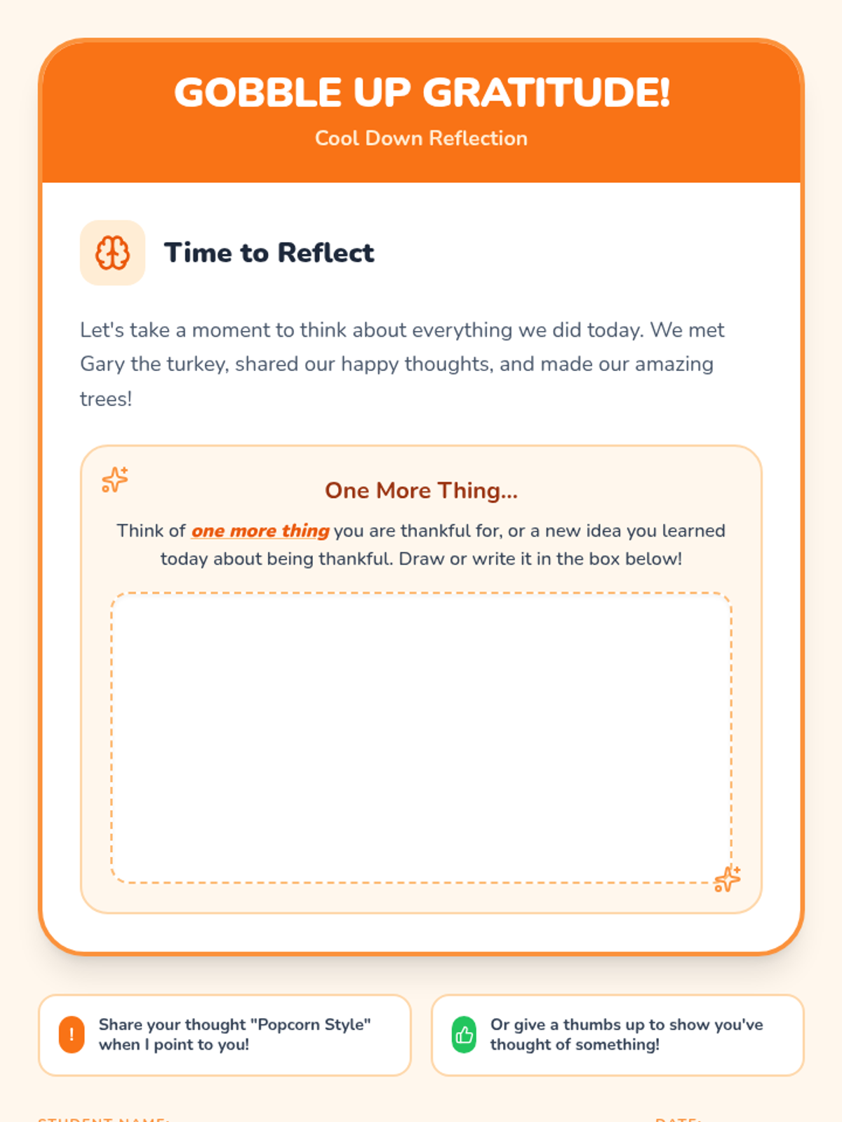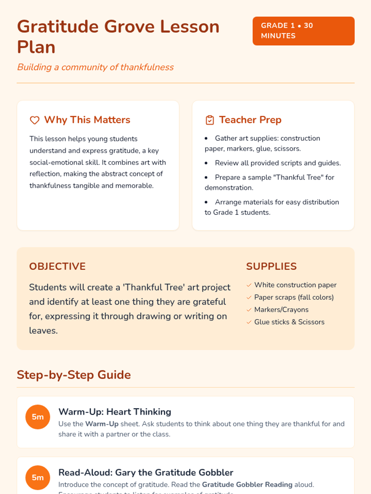 A heartwarming 30-minute art and social-emotional learning lesson for first graders. Students listen to the story of Gary the Gratitude Gobbler and create a 'Thankful Tree' to visualize and express the things they are grateful for.