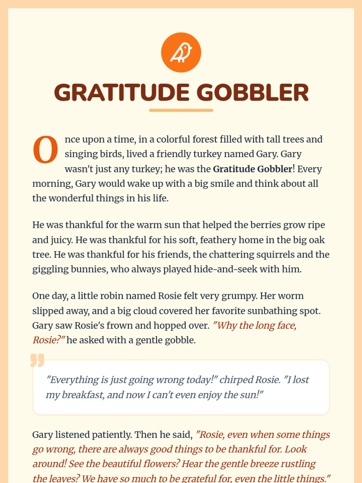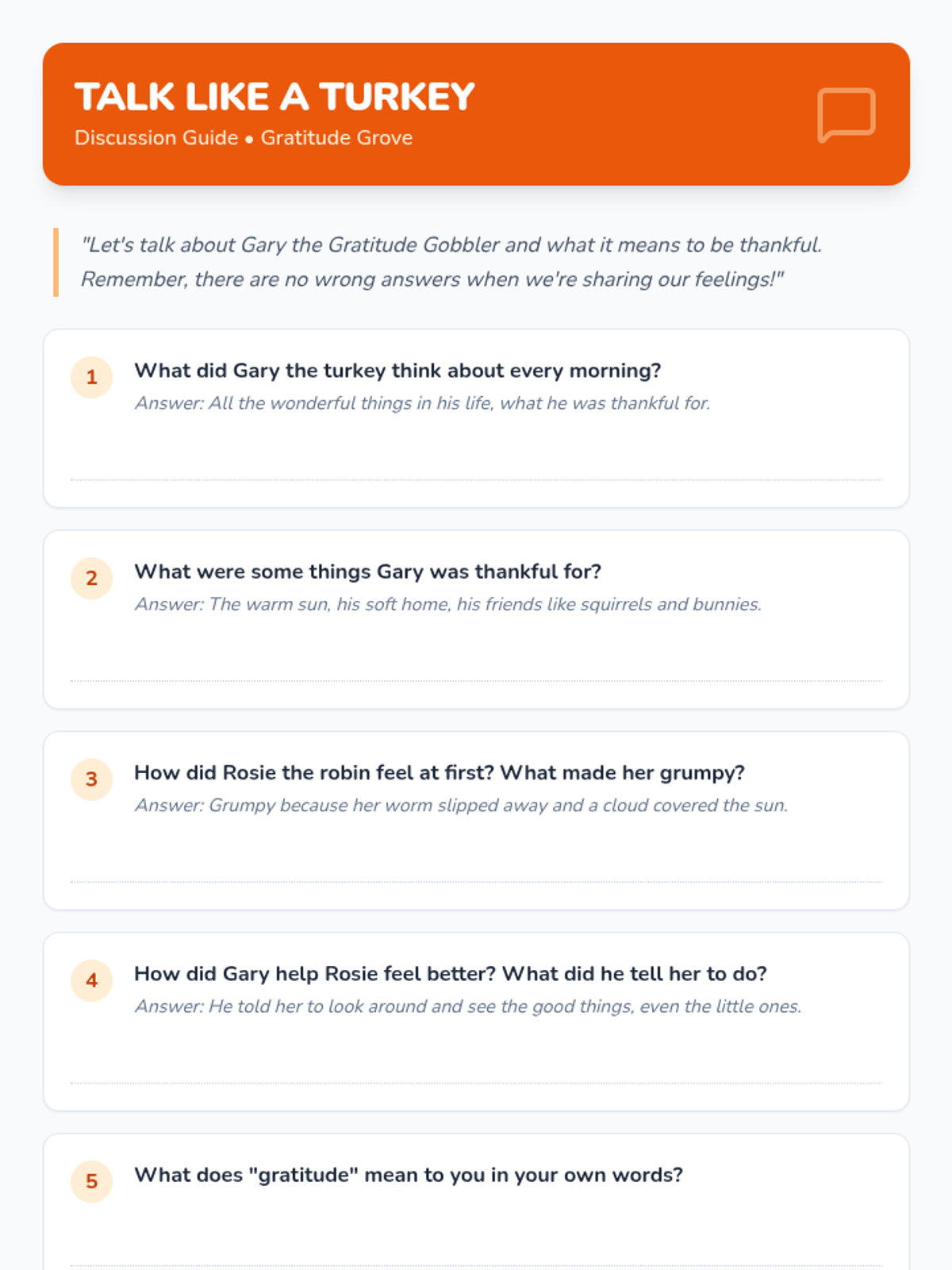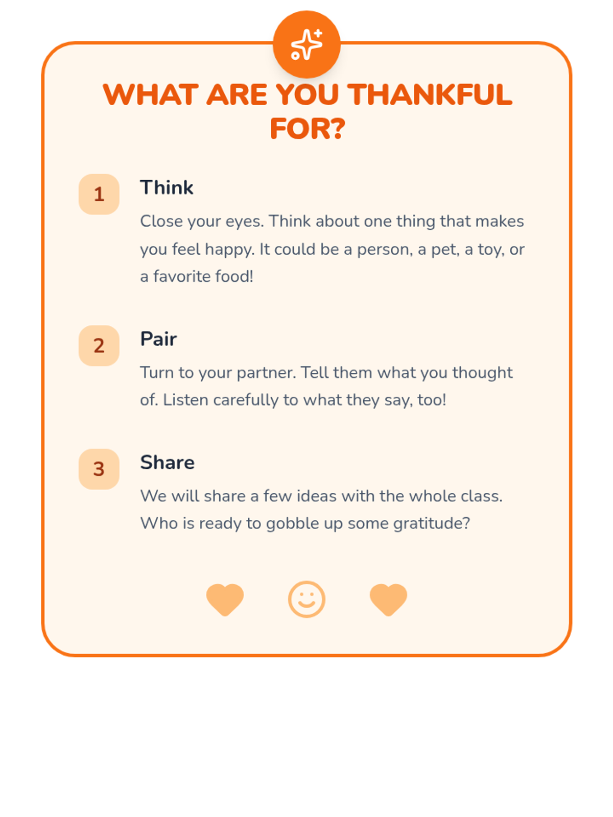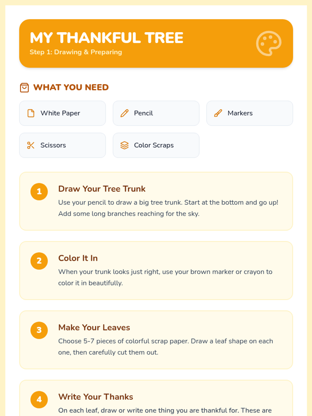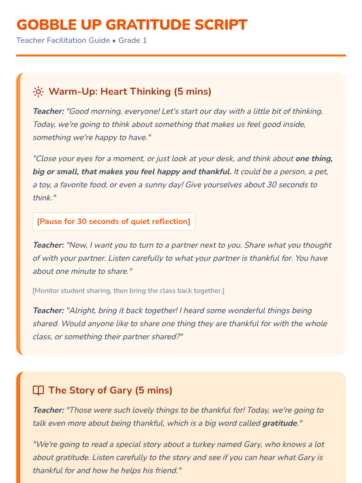 A heartwarming 30-minute art and social-emotional learning lesson for first graders. Students listen to the story of Gary the Gratitude Gobbler and create a 'Thankful Tree' to visualize and express the things they are grateful for.