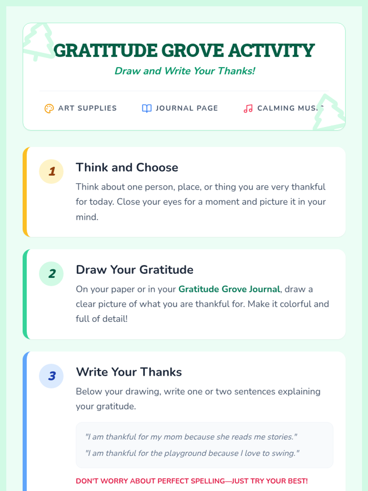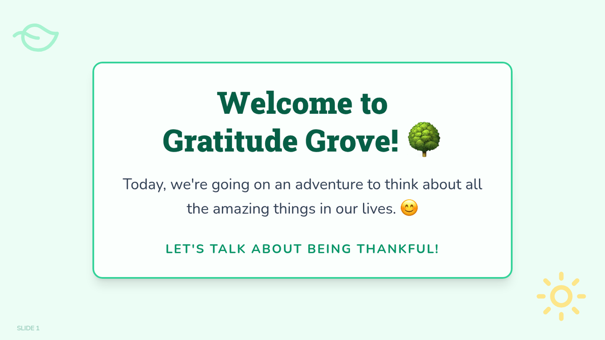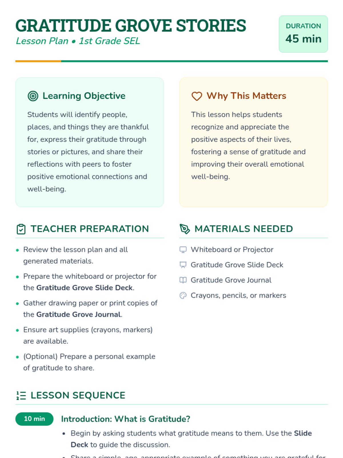 A 1st-grade lesson that encourages students to identify and express things they are thankful for through storytelling and drawing. Students create 'Gratitude Grove' journal entries to foster emotional well-being and positive social connections.