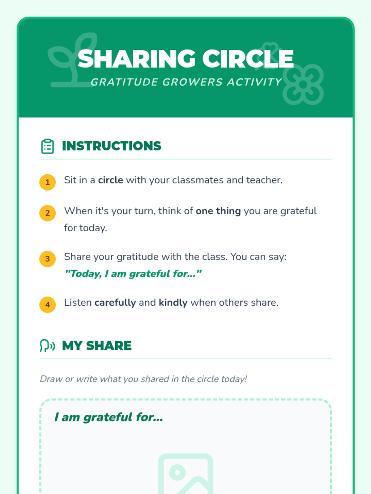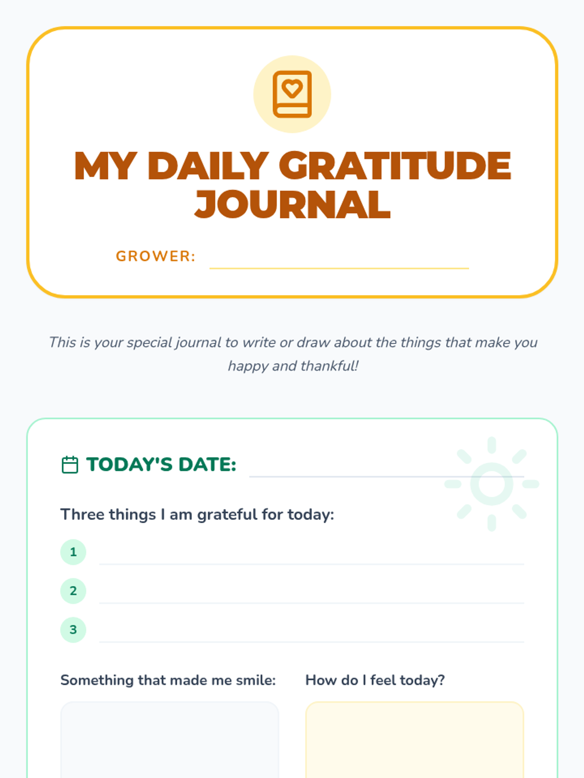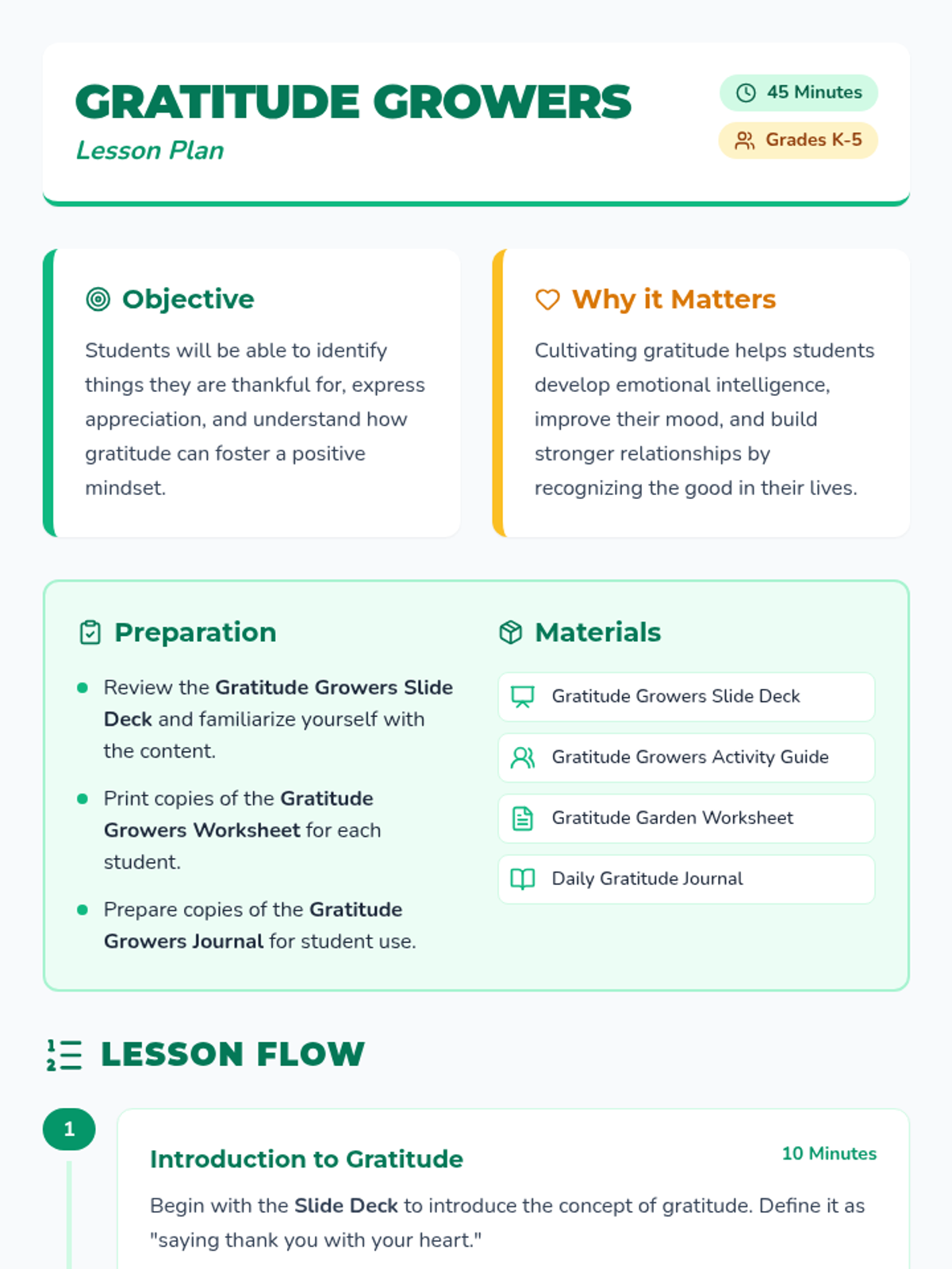 A comprehensive lesson for K-5 students to explore gratitude through a 'Gratitude Growers' garden theme. Students identify things they are thankful for, share with peers, and begin a daily journaling practice to foster a positive mindset.