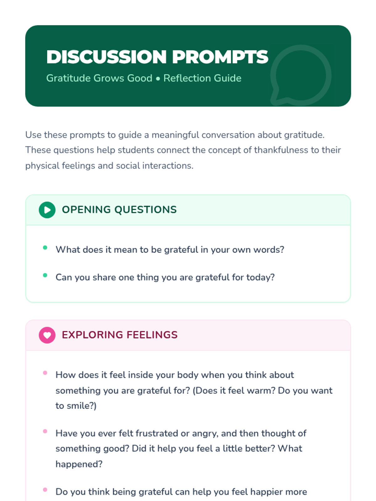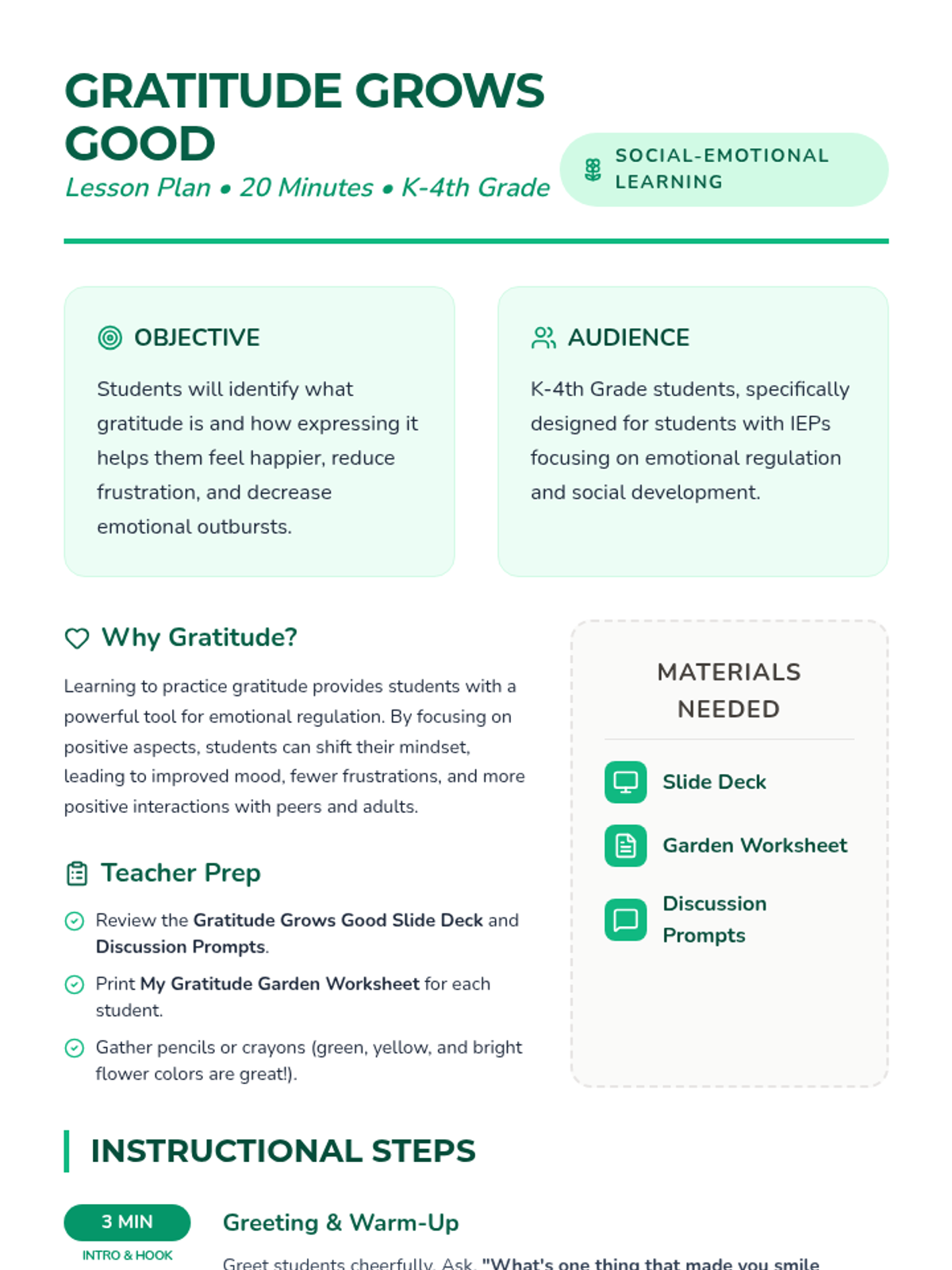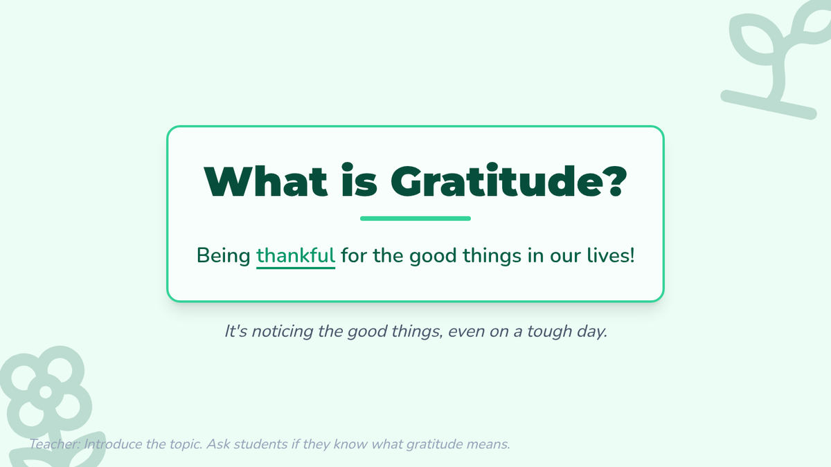 A 20-minute Tier 1 lesson for K-4th grade students focusing on gratitude as a tool for emotional regulation and positive behavior. Students explore the concept of thankfulness through discussion and create a 'Gratitude Garden' to visualize their own positive experiences.
