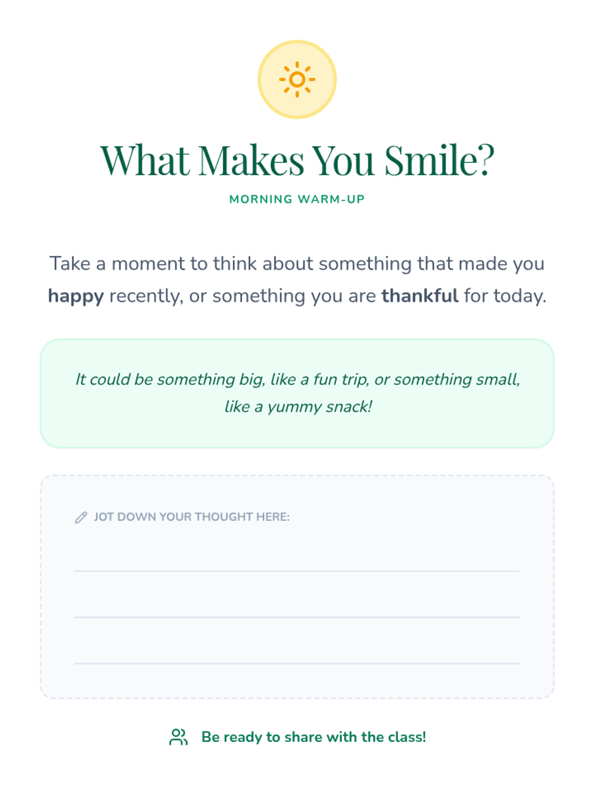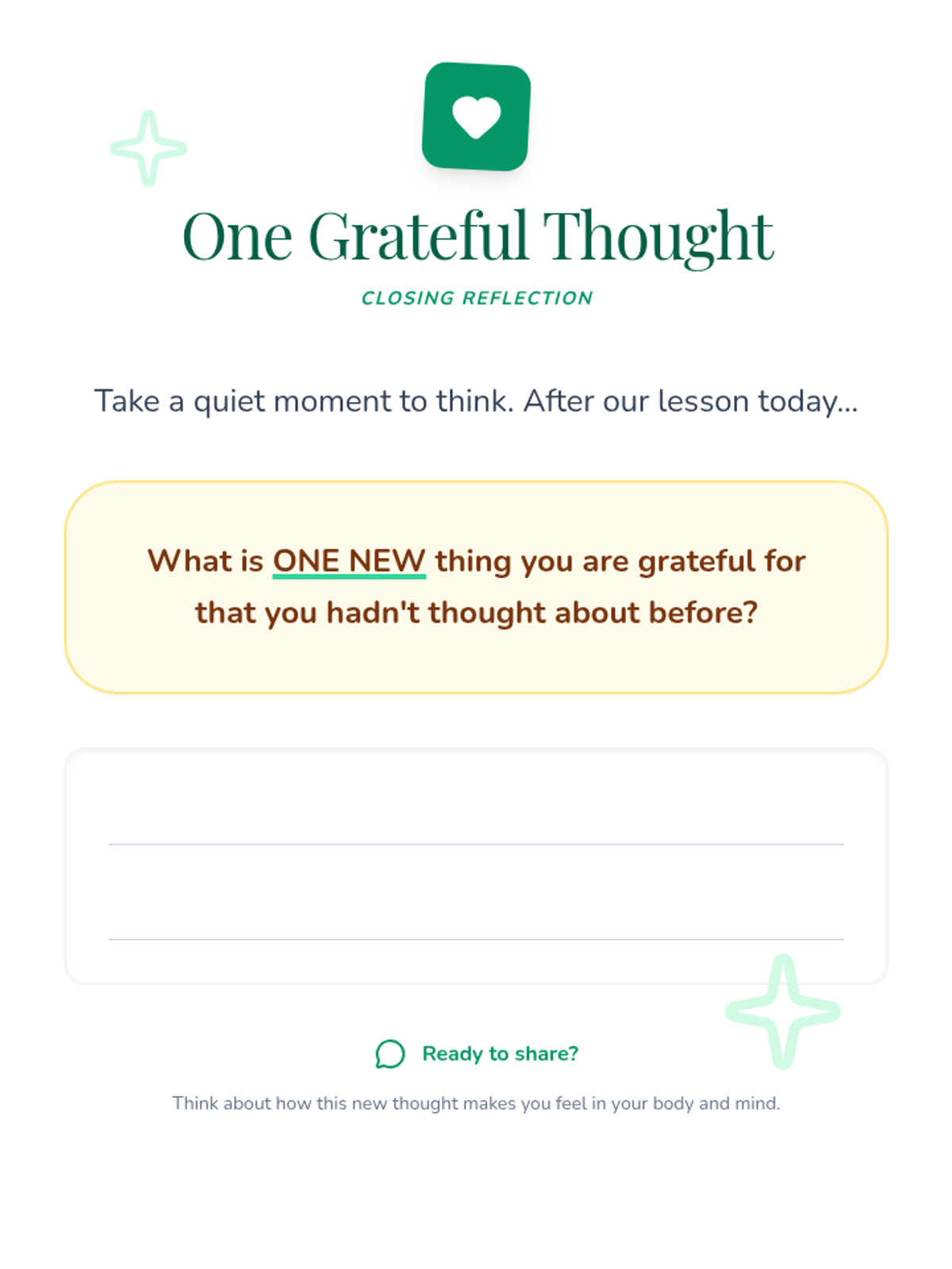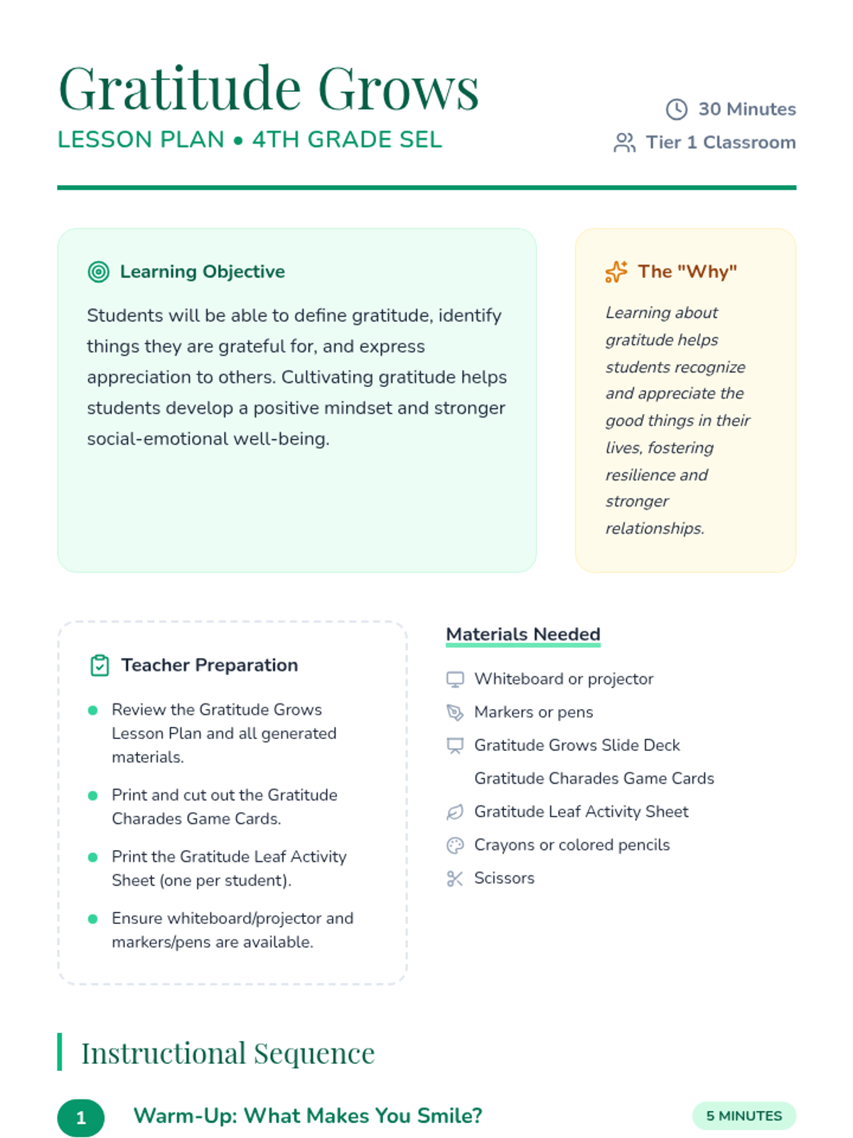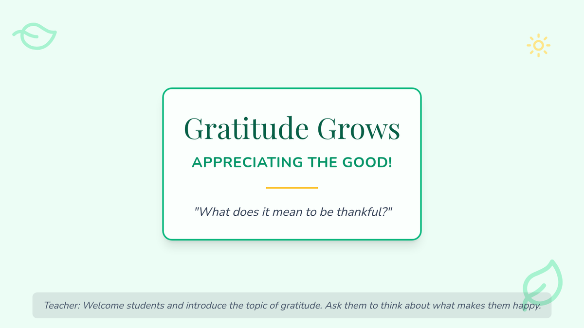 A 30-minute lesson for 4th-grade students to explore gratitude through discussion, games, and creative activities, fostering a positive mindset and social-emotional well-being.