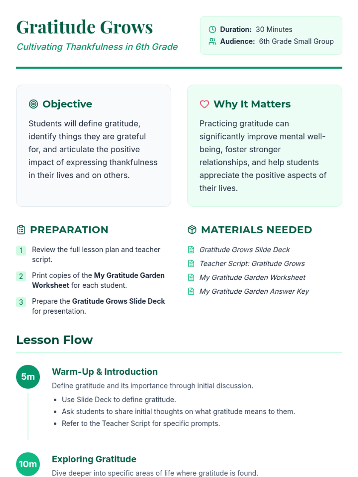 A 30-minute small group lesson for 6th graders to explore and express gratitude through a 'Gratitude Garden' metaphor, fostering well-being and positive relationships.