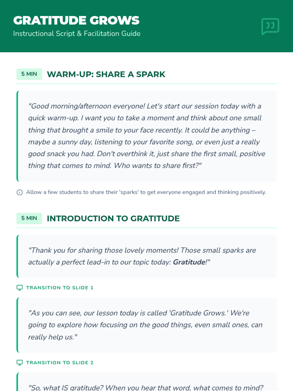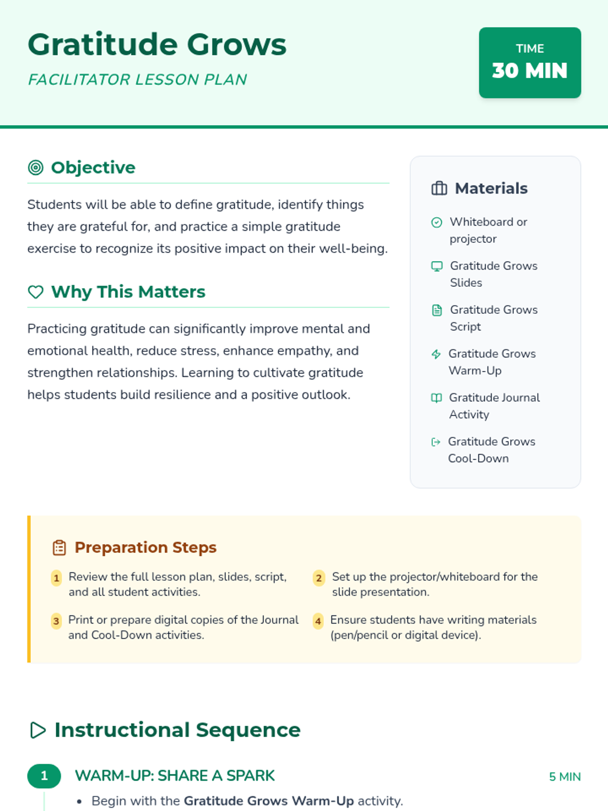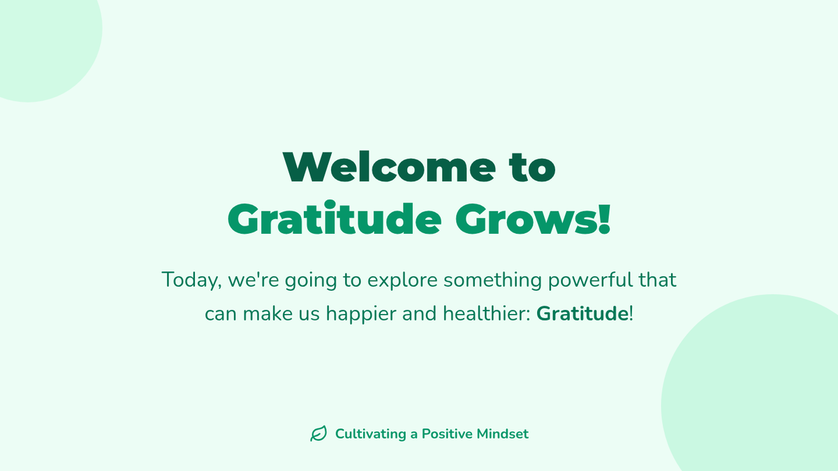This 30-minute lesson for 7th-grade students introduces the concept of gratitude and its positive impact on mental well-being. Through interactive discussion and personal reflection, students learn practical strategies to cultivate a more positive mindset.