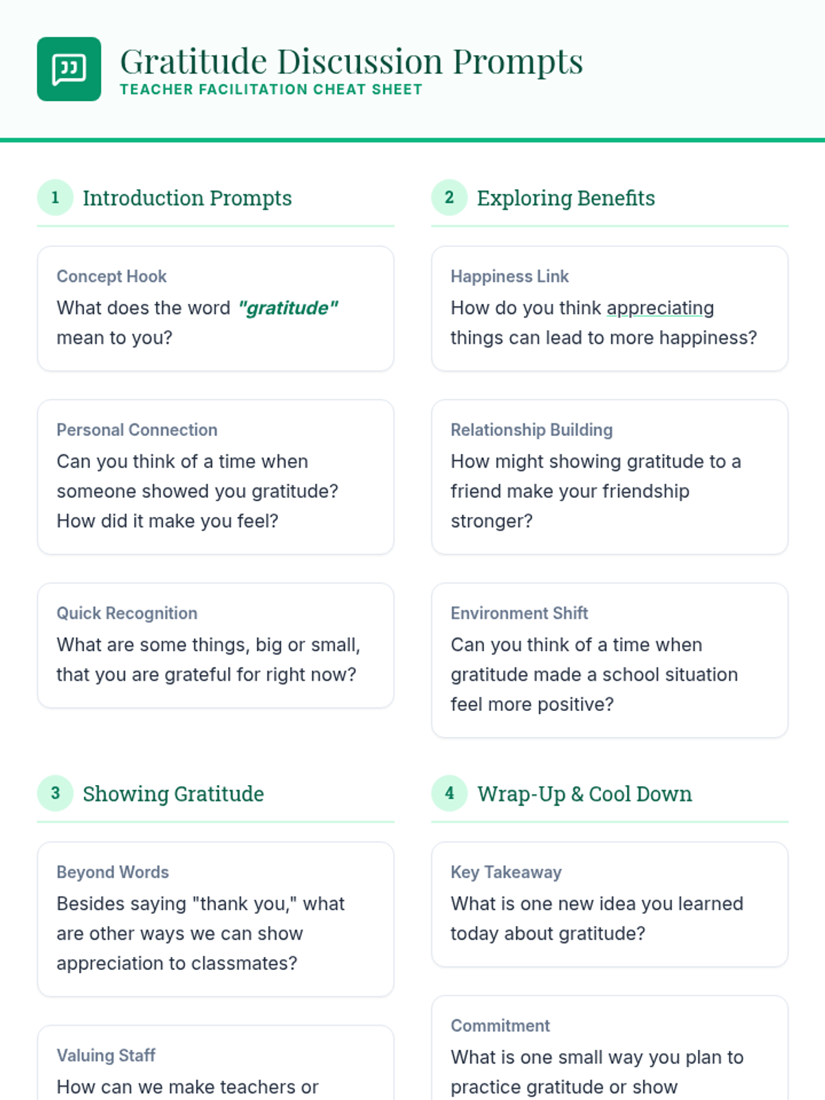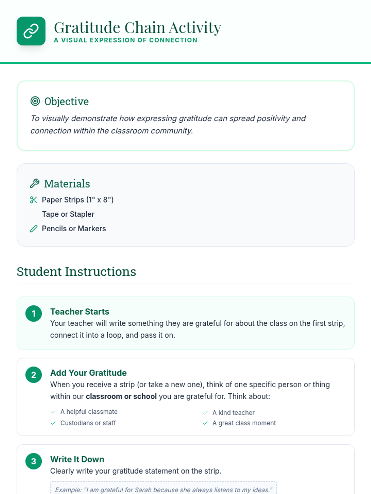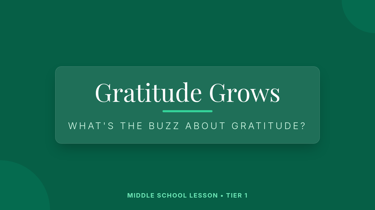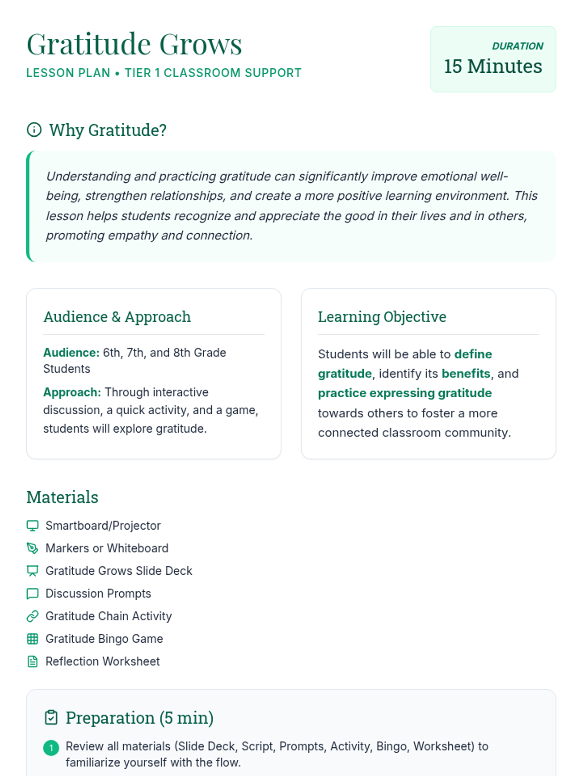 A 15-minute middle school lesson focused on defining gratitude, exploring its benefits, and practicing expressions of appreciation through interactive activities like a gratitude chain and bingo.