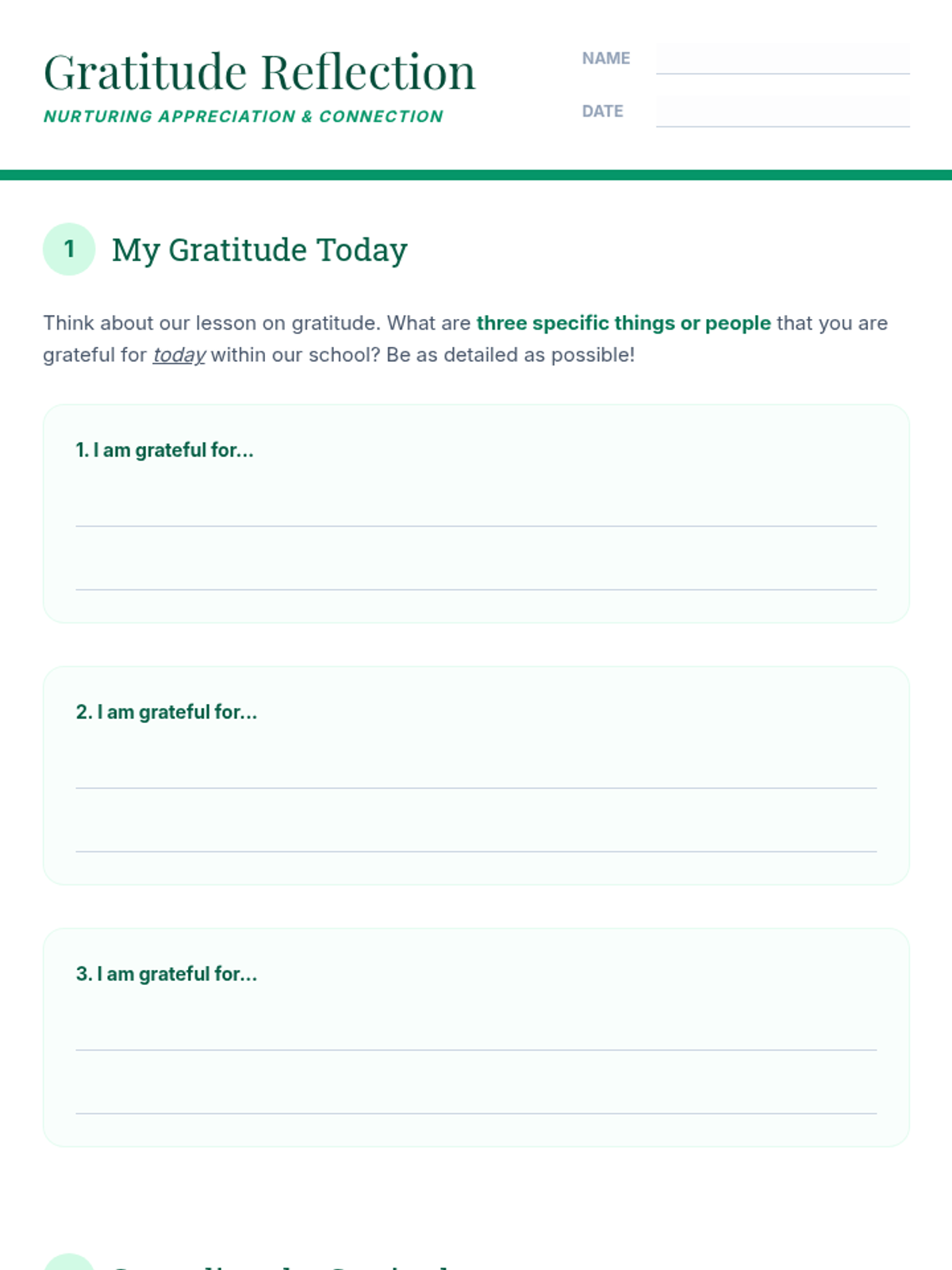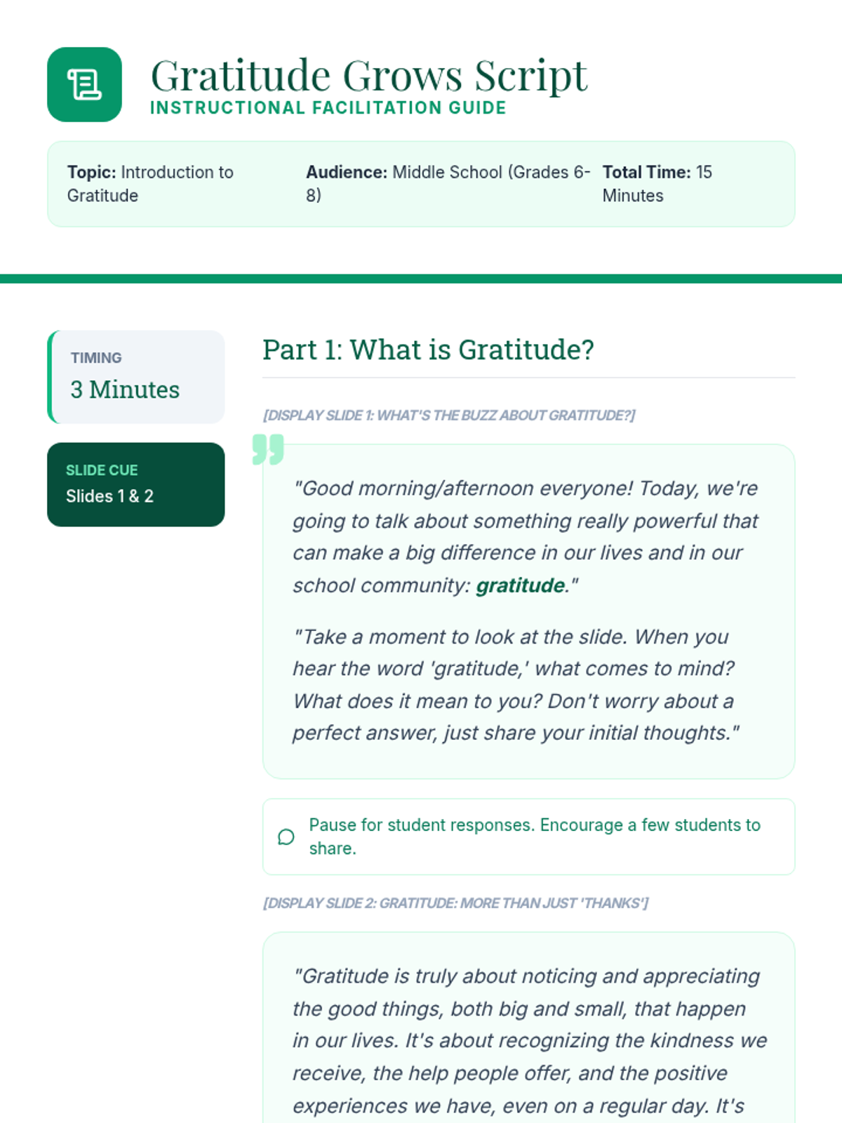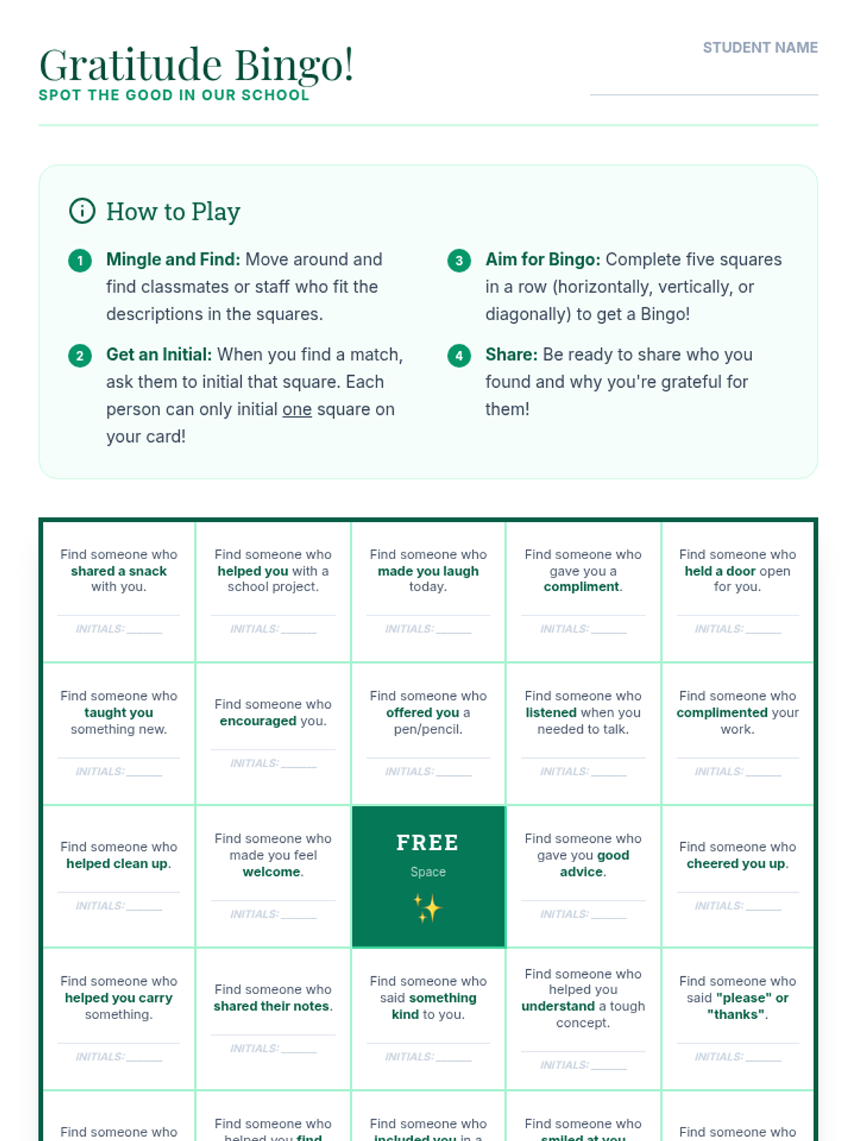 A 15-minute middle school lesson focused on defining gratitude, exploring its benefits, and practicing expressions of appreciation through interactive activities like a gratitude chain and bingo.