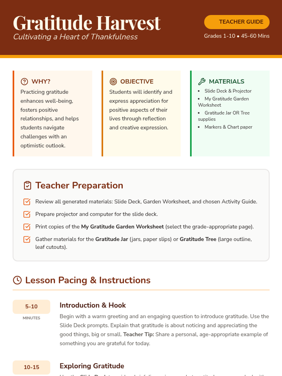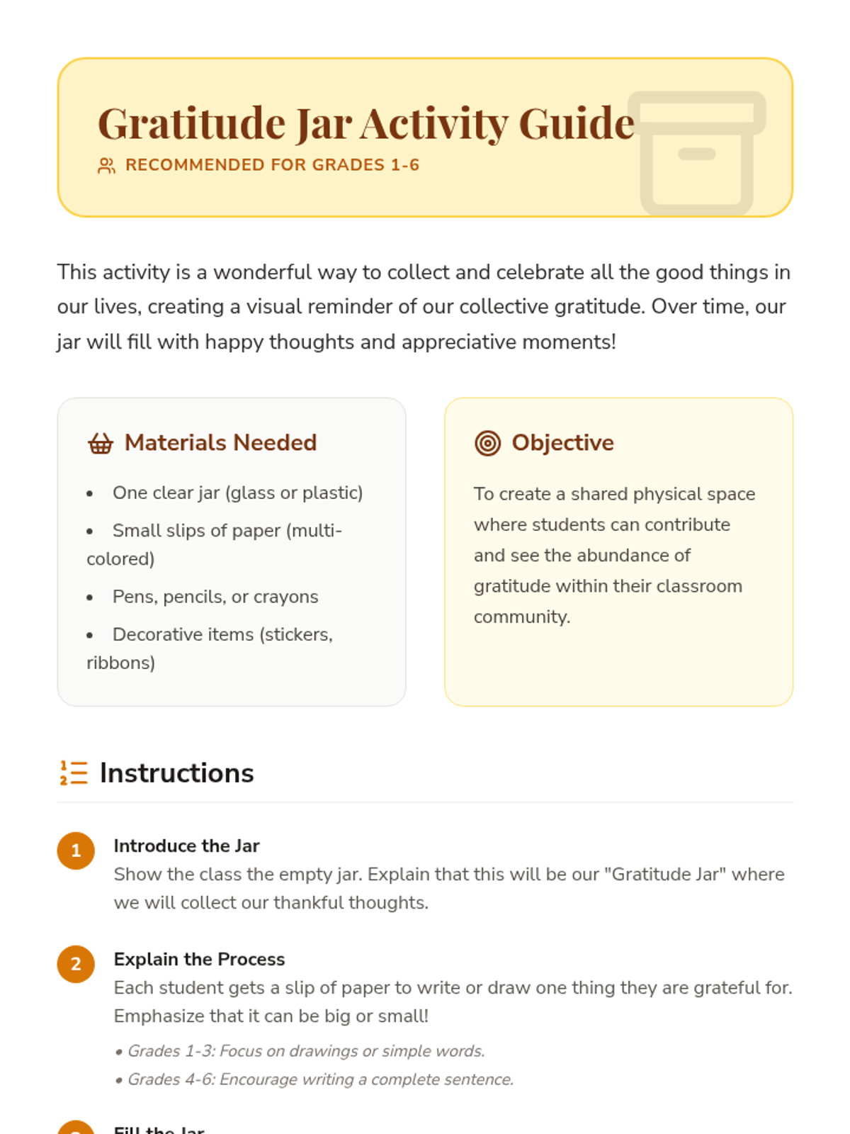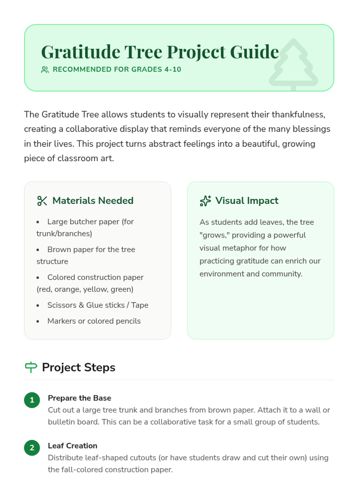 This resource encourages students to cultivate an attitude of gratitude and appreciate the positive aspects of their lives through reflective journaling, creative expression, and group sharing activities.