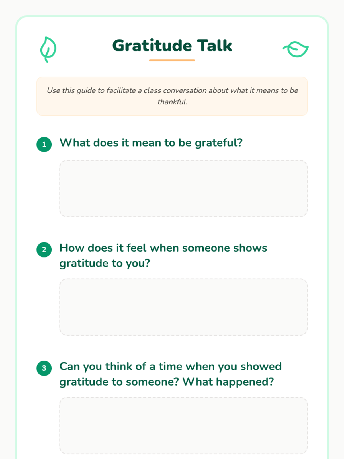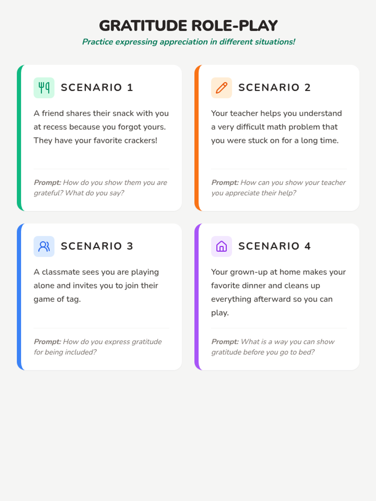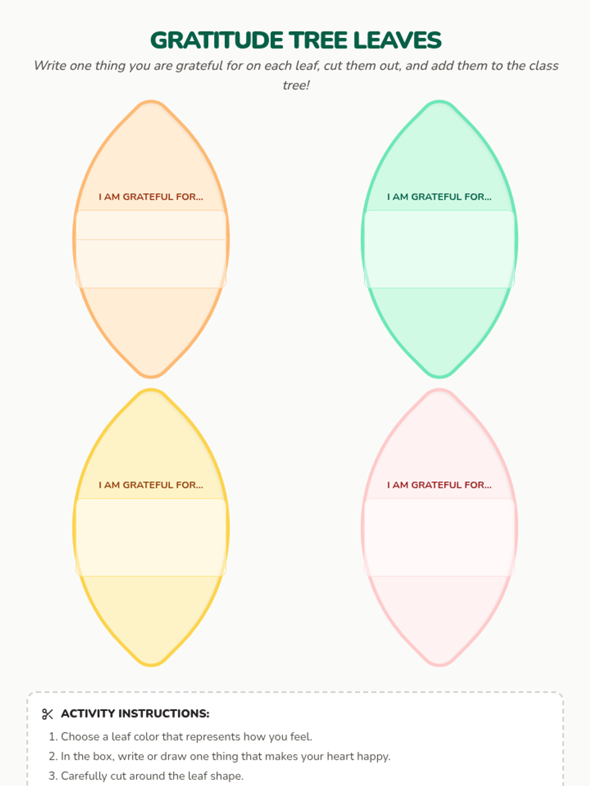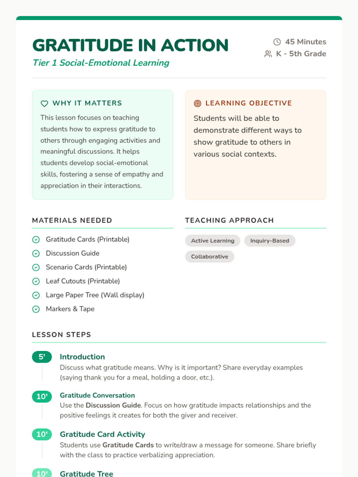 A social-emotional learning lesson for K-5 students focused on understanding and expressing gratitude through cards, a collective gratitude tree, and role-playing.