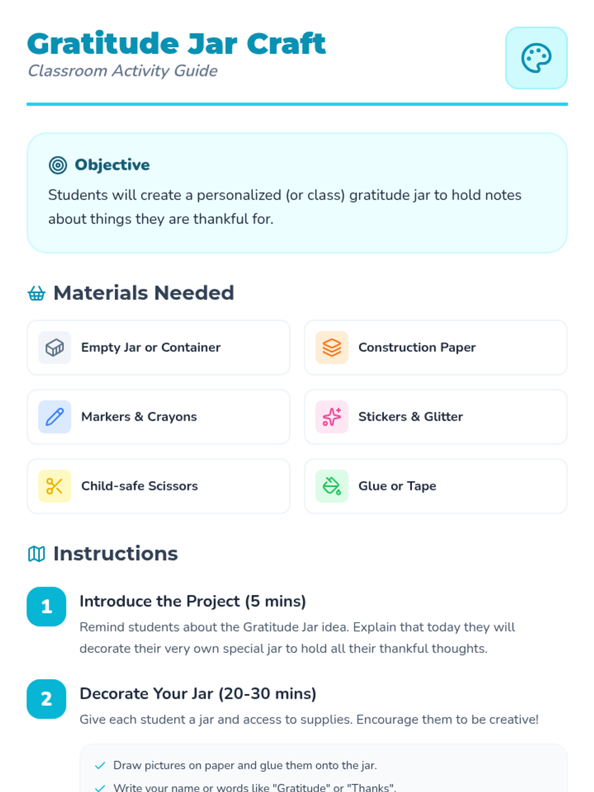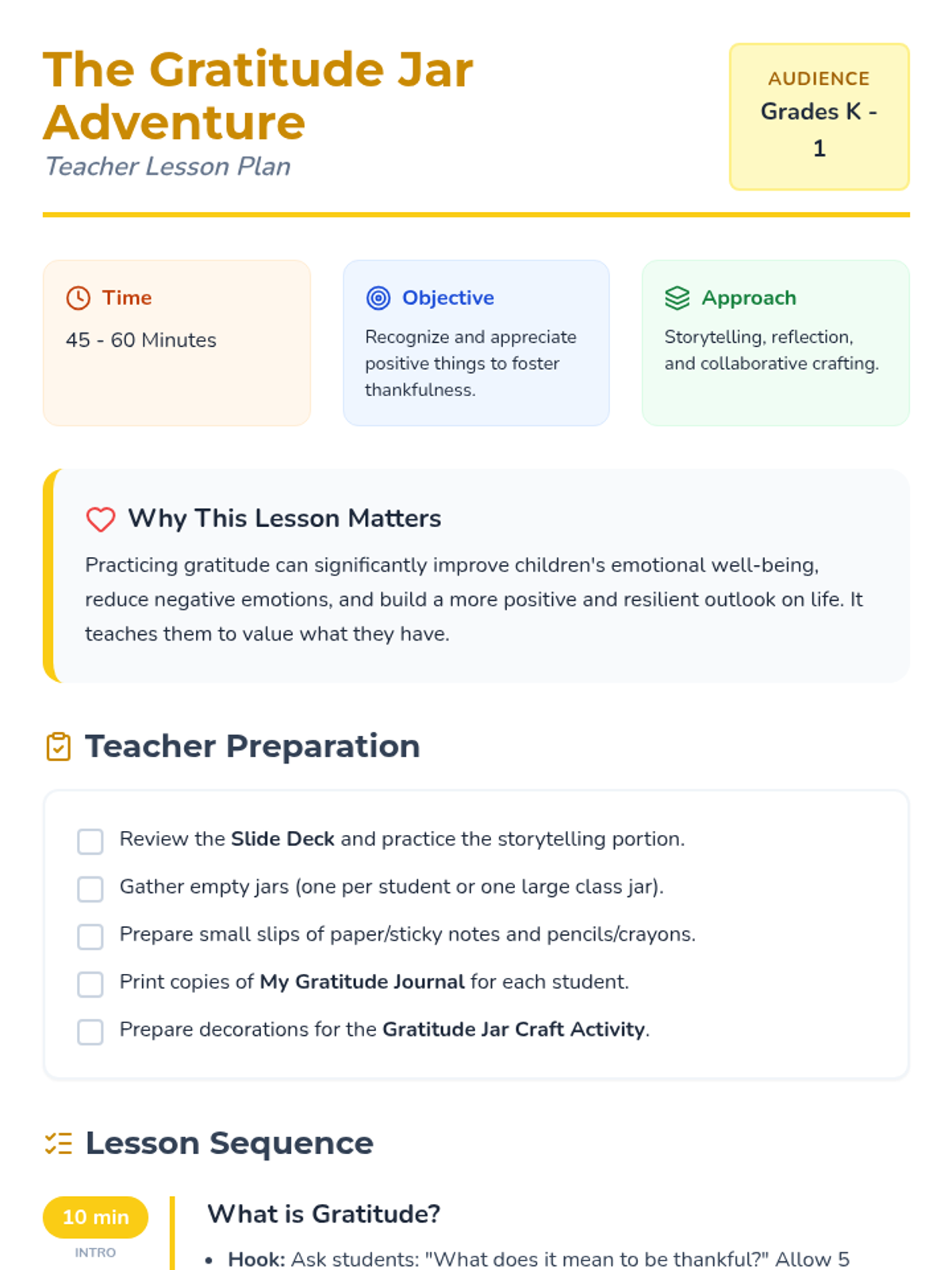 A heartwarming lesson for K-1 students focused on cultivating a positive mindset through storytelling, journaling, and a collaborative craft project. Students learn to identify and celebrate daily moments of thankfulness.