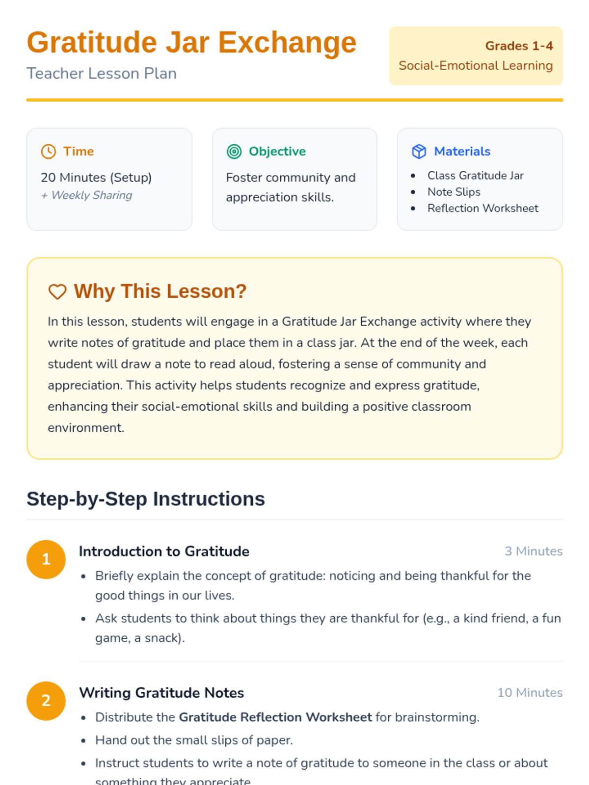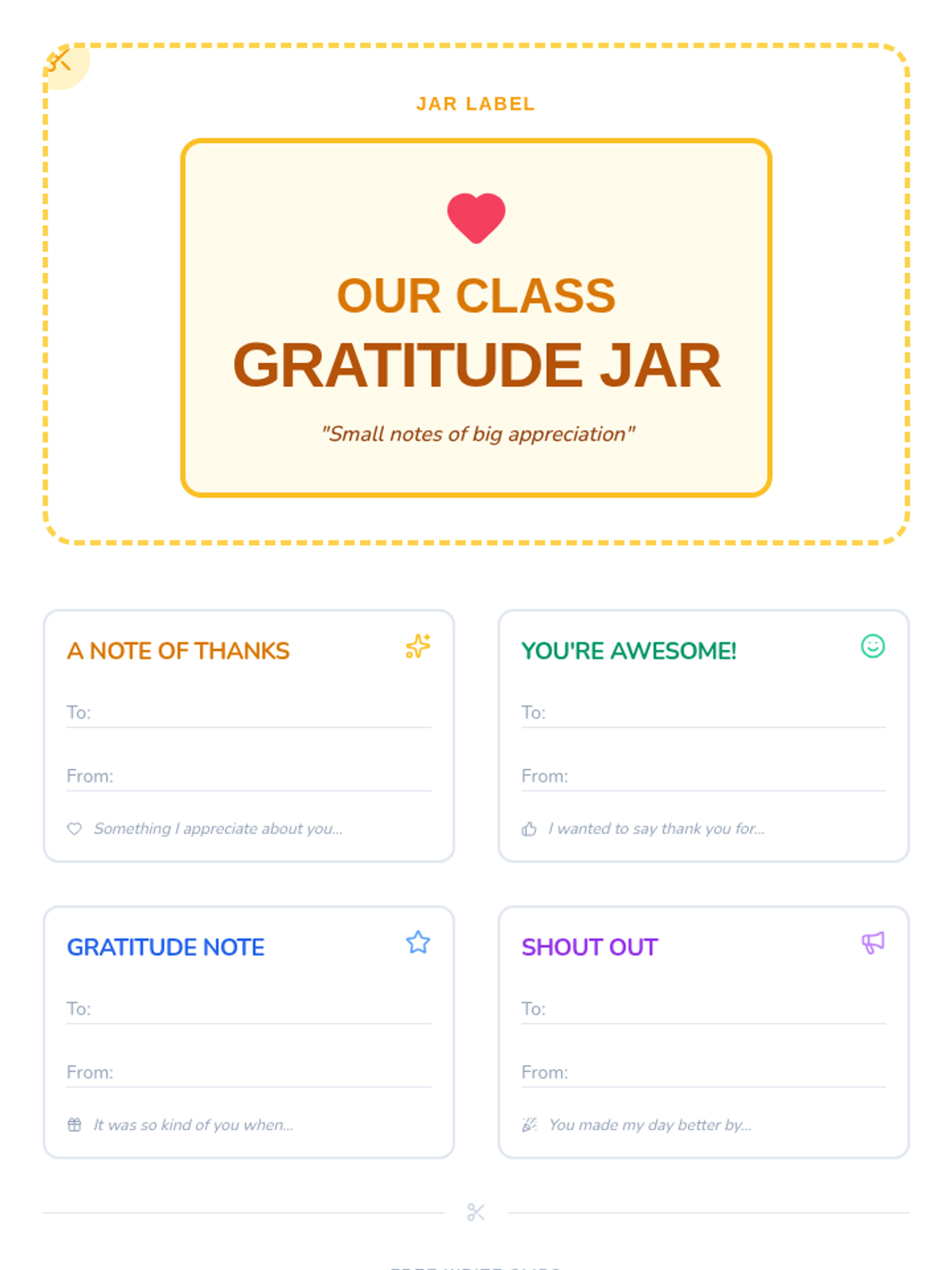 Students will participate in a community-building activity by writing and sharing notes of appreciation. This lesson fosters social-emotional growth through the practice of recognizing and expressing gratitude for classmates and daily experiences.