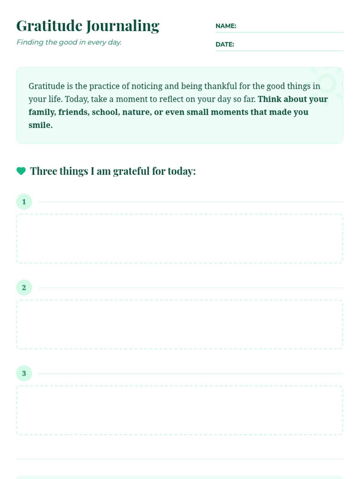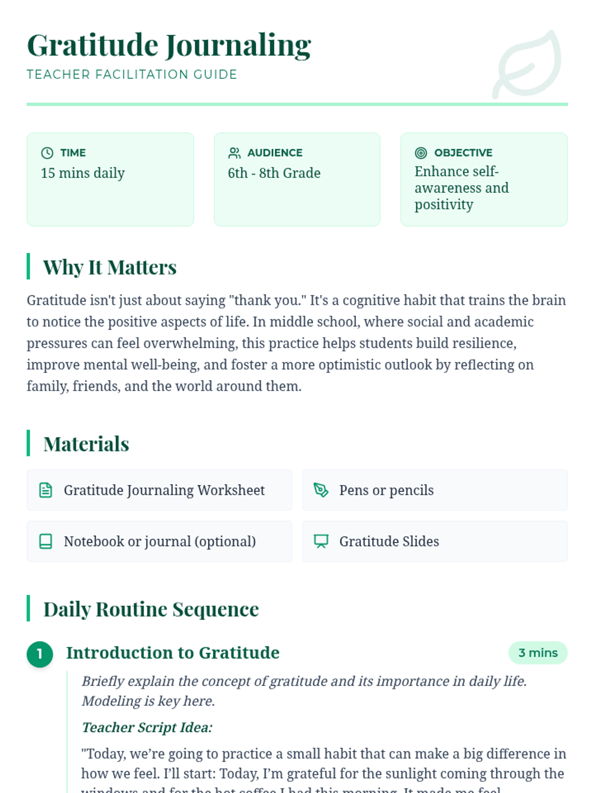 A lesson designed to introduce middle school students to the practice of gratitude journaling. Students will learn the benefits of gratitude and begin a daily habit of reflecting on positive aspects of their lives to improve mental well-being and self-awareness.