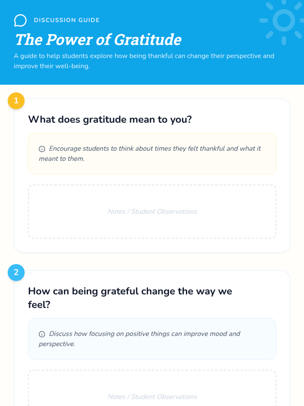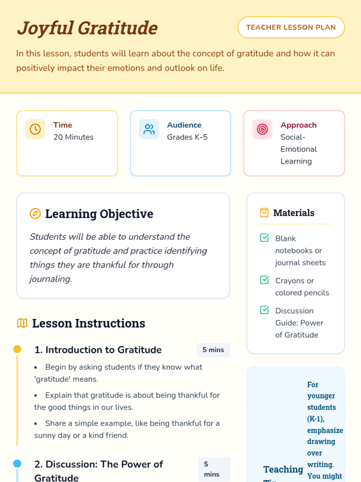 A lesson introducing K-5 students to the concept of gratitude through discussion and the creation of personal gratitude journals to build emotional resilience.