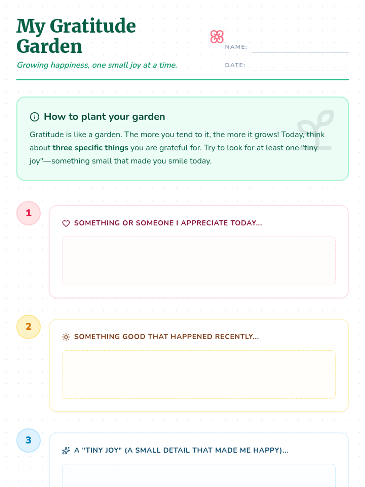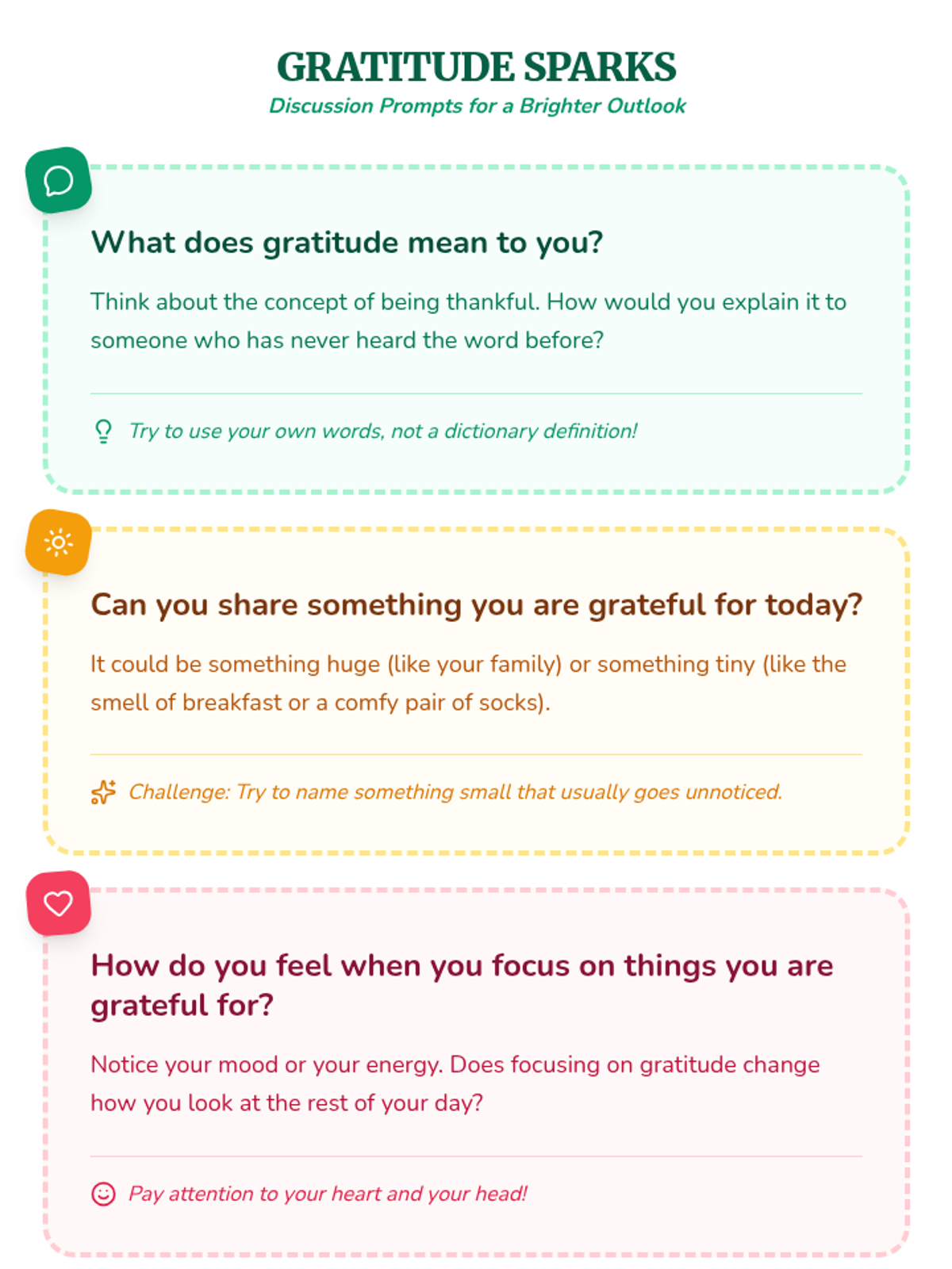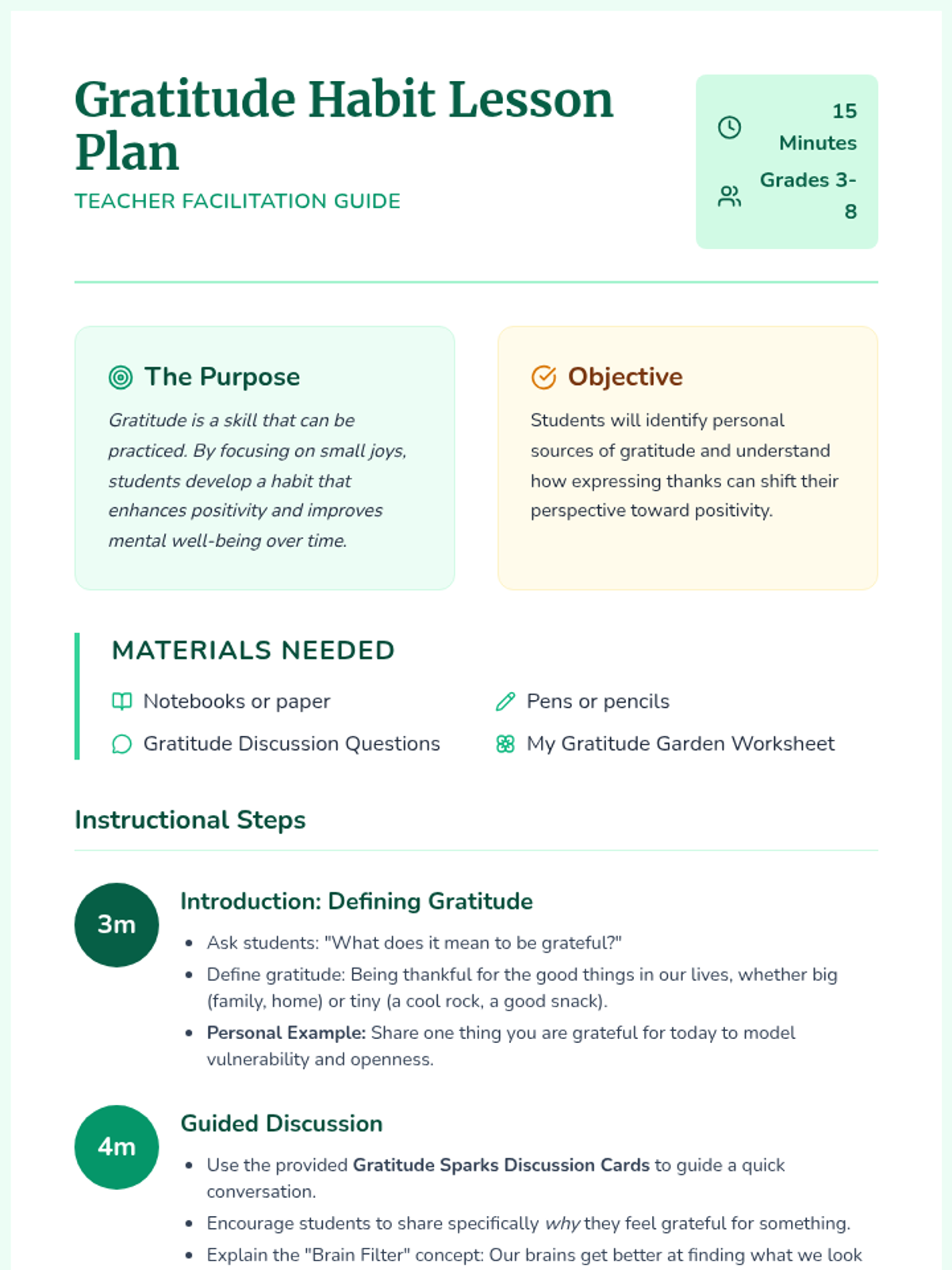 Students explore the power of gratitude through discussion and a journaling activity, learning how to focus on small joys to improve mental well-being.