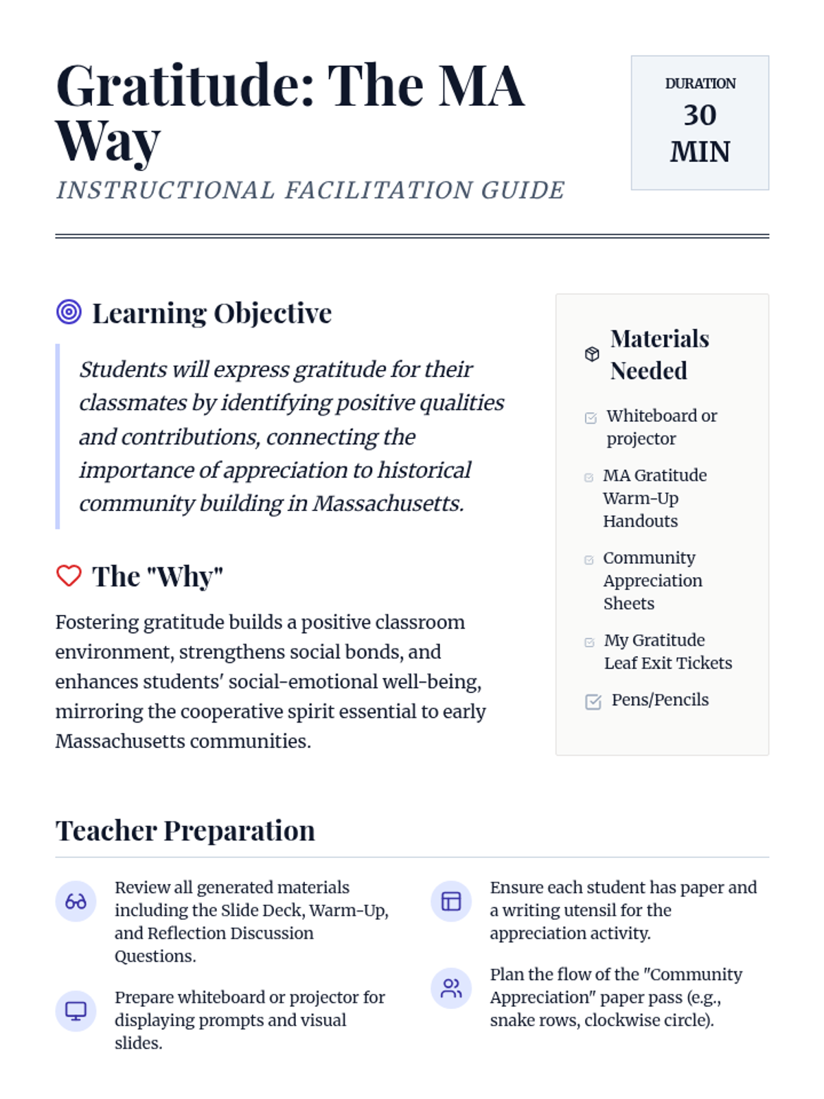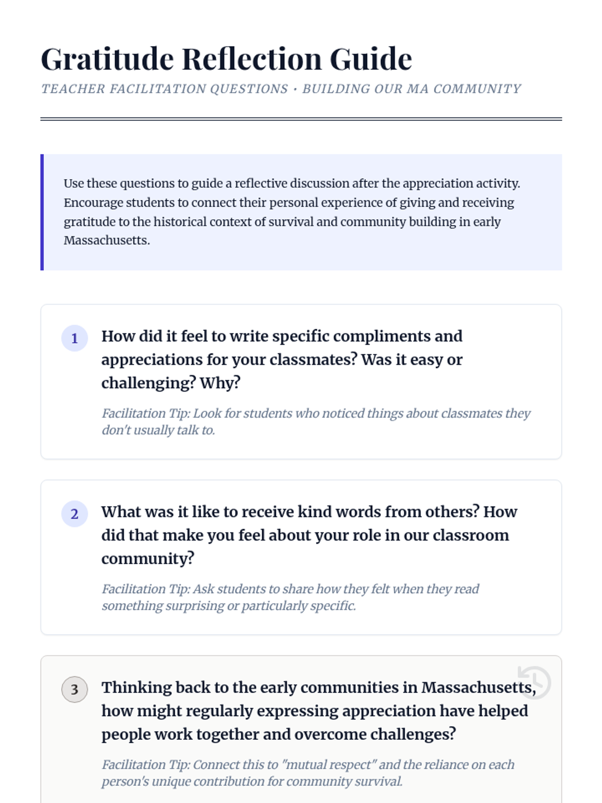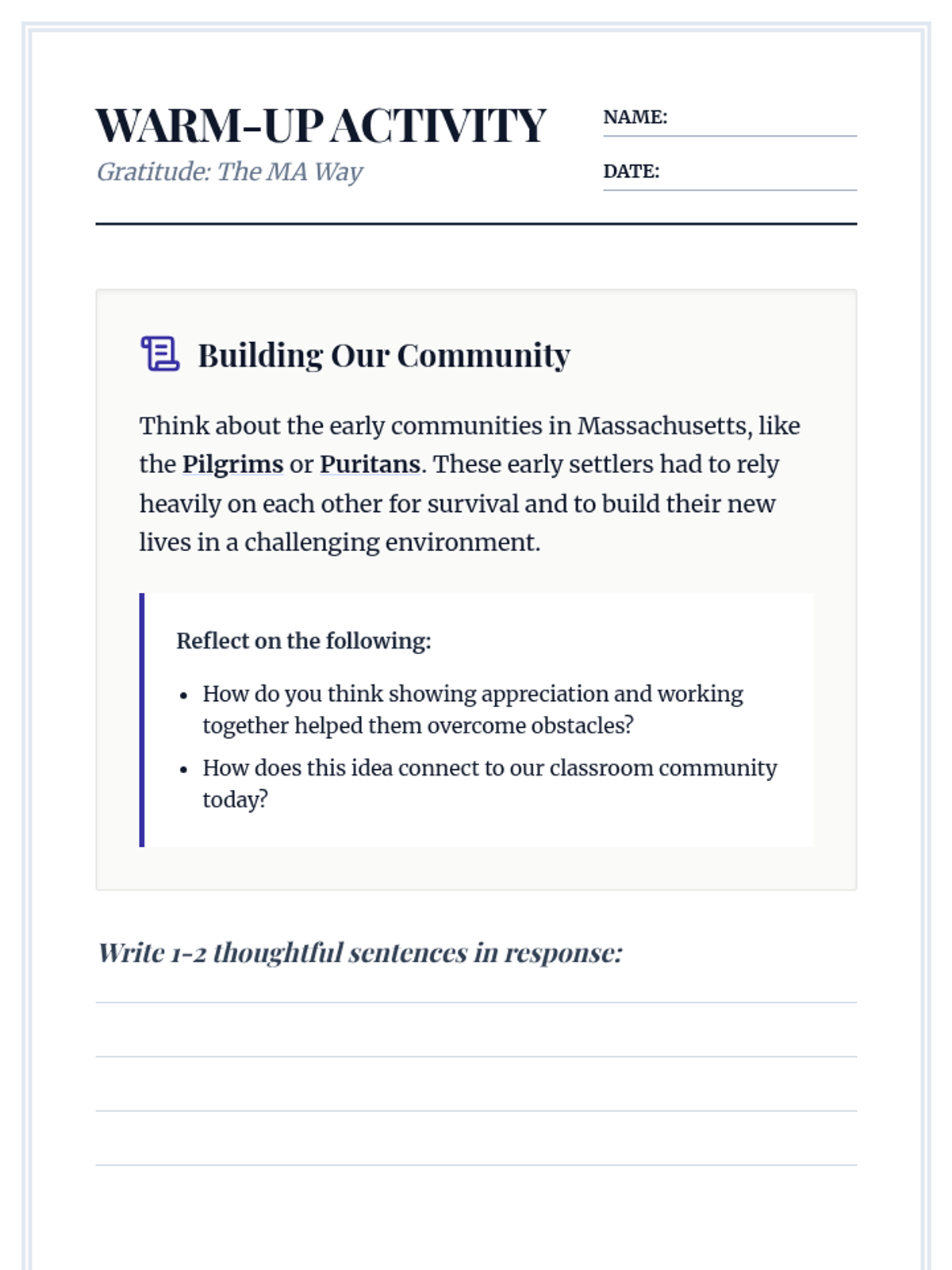 A 30-minute Tier 1 SEL lesson for 7th graders connecting gratitude toward classmates with the historical cooperation of early Massachusetts communities.