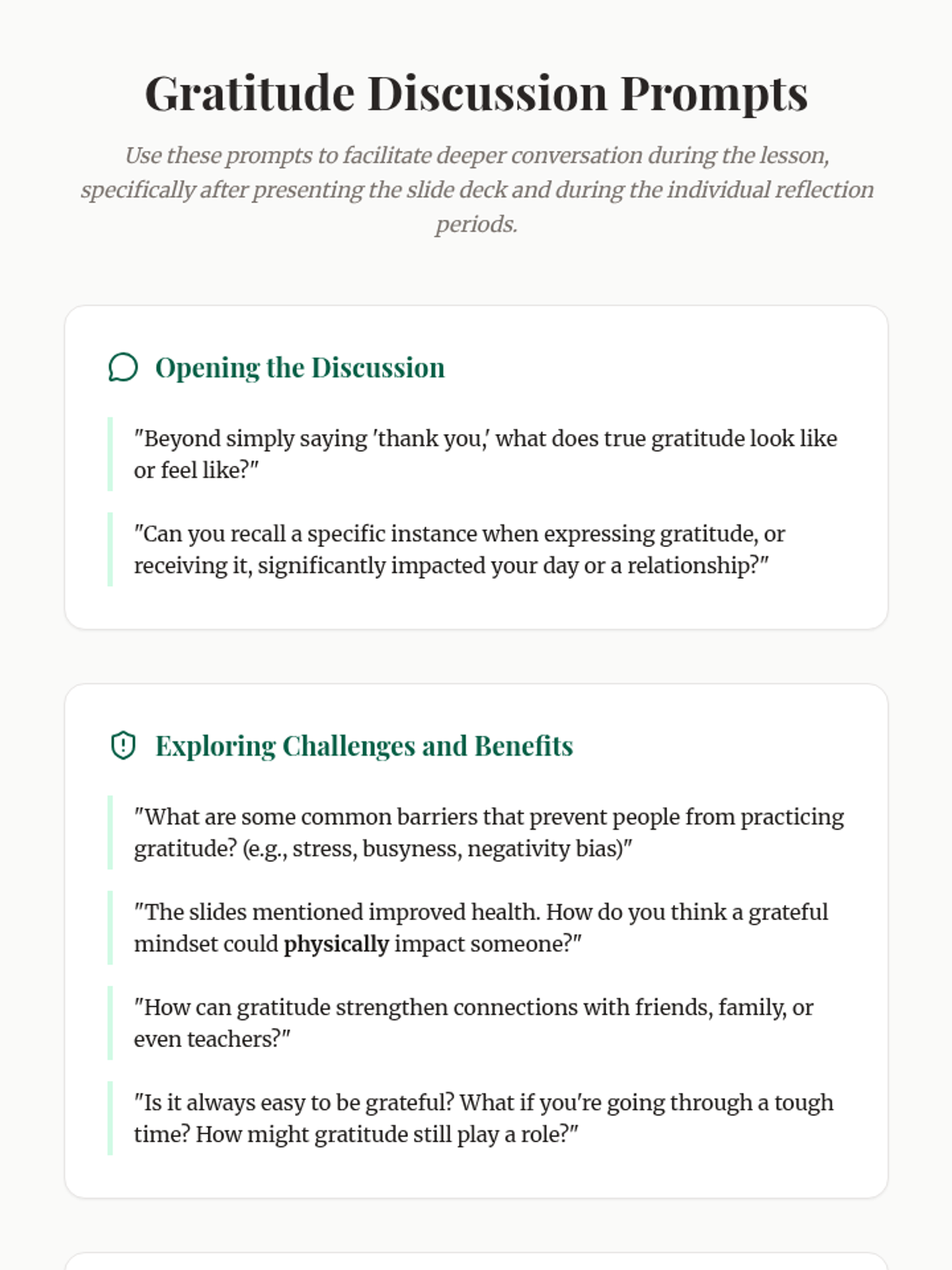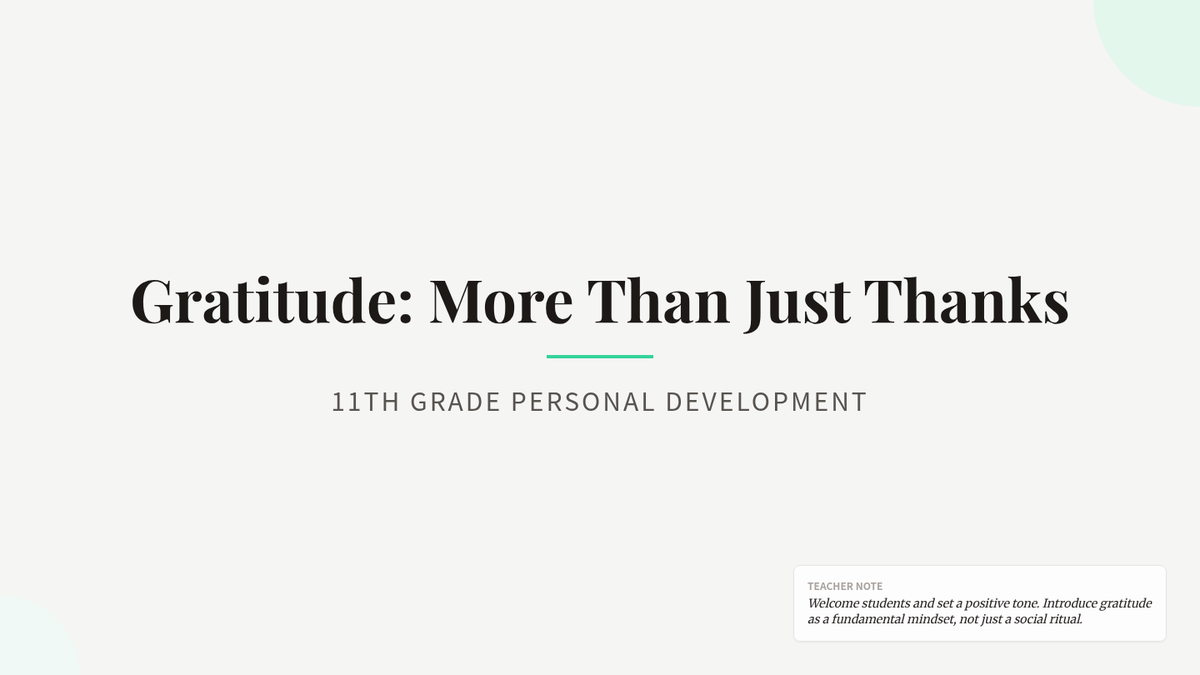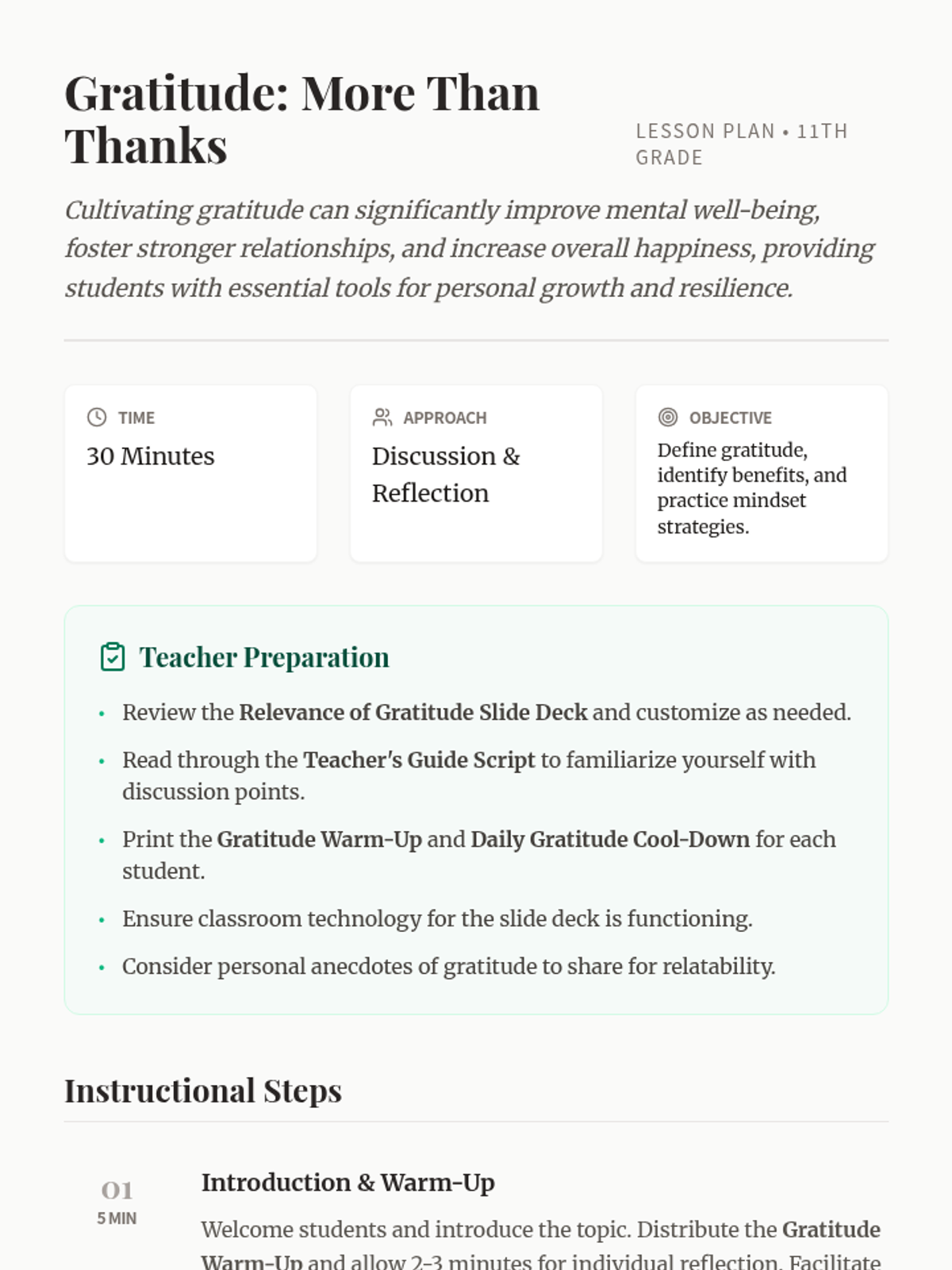 This lesson explores the profound impact of gratitude on personal well-being and relationships for 11th-grade students. Through discussion, reflection, and practical exercises, students discover ways to cultivate a grateful mindset.