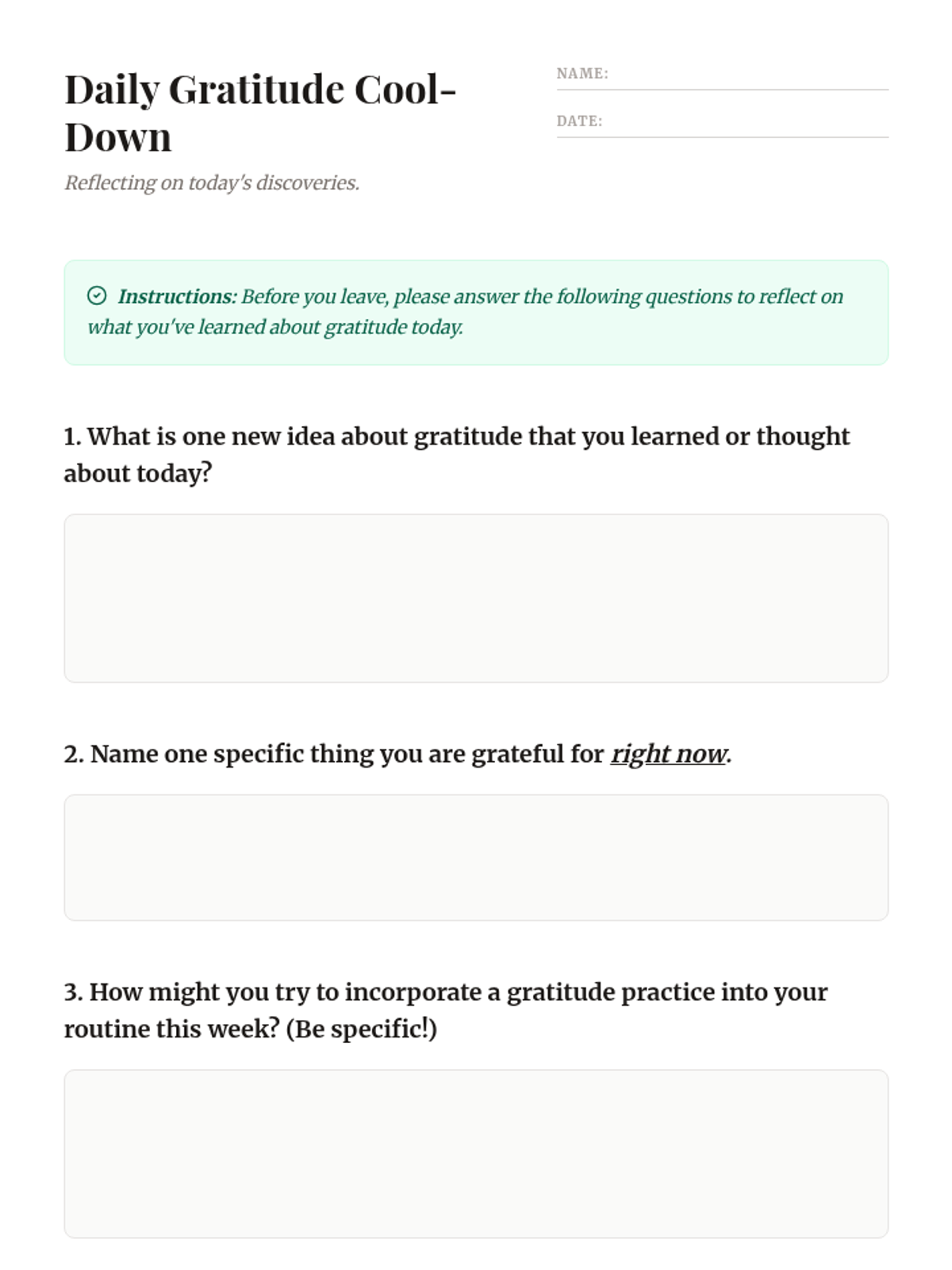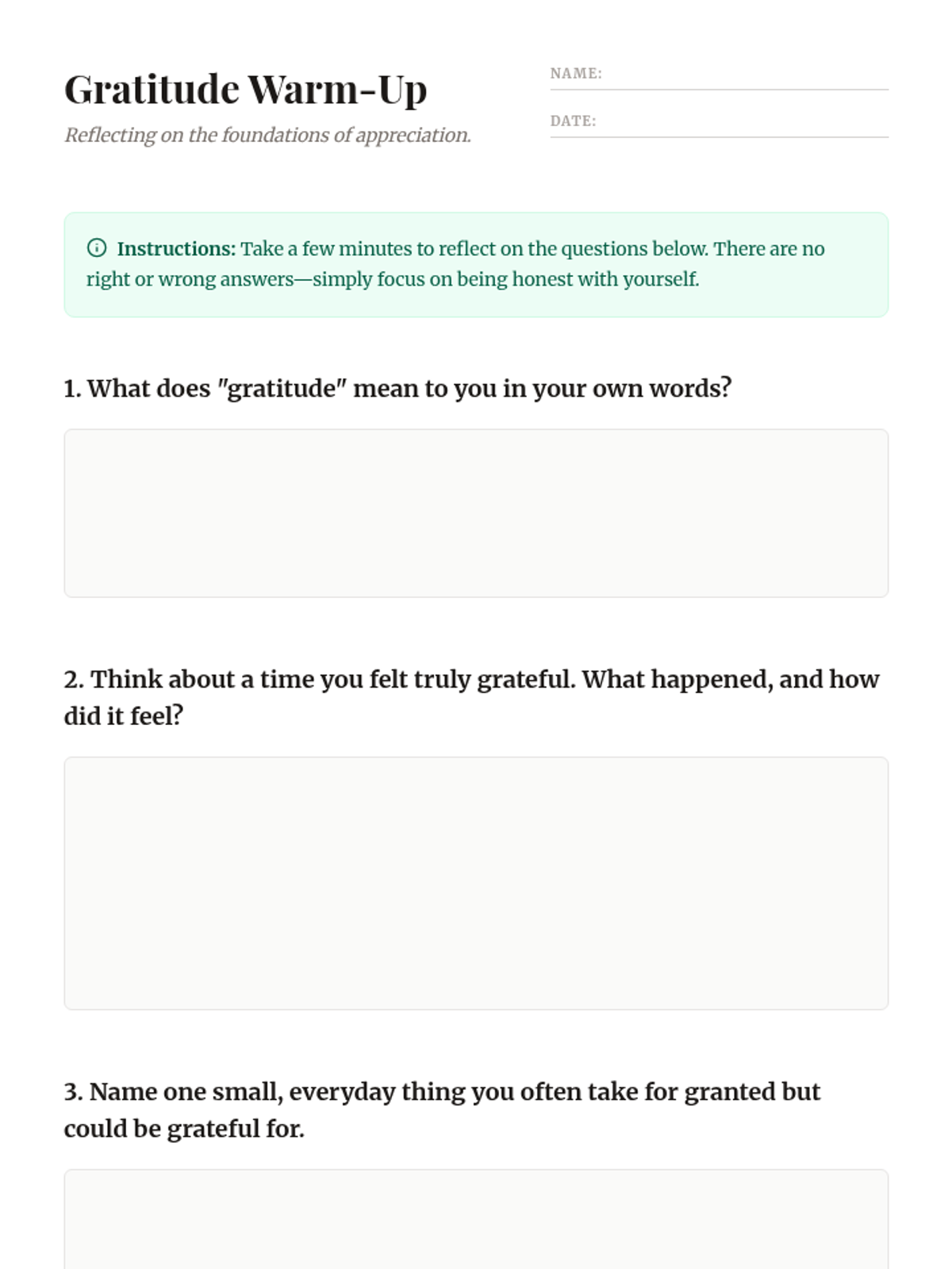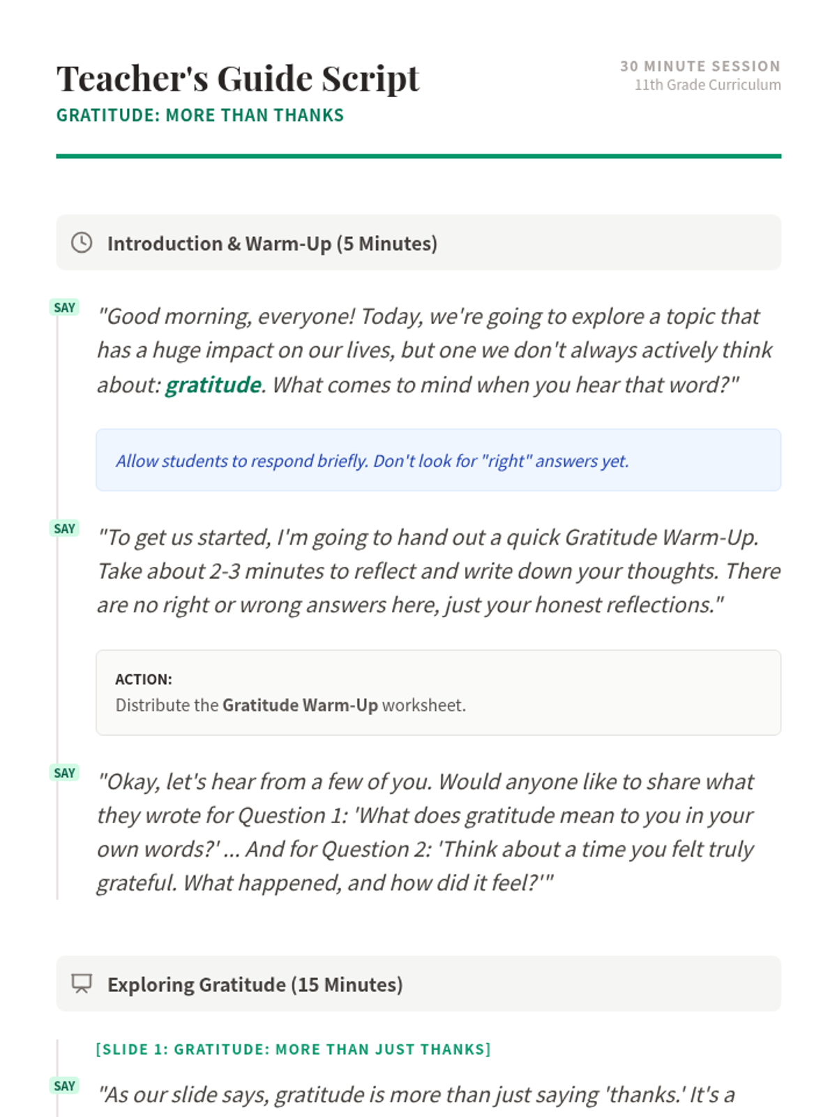 This lesson explores the profound impact of gratitude on personal well-being and relationships for 11th-grade students. Through discussion, reflection, and practical exercises, students discover ways to cultivate a grateful mindset.