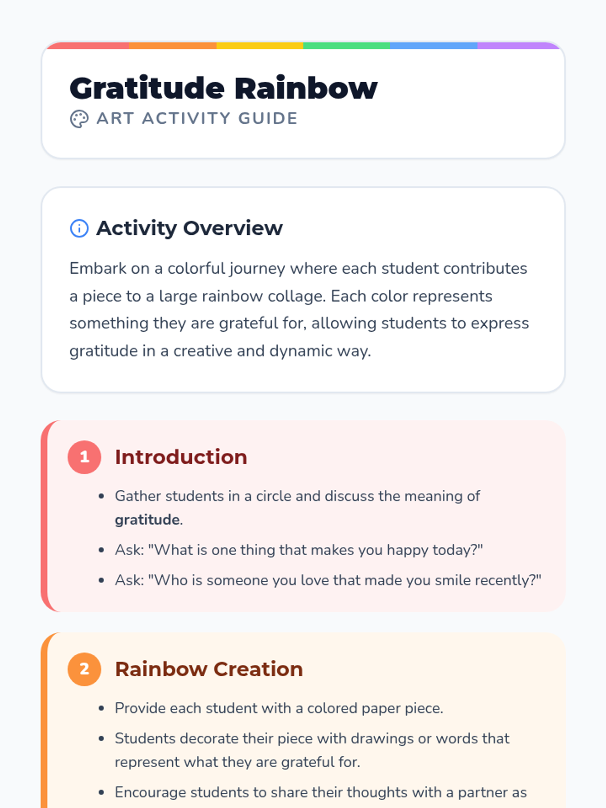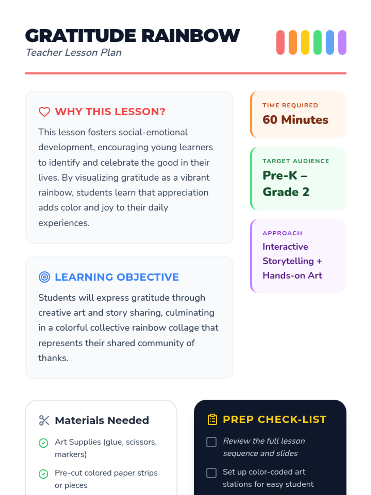 A colorful social-emotional learning lesson for Pre-K to Grade 2 students that uses art and storytelling to explore the concept of gratitude by building a collective rainbow collage.