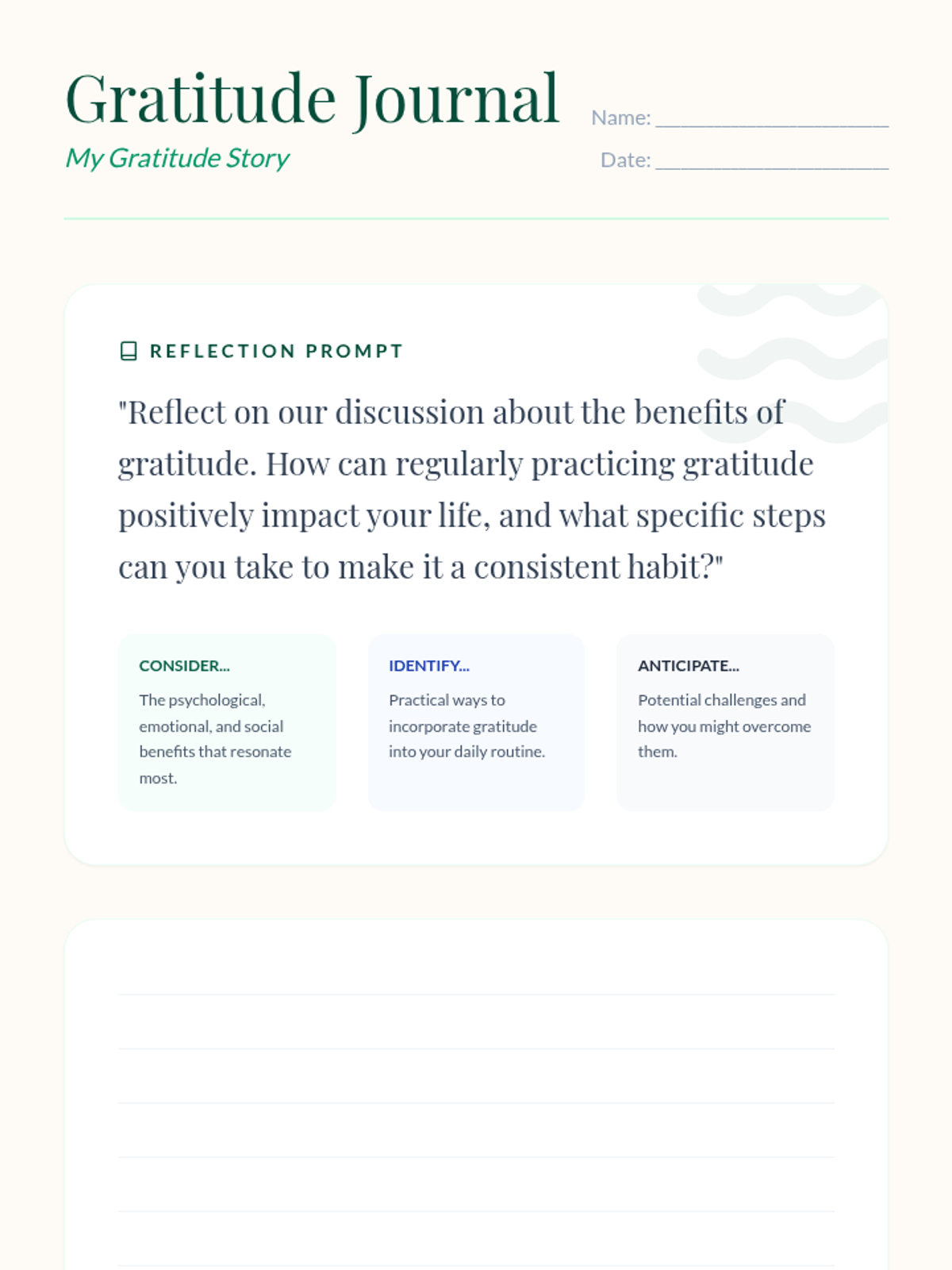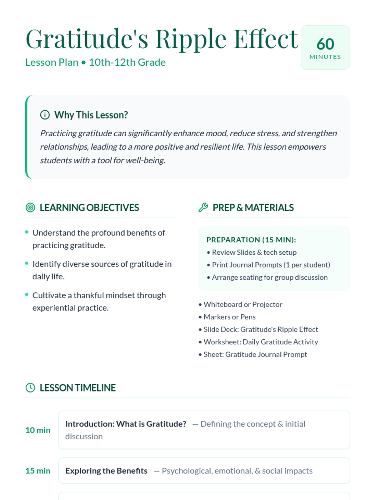A 60-minute lesson for 10th-12th graders exploring the psychological and social benefits of gratitude through discussion, journaling, and experiential practice.