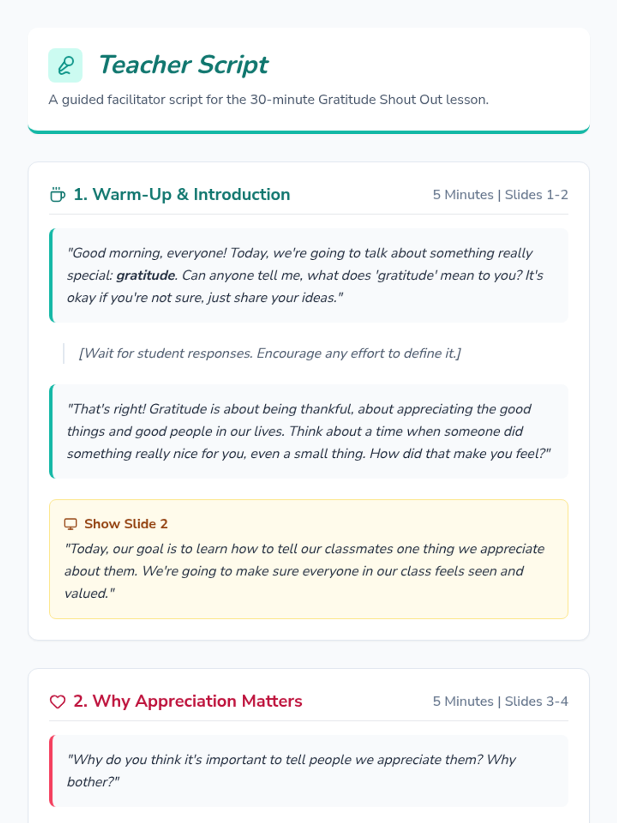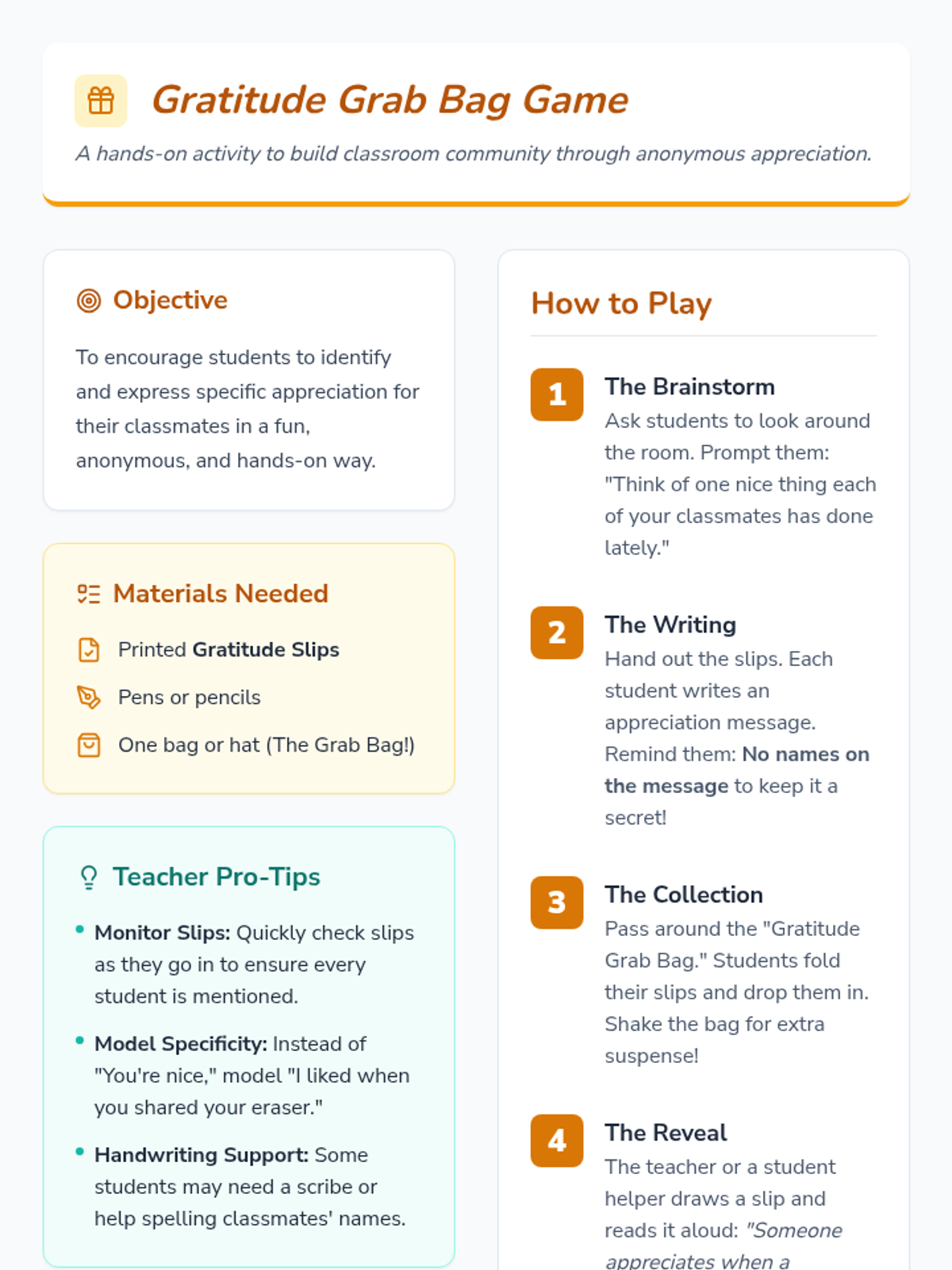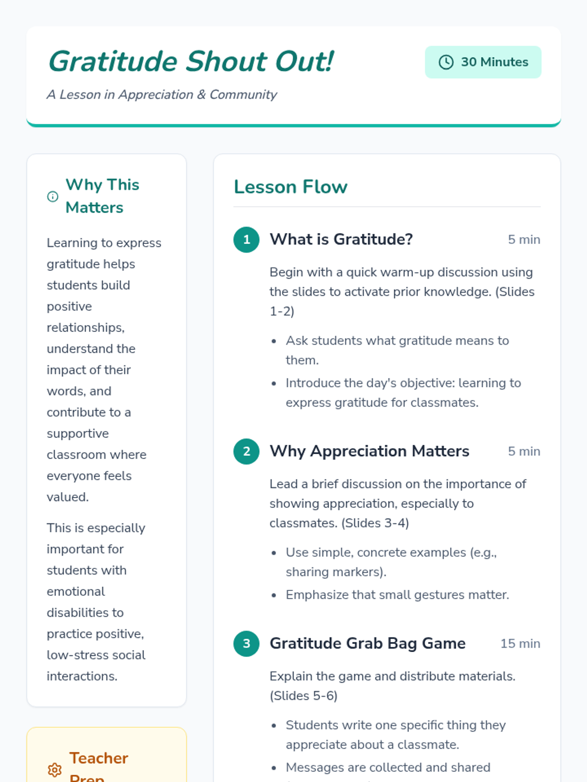 A 30-minute lesson for middle school special education students focusing on recognizing and expressing appreciation for classmates to build a positive classroom community.