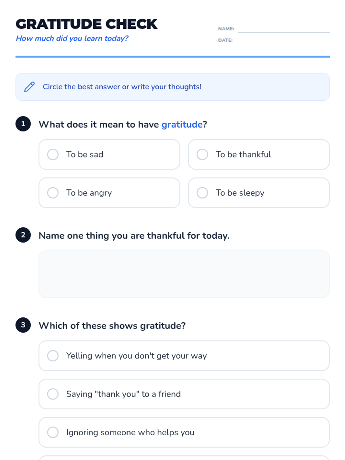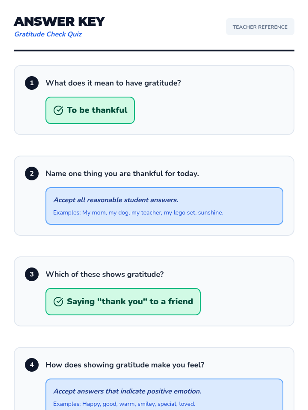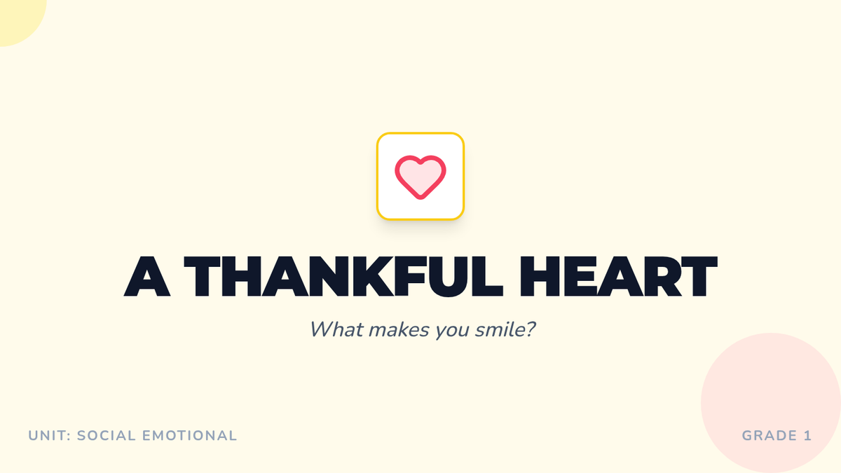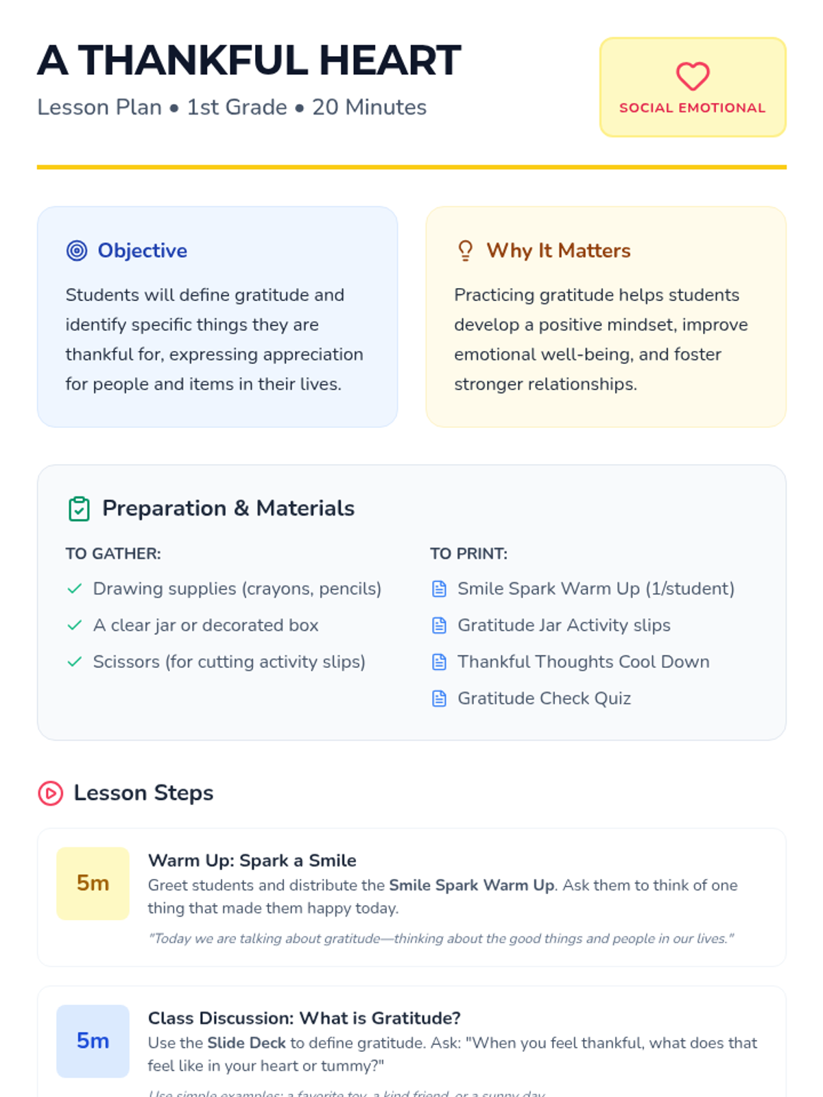 A 20-minute lesson for 1st graders to introduce gratitude, helping them identify things they are thankful for to promote a positive classroom environment.