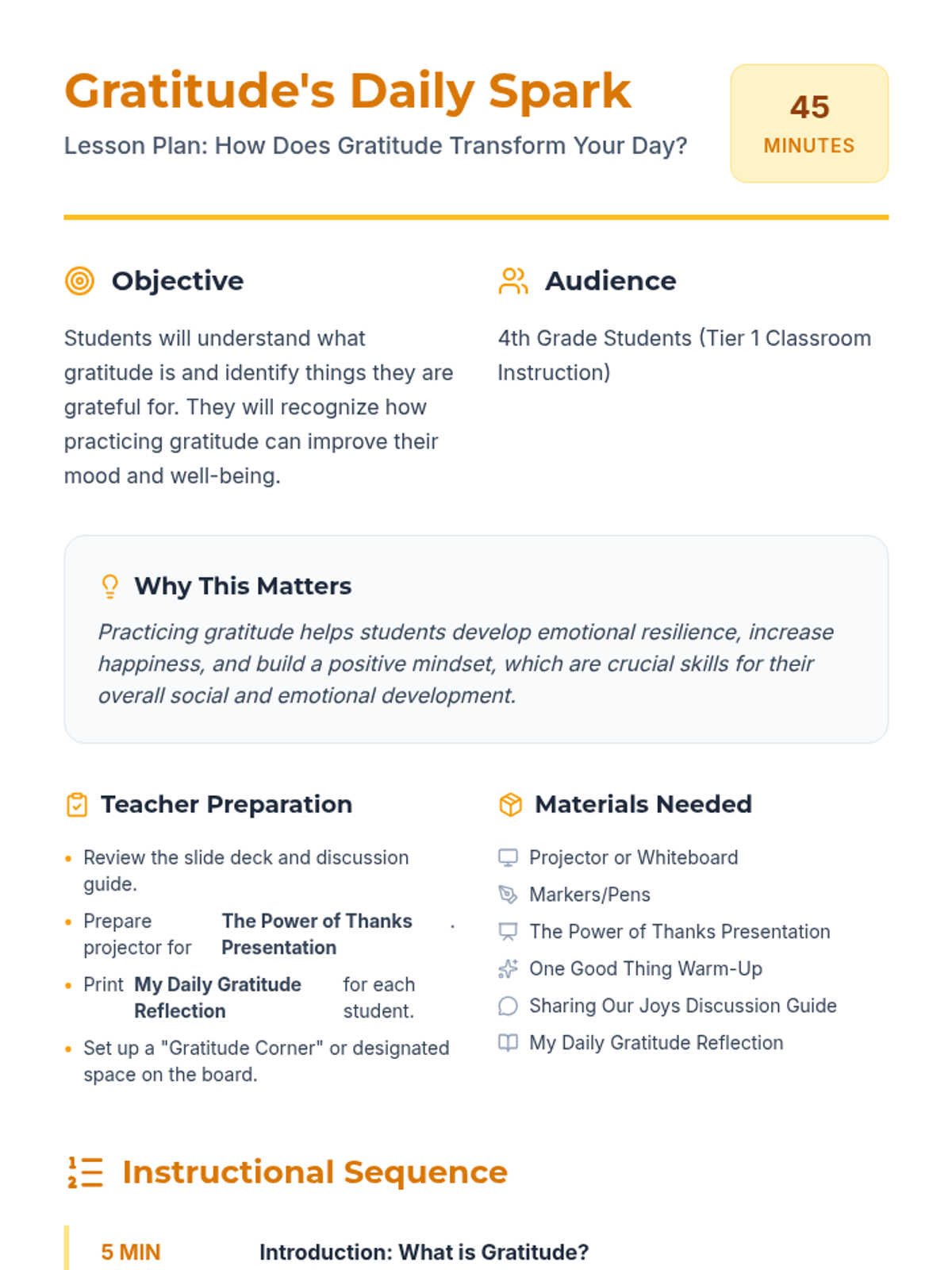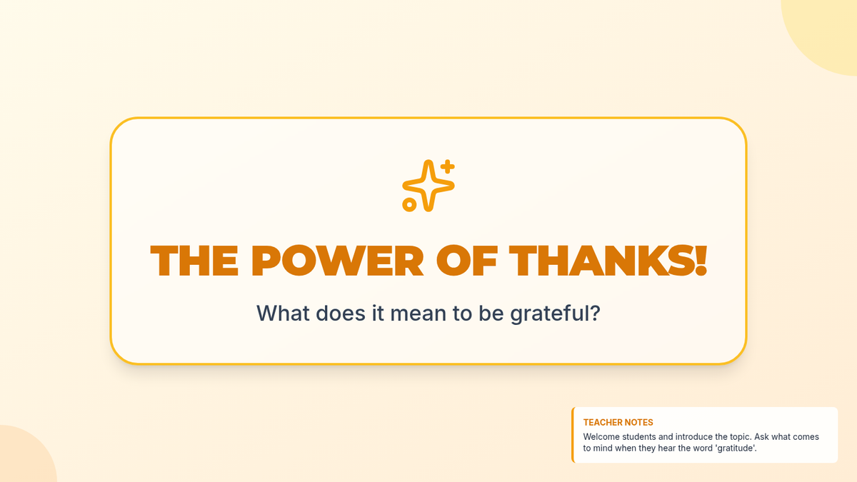 This lesson introduces 4th-grade students to the concept of gratitude, exploring its benefits for emotional resilience and happiness through discussion, presentation, and personal reflection.