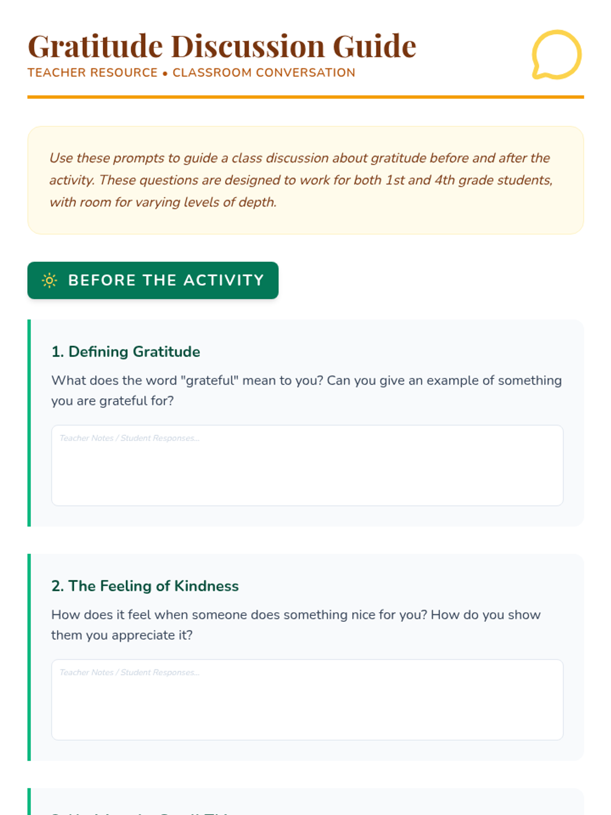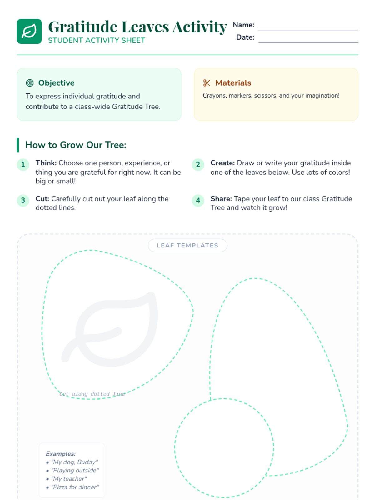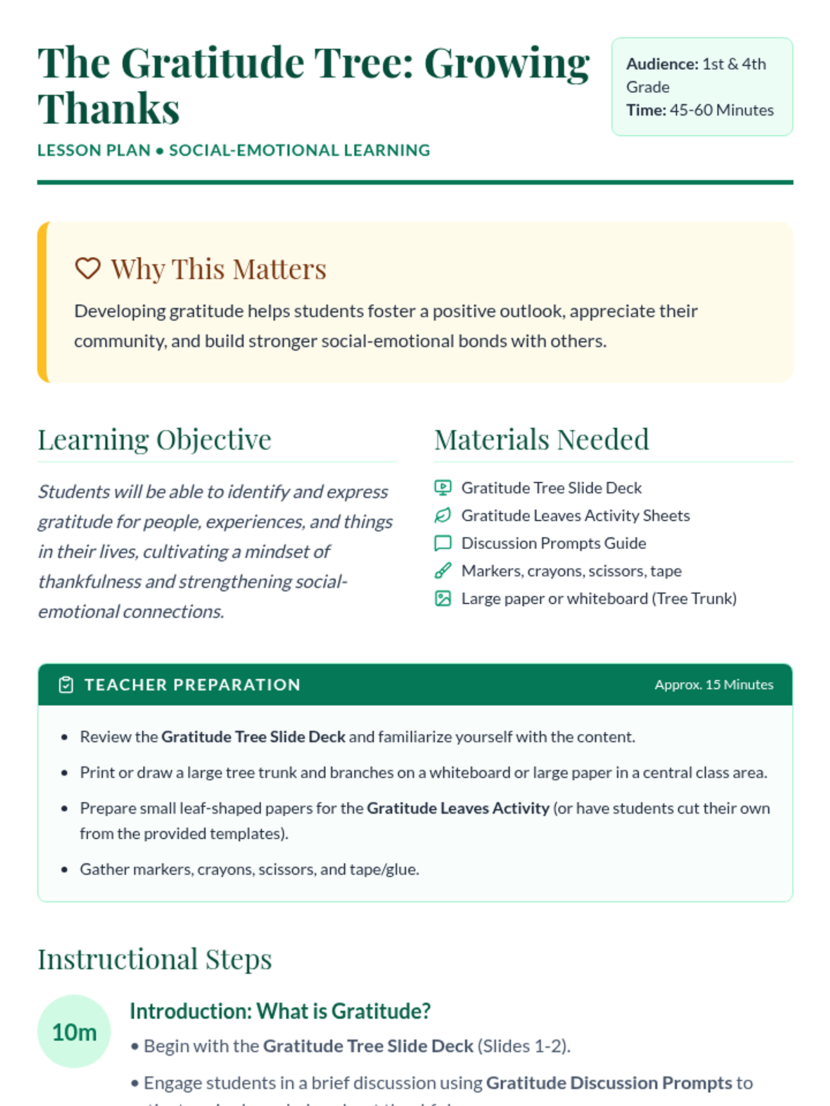 A heartwarming lesson for 1st and 4th graders to identify and express gratitude through the collaborative creation of a class Gratitude Tree, fostering positive social-emotional connections.