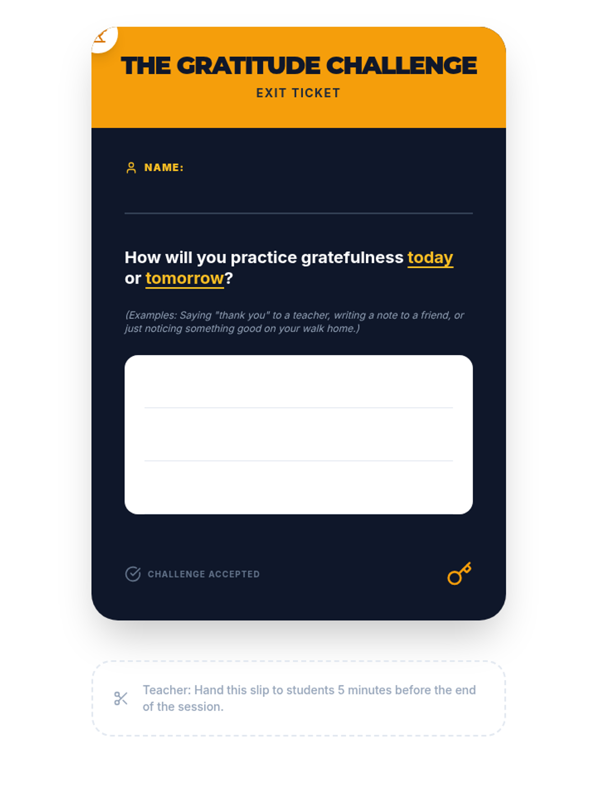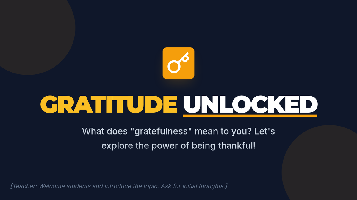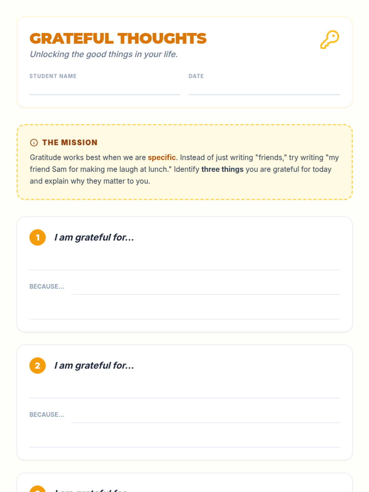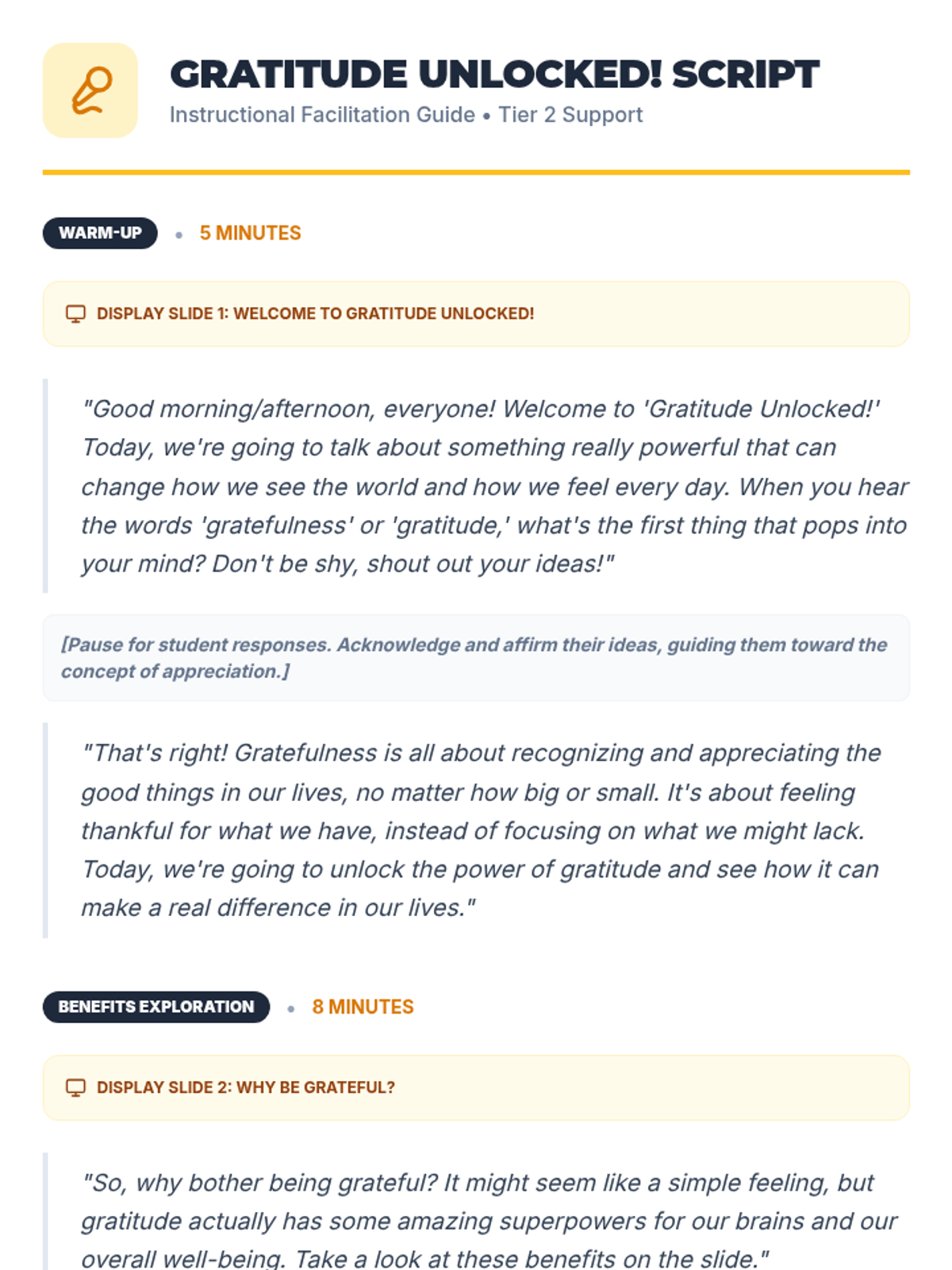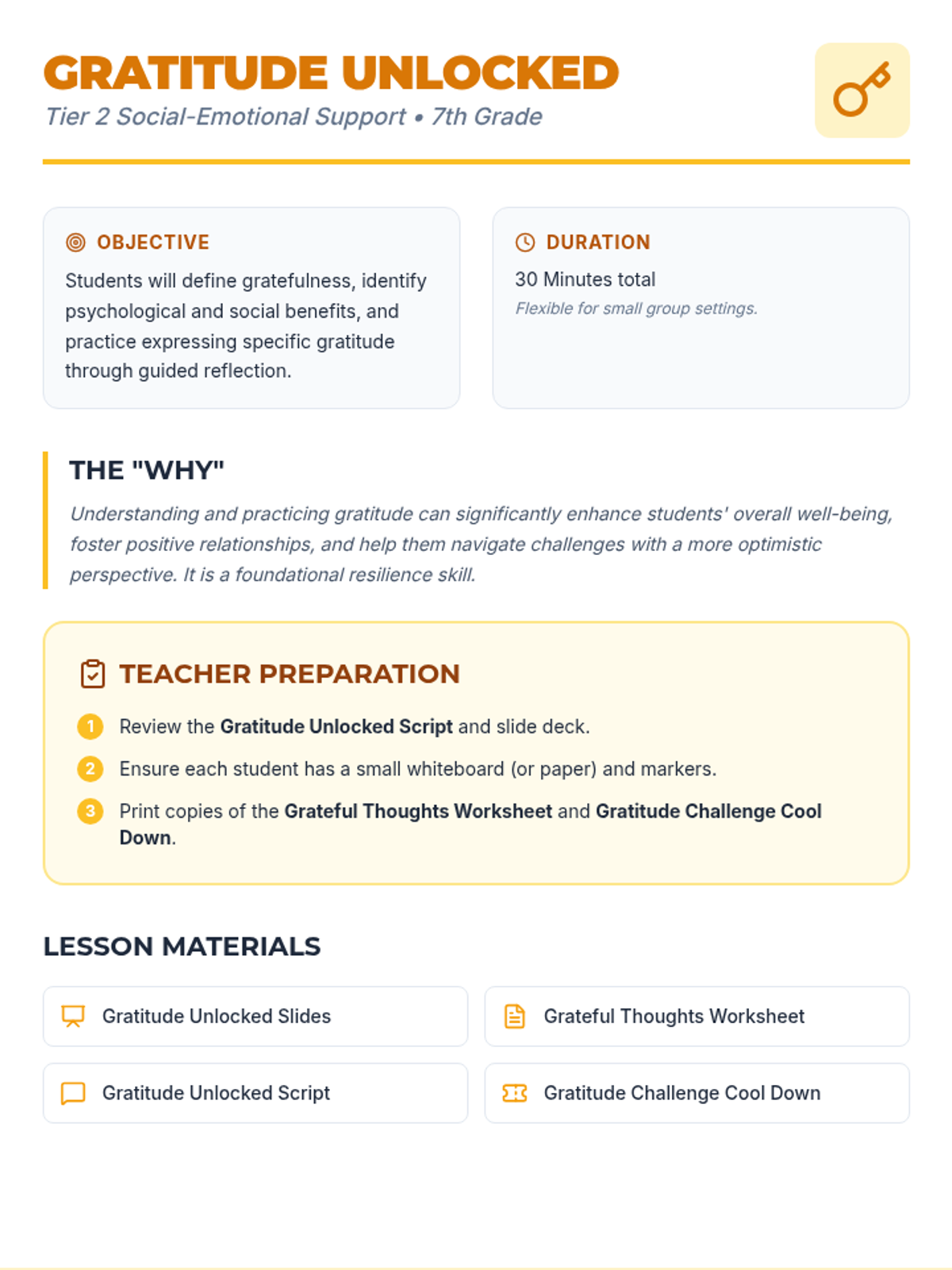 A 30-minute Tier 2 group lesson for 7th-grade students focused on defining gratitude, exploring its psychological and social benefits, and practicing specific expressions of thankfulness.