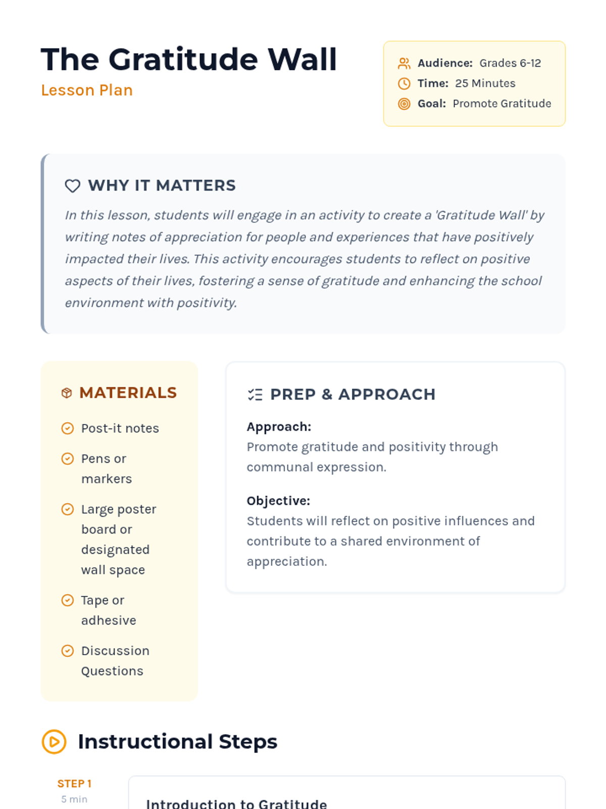 A lesson where students reflect on positive influences and create a communal 'Gratitude Wall' to foster appreciation and school-wide positivity.