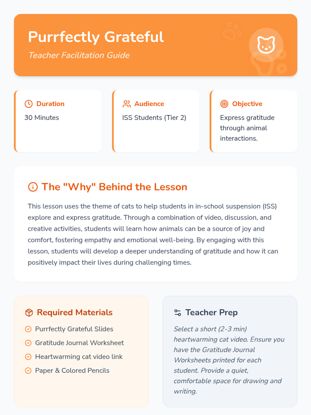 A Tier 2 social-emotional learning lesson for students in ISS, using the comforting theme of cats to explore and practice gratitude. Students reflect on the joy animals bring and how to cultivate a grateful mindset.