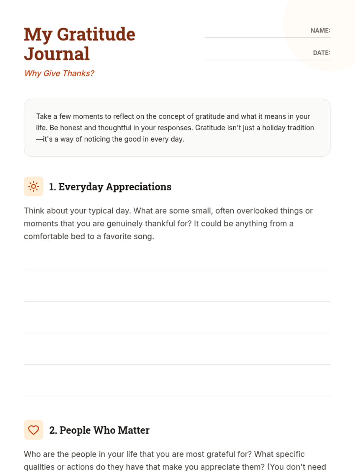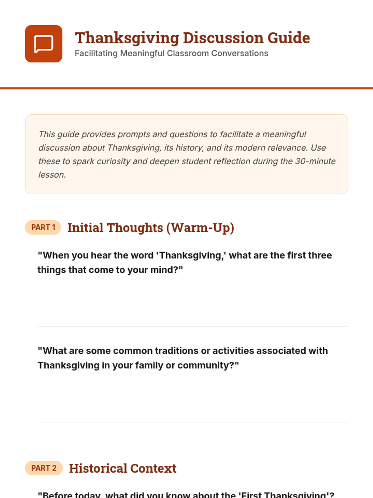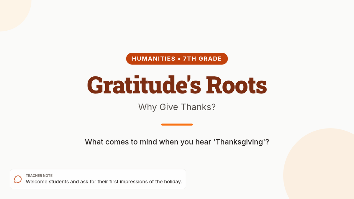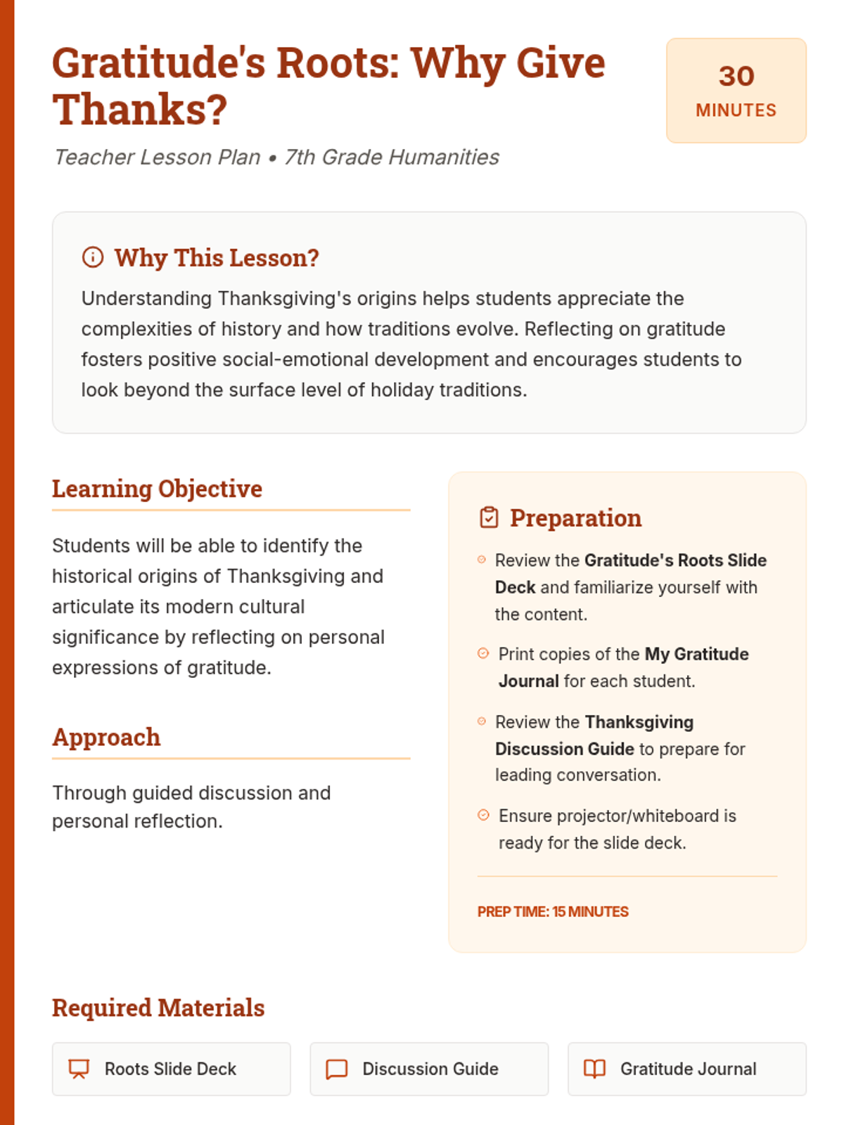 This 30-minute lesson for 7th-grade students explores the historical origins of Thanksgiving and the Wampanoag people's role, connecting historical gratitude to modern personal reflection. Students will examine the holiday's evolution from a 1621 harvest feast to a national holiday and participate in guided journaling.