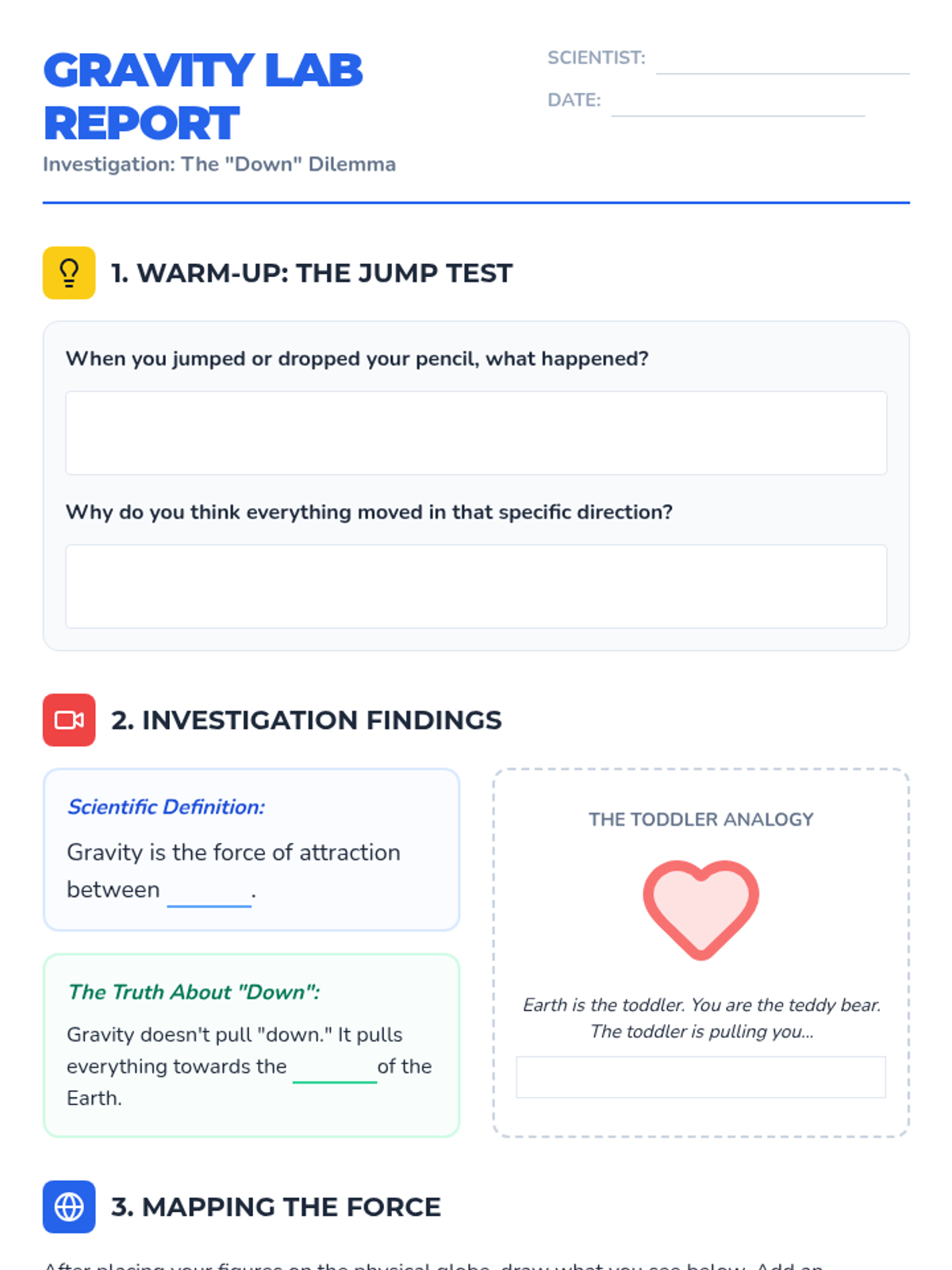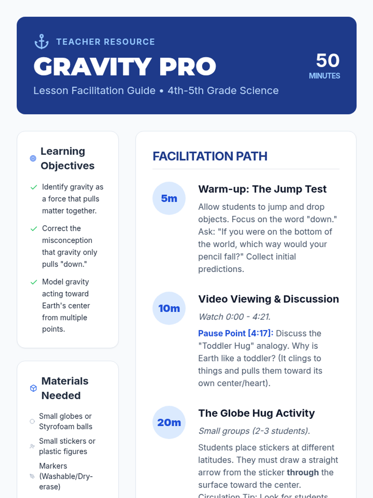 A lesson for 4th-5th graders exploring the concept that gravity pulls objects toward the Earth's center. Includes a physical activity with globes, a video investigation, and a drawing-based exit ticket.